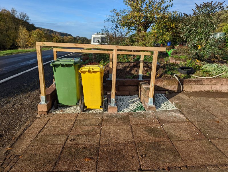 Sieht irgendwie schief aus, aber die Querbalken sollten gerade sein. Die Mülltonen stehen schon mal Probe.