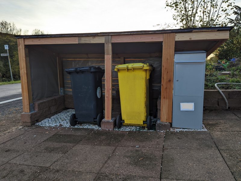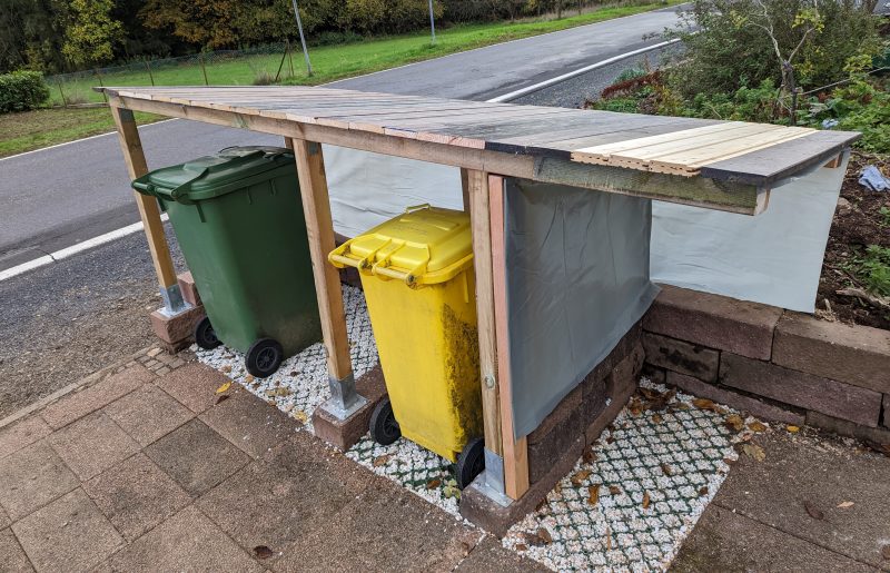 Die alte Müllbox steht an der Garageneinfahrt an der Straße und hat mit einbetonierten Holzpfosten 25 Jahre gehalten. Jetzt sind zwei der Pfosten soweit abgefault, dass eine Neukonstruktion her muss.