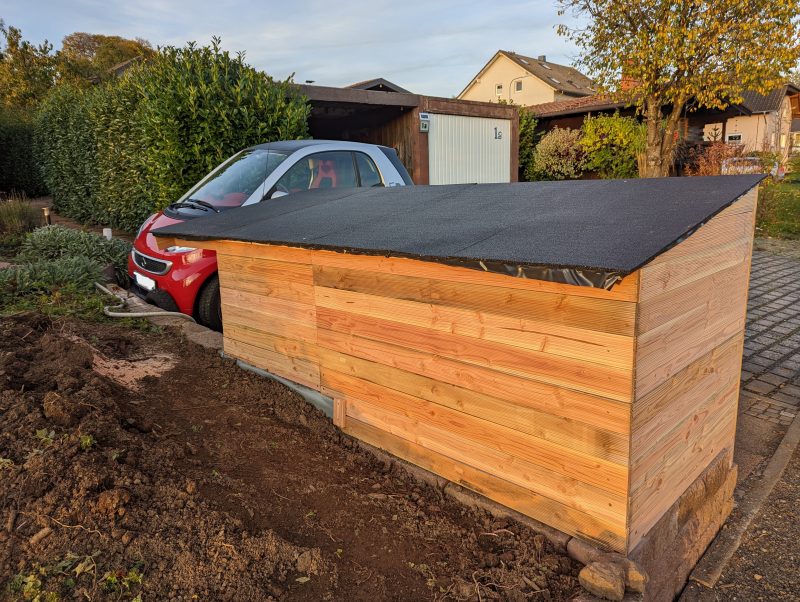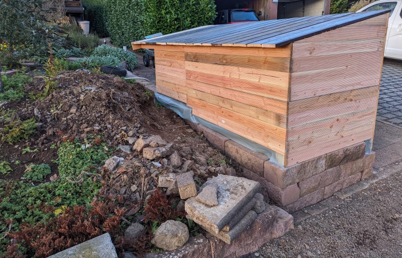 Vor auch noch ein paar Verkleidungsbrettchen. Der Überstand gibt dem Briefkasten ein neues Plätzchen, der war im Carport neben dem Fahrzeug nur schwer zu befüllen.