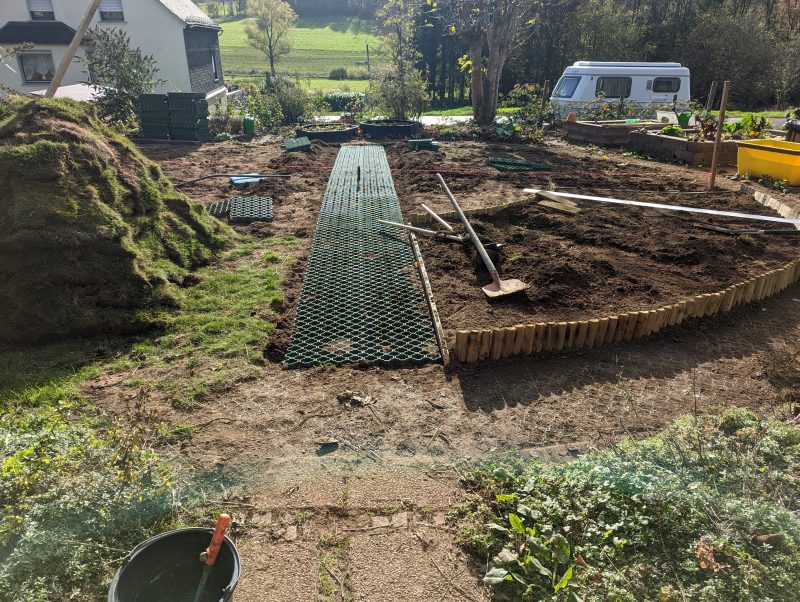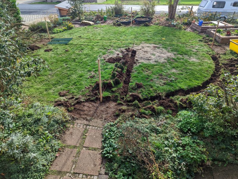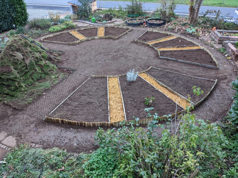 Somit entstand nach und nach der Gedanke, dass die Rasenfläche nicht erneuert sondern anstatt dessen neue Gemüsebeete angelegt werden sollten. Wichtig war dabei aber, die Kreisform zu erhalten. Zum Glück war der Oktober 2022 warm und vor allem trocken, so dass die schweren Arbeiten überhaupt bewältigt werden konnten.