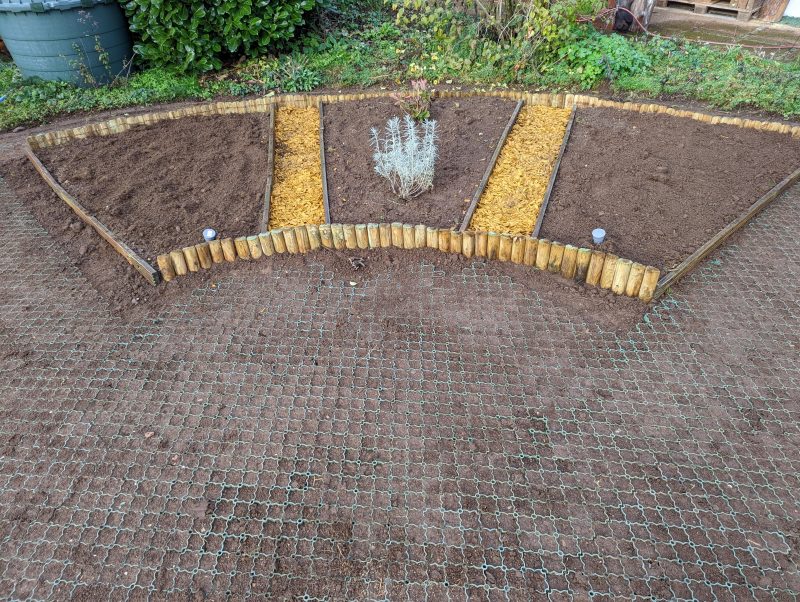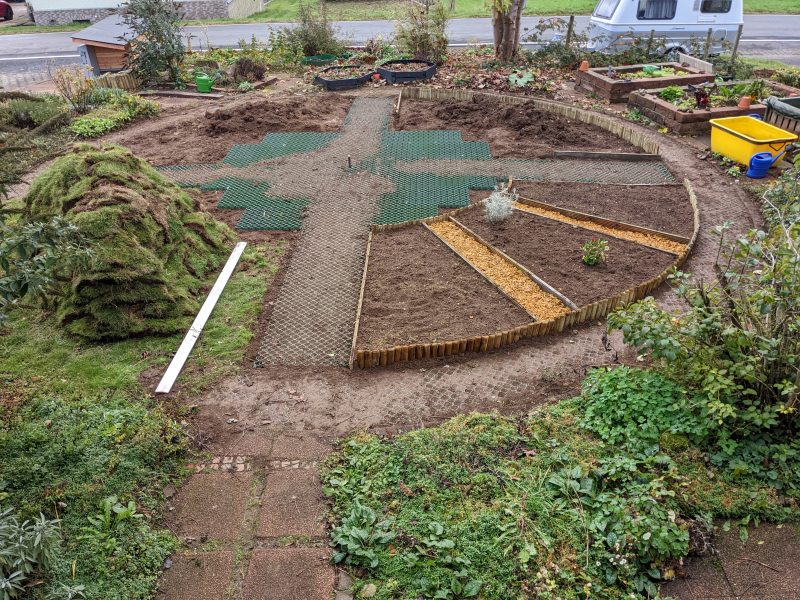Die einzelnen Beete sollten durch ein Wegkreuz unterteilt werden. Die wurden wieder mit neuen Rasengitterwaben belegt. Dies auch zum Schutz gegen das Untergraben des Maulwurfs.