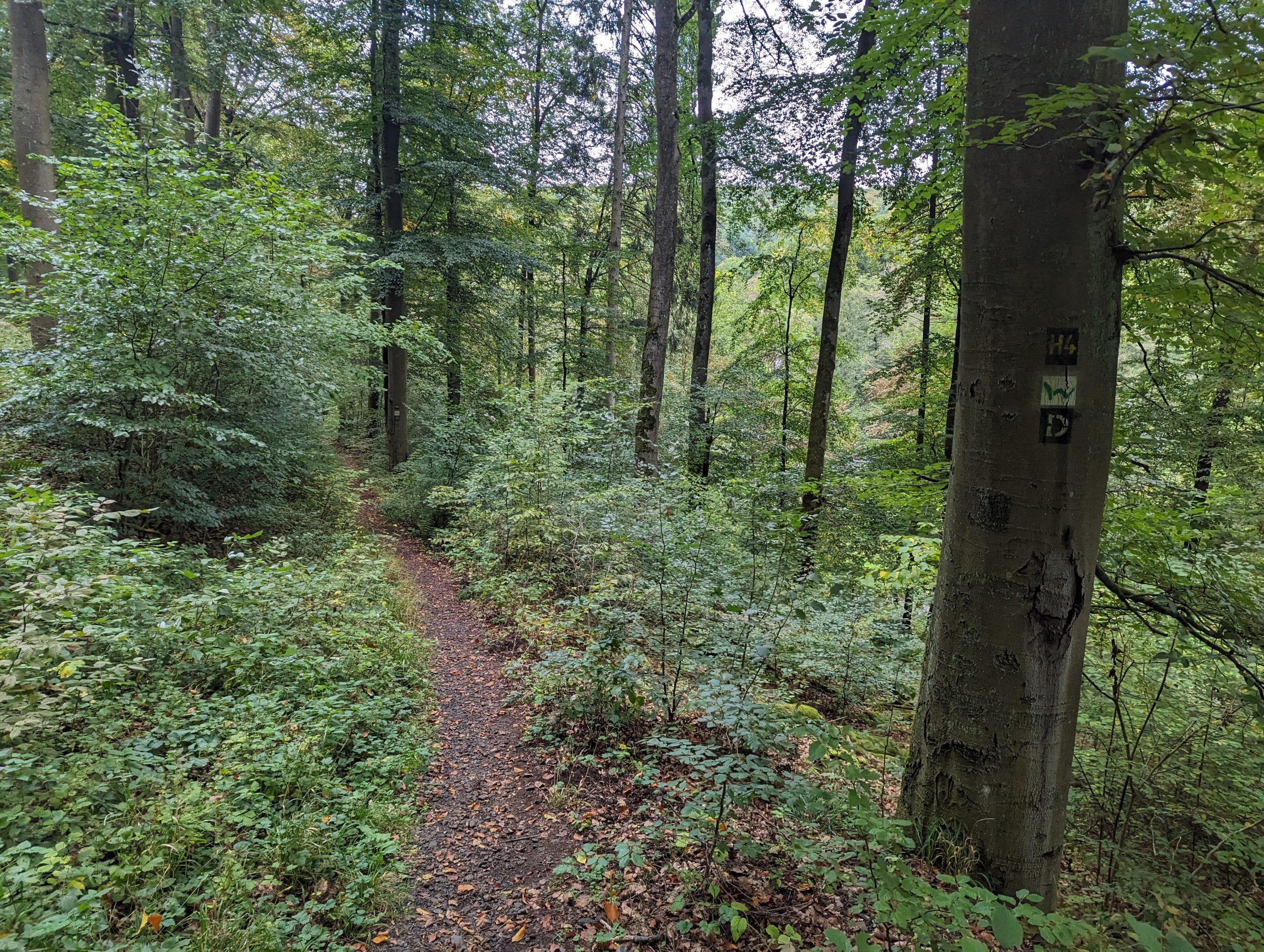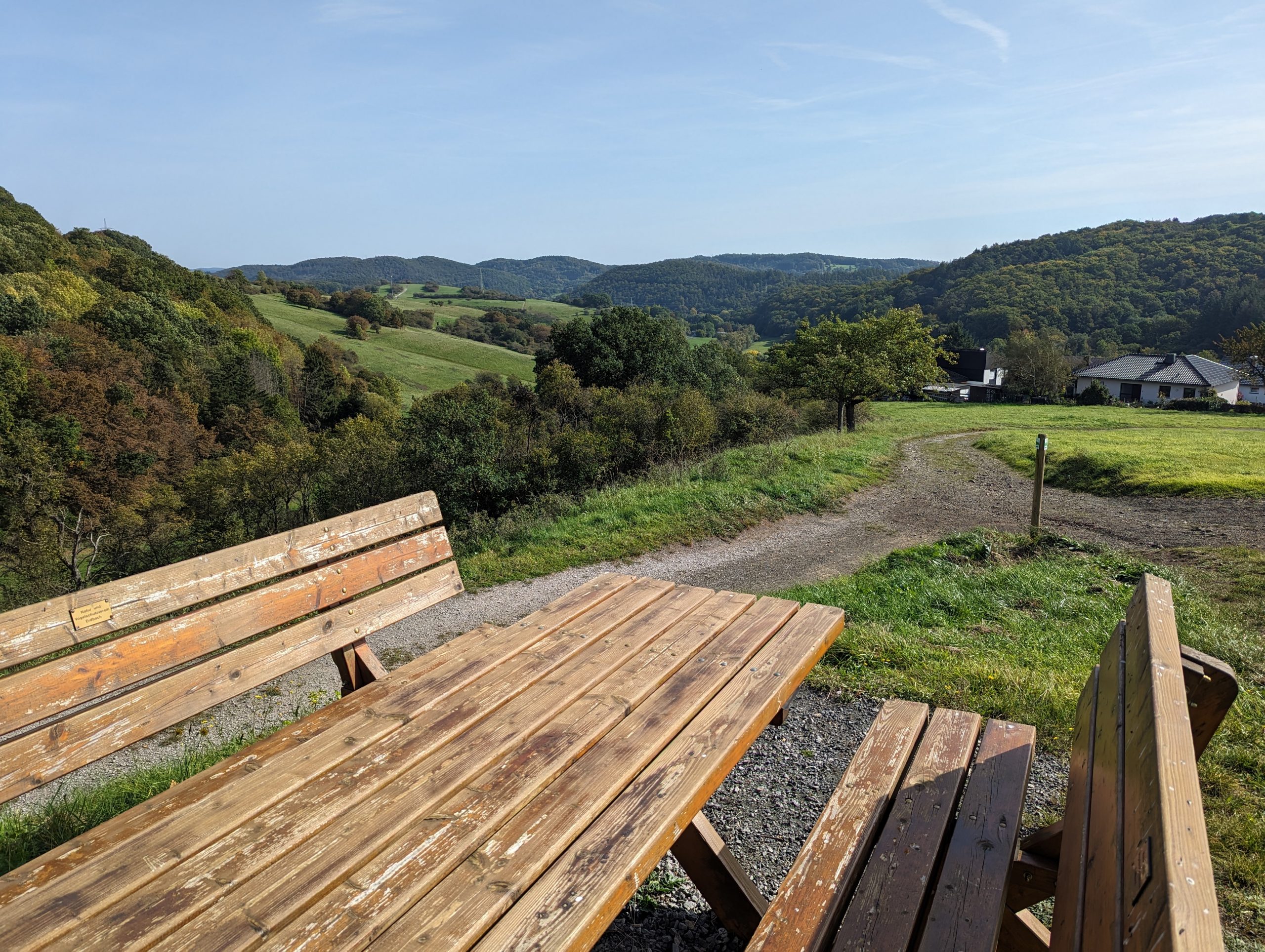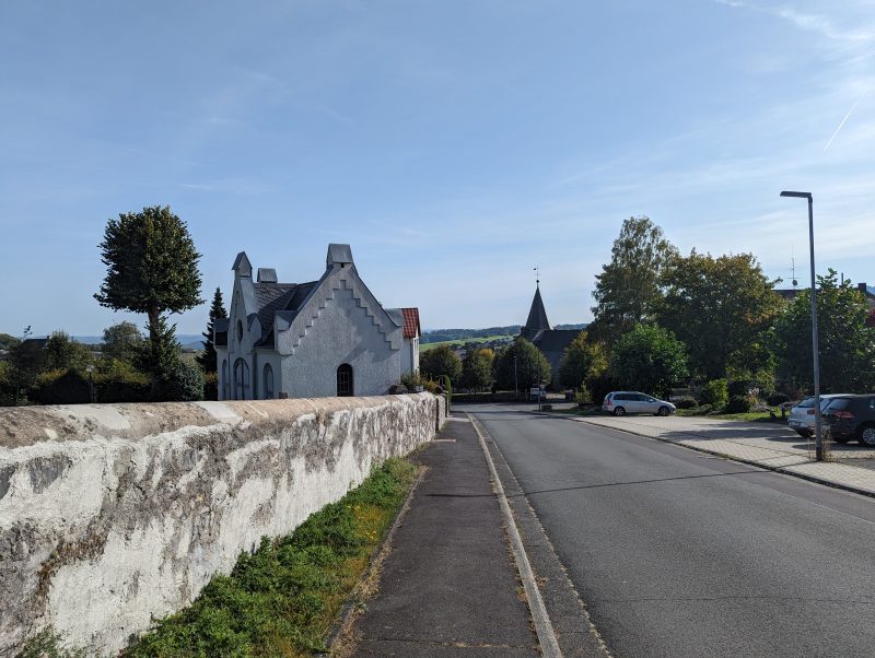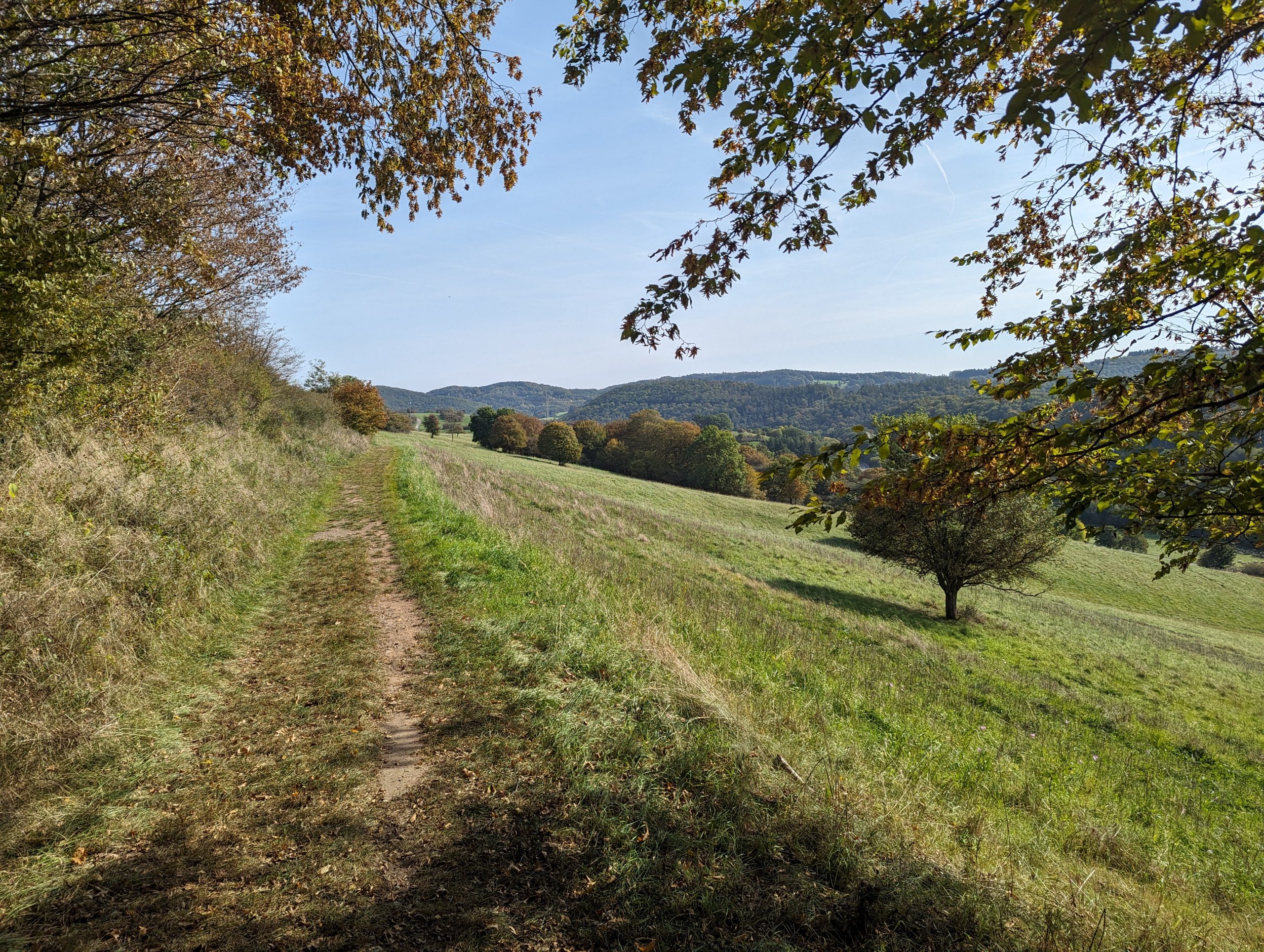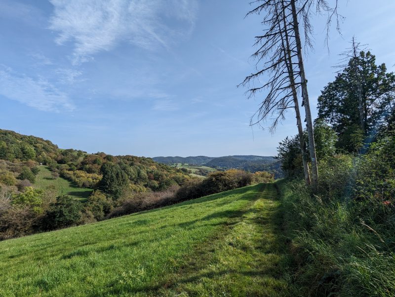 Zwei Tage später ist es der definitiv letzte Sommertag. Vom Parkplatz an der Kirche mit altem Friedhofswall geht es auf eine etwas kürzere Etappe. Wieder kreuzt der Wanderweg das Erdbachtal und scheffelt so seine versprochenen Höhenmeter. Der weg ist teilweise wiesig und uneben zu laufen, das rechte Knie kommentiert das mit ein paar stehenden Schmerzsignalen. Sonst ist es aber eine aussichtsreiche Sonnenetappe ohne Sonnencreme und ohne Mückenstichgefahr. Schöner kann Sommer eigentlich nicht sein.