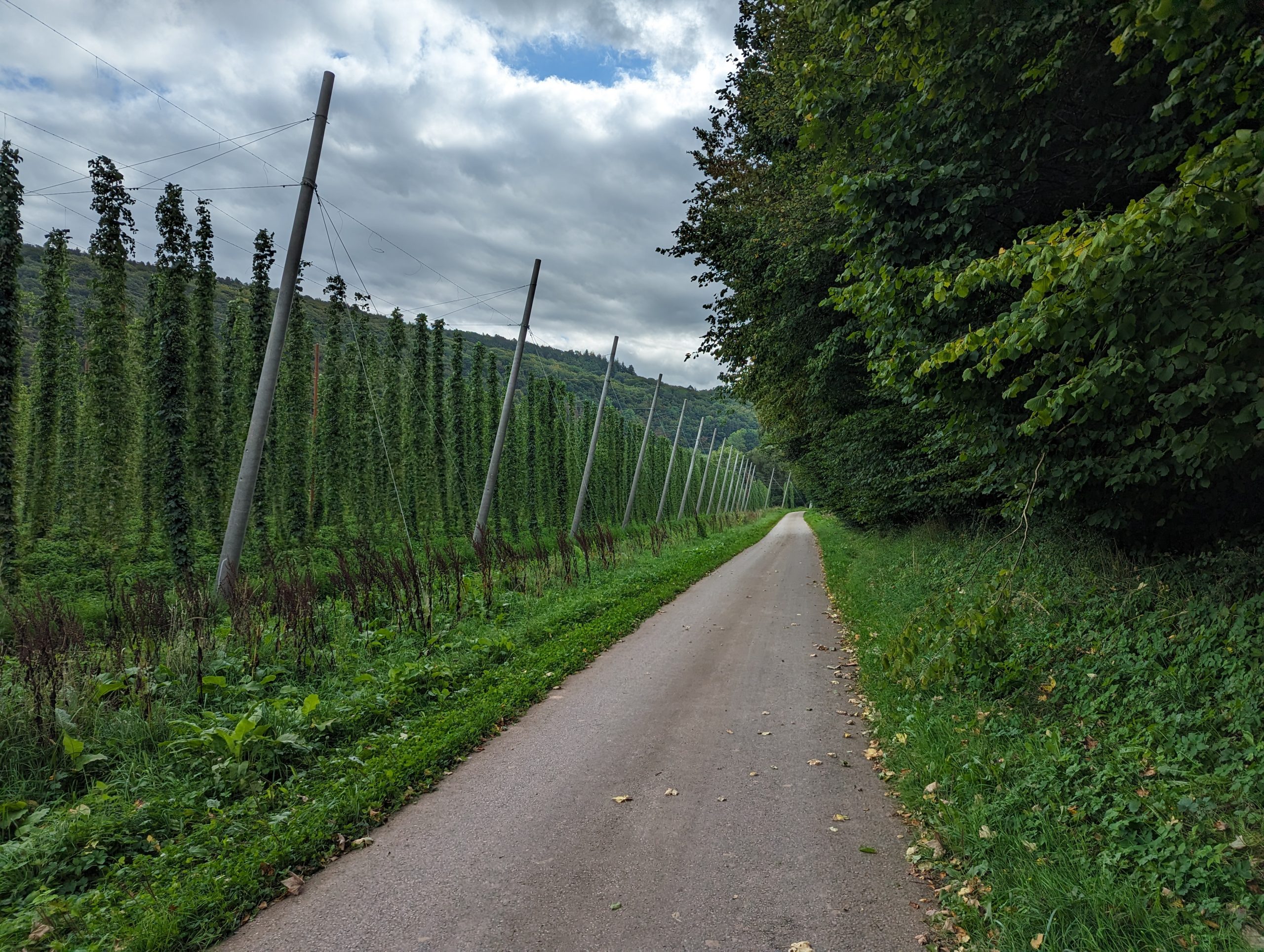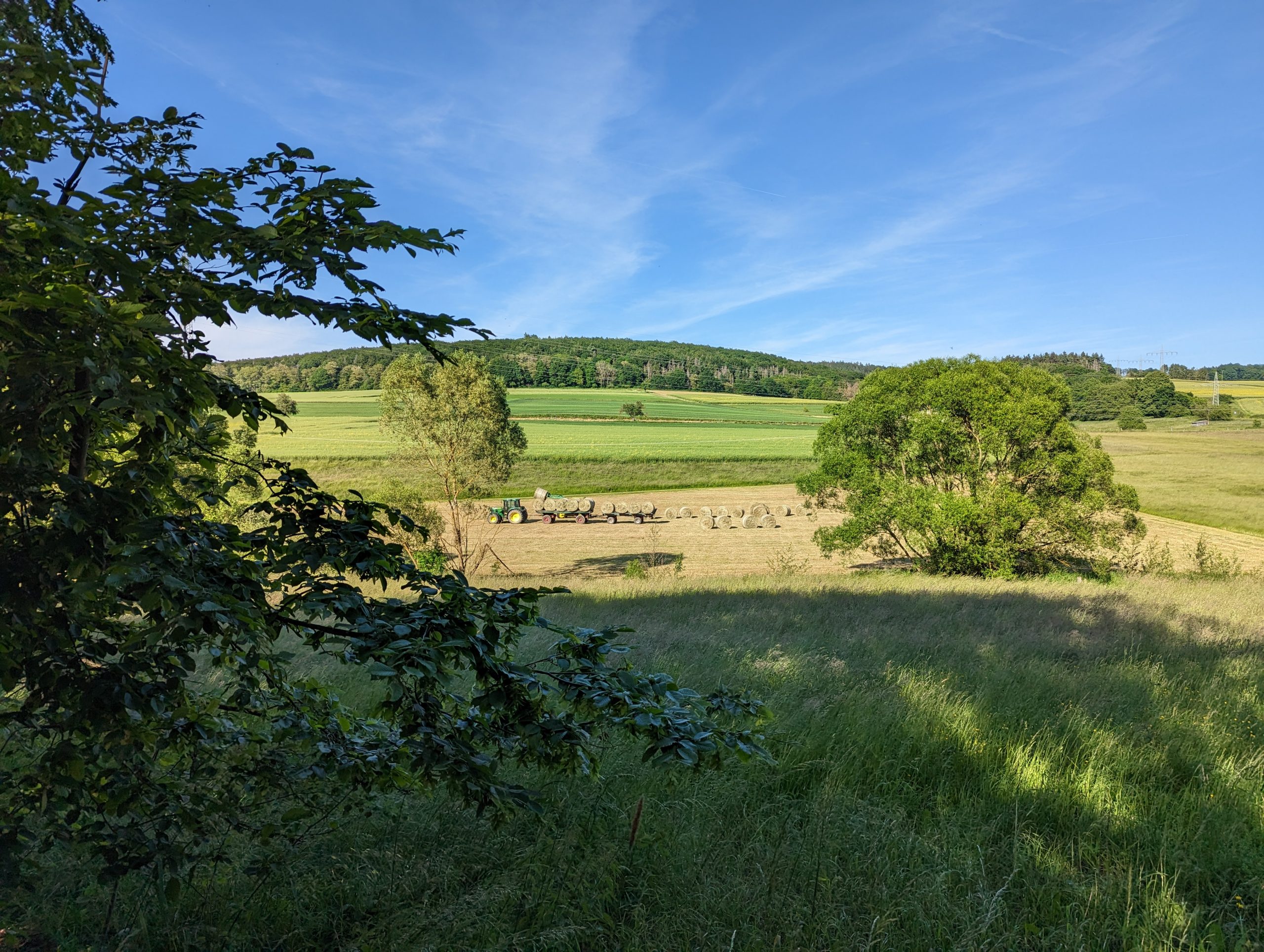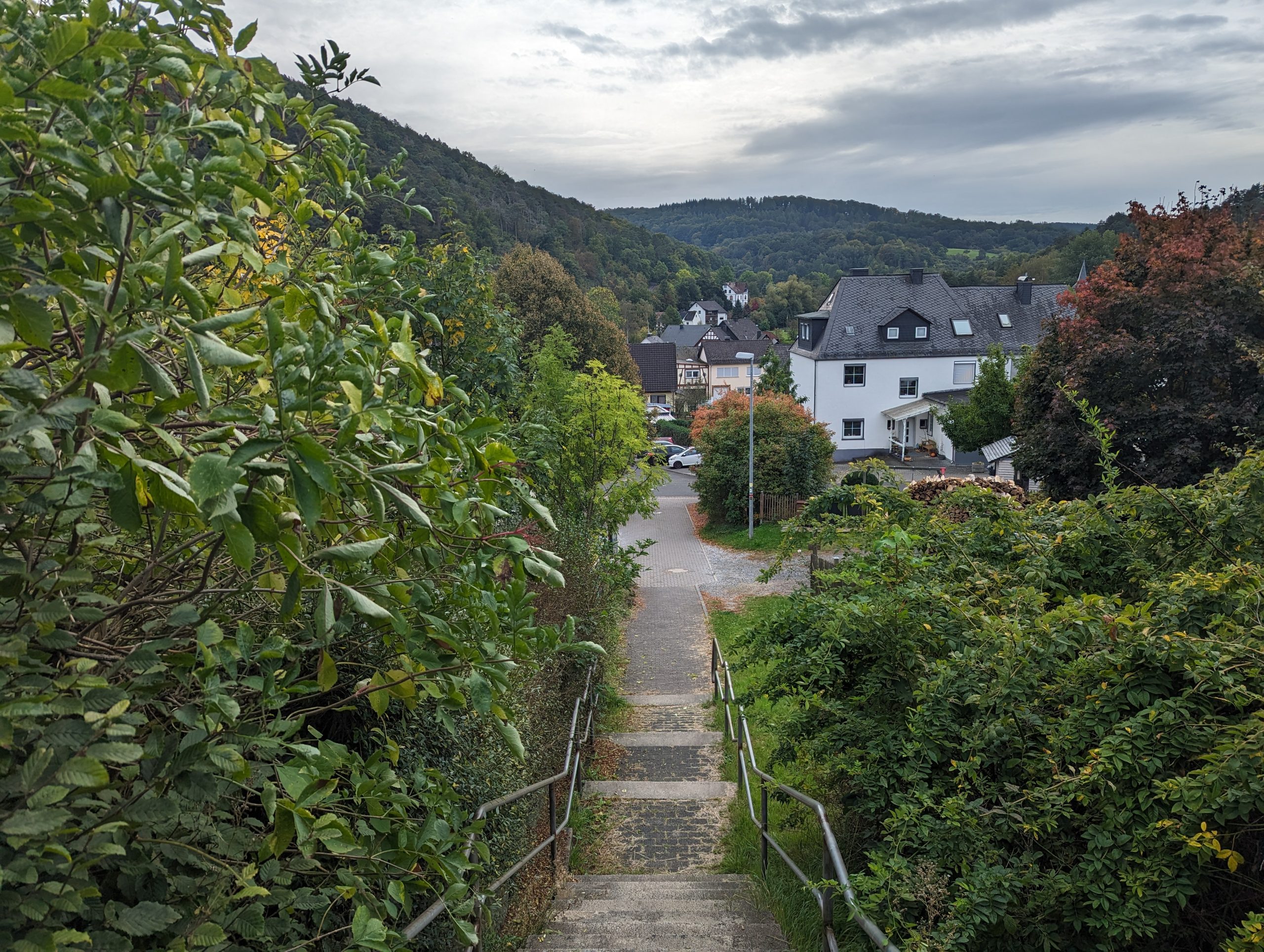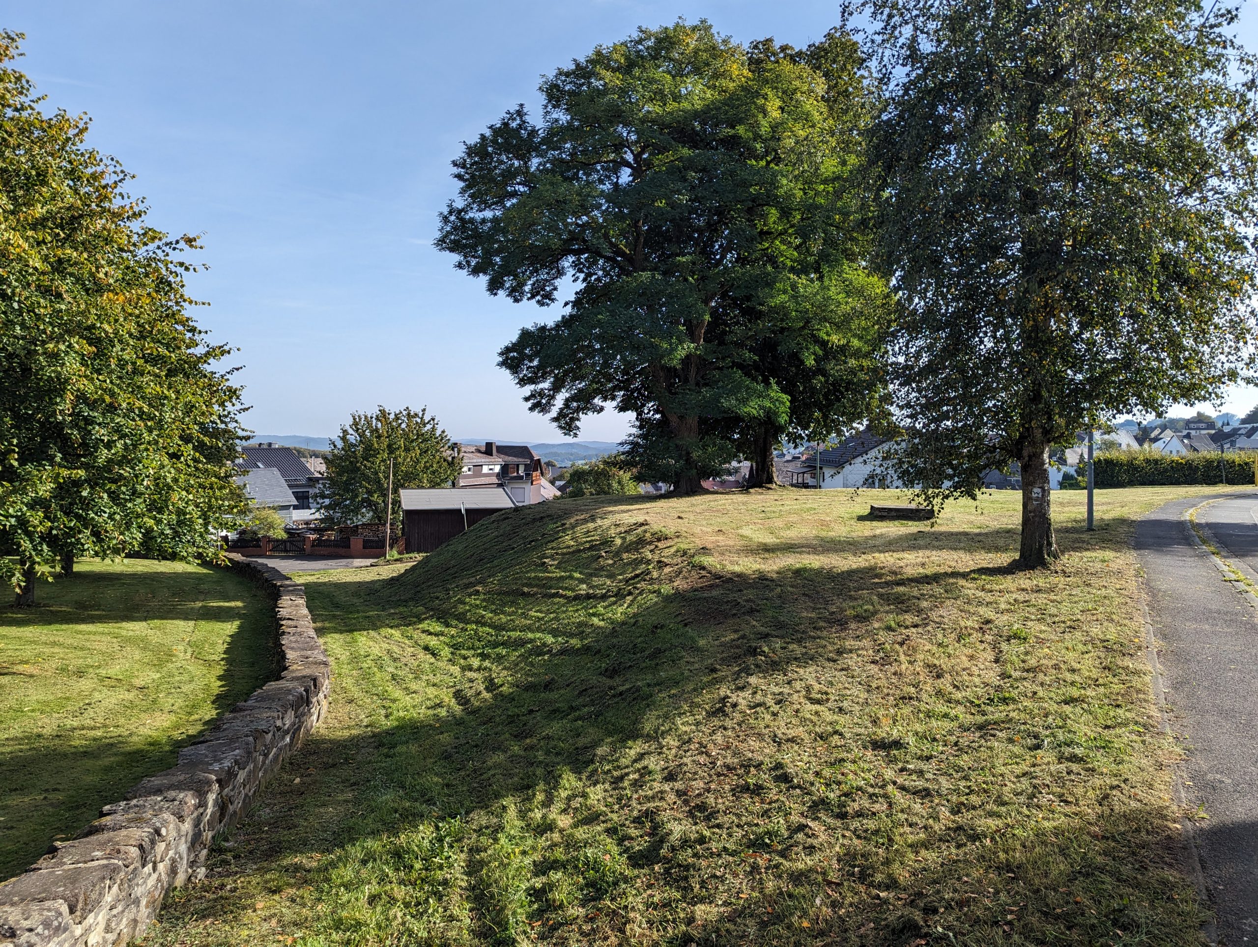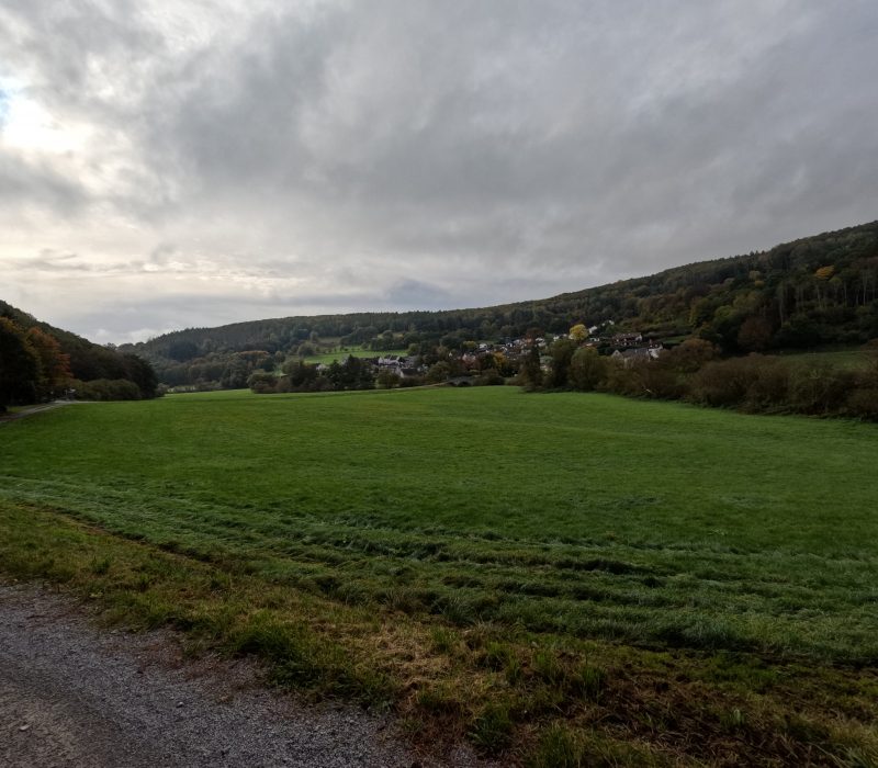 Zwei Tage später ist es der definitiv letzte Sommertag. Vom Parkplatz an der Kirche mit altem Friedhofswall geht es auf eine etwas kürzere Etappe. Wieder kreuzt der Wanderweg das Erdbachtal und scheffelt so seine versprochenen Höhenmeter. Der weg ist teilweise wiesig und uneben zu laufen, das rechte Knie kommentiert das mit ein paar stehenden Schmerzsignalen. Sonst ist es aber eine aussichtsreiche Sonnenetappe ohne Sonnencreme und ohne Mückenstichgefahr. Schöner kann Sommer eigentlich nicht sein.