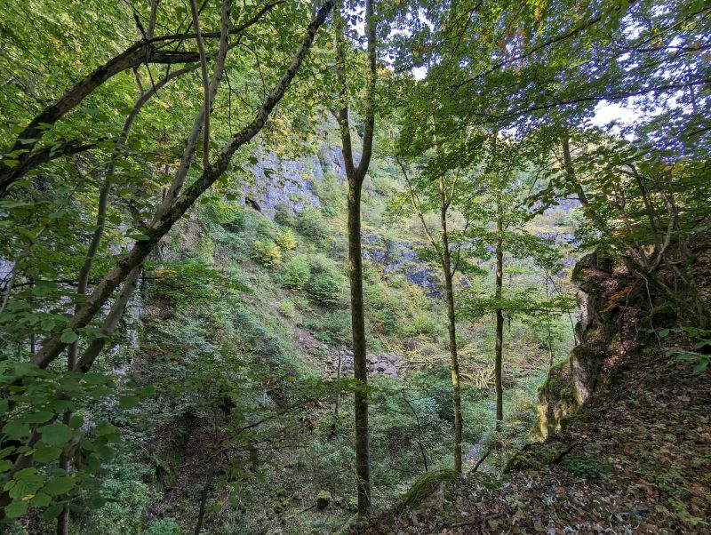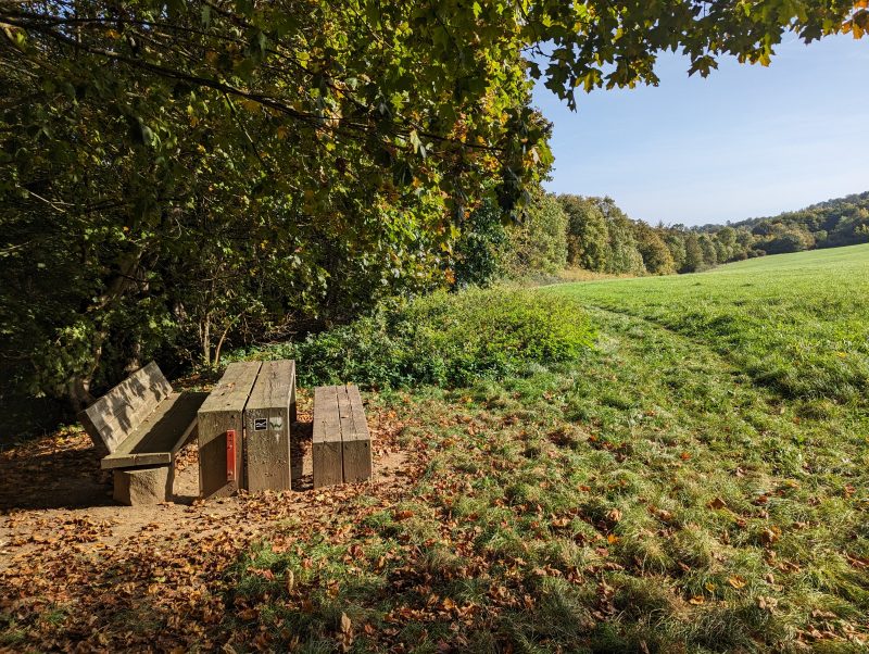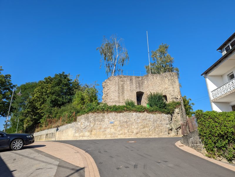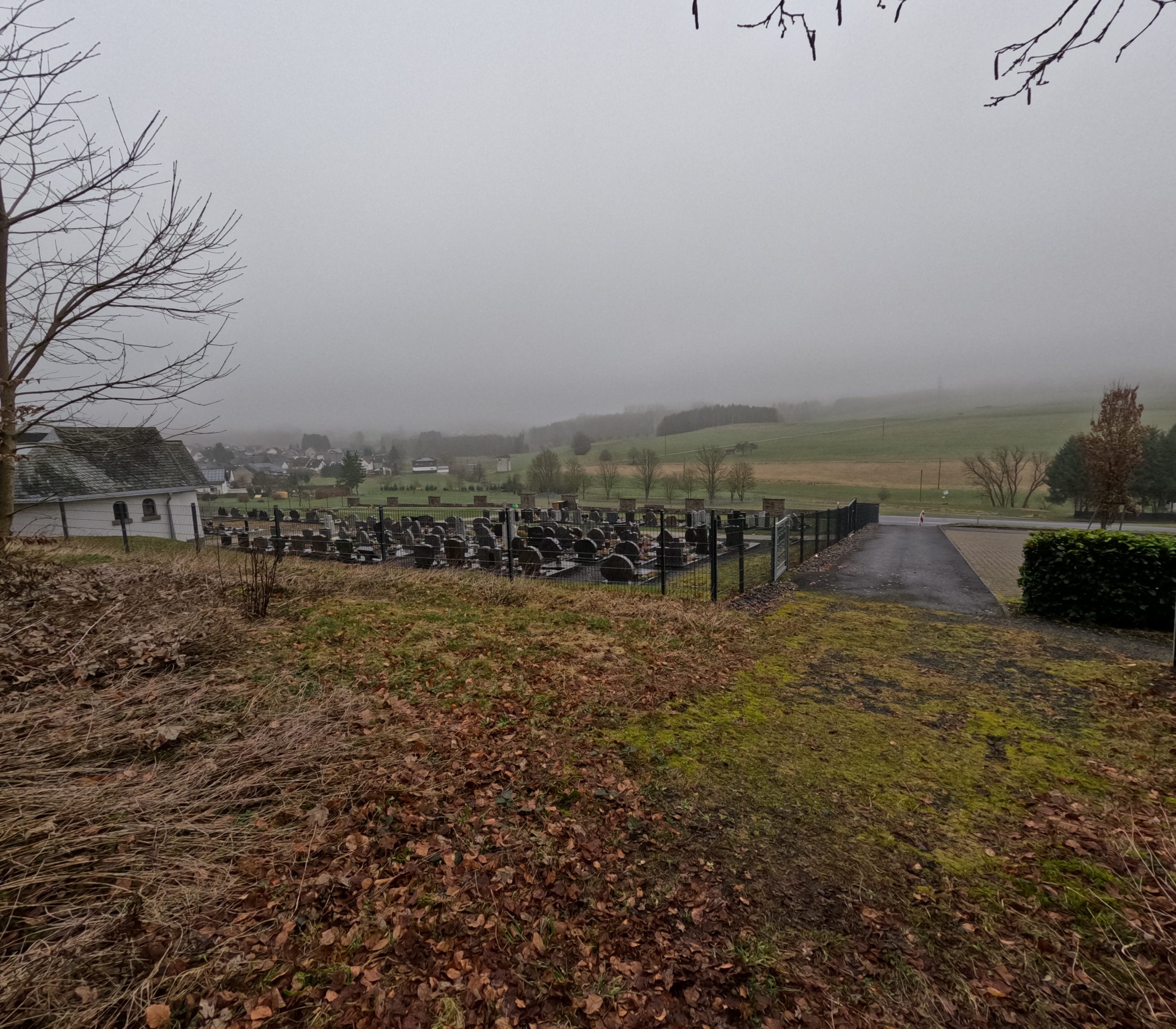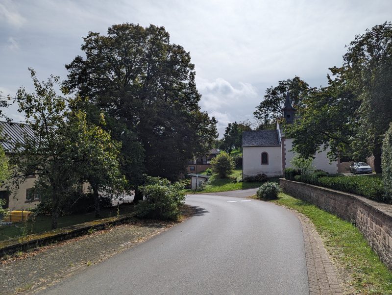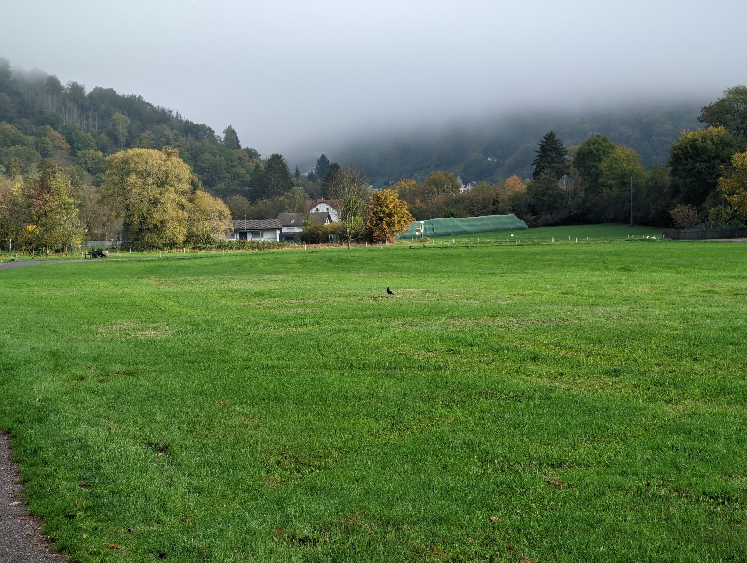 Zwei Tage später ist es der definitiv letzte Sommertag. Vom Parkplatz an der Kirche mit altem Friedhofswall geht es auf eine etwas kürzere Etappe. Wieder kreuzt der Wanderweg das Erdbachtal und scheffelt so seine versprochenen Höhenmeter. Der weg ist teilweise wiesig und uneben zu laufen, das rechte Knie kommentiert das mit ein paar stehenden Schmerzsignalen. Sonst ist es aber eine aussichtsreiche Sonnenetappe ohne Sonnencreme und ohne Mückenstichgefahr. Schöner kann Sommer eigentlich nicht sein.