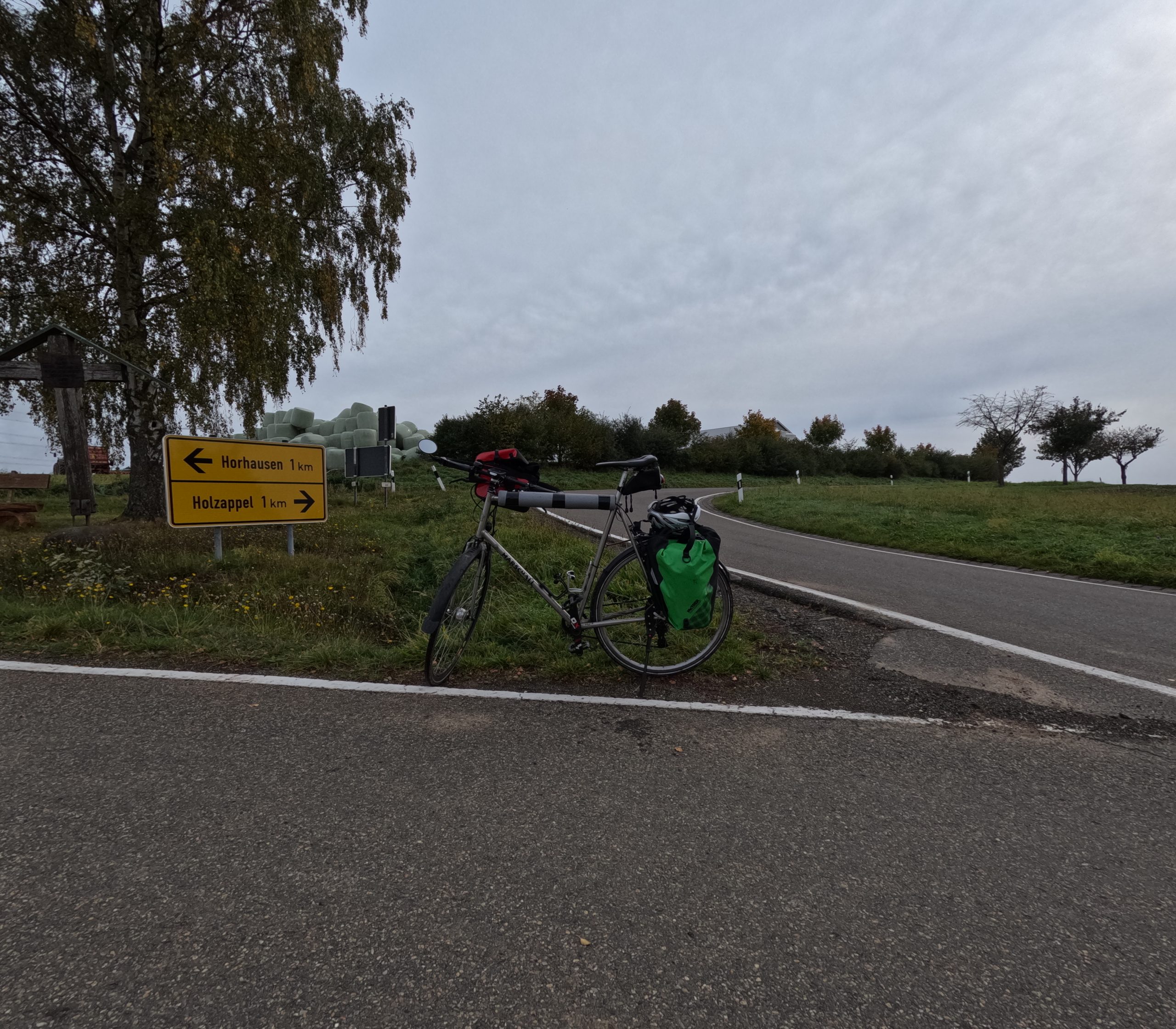 Die Etappe 11 wird als Radanbinderunde umgesetzt. Erst über die Hügel und am Nistertalrand zum Höhenrücken, auf dem die B256 verläuft. Dann über Felder und Waldgebiete zum Parkplatz am Friedhof Hilgenroth. Daneben im Dickicht steht das Rad an einem Baum und wartet auf die Abholung.