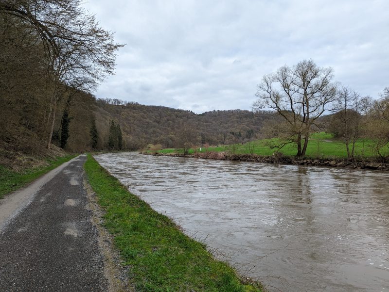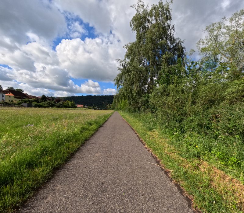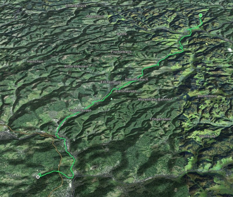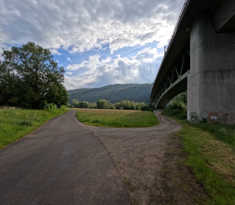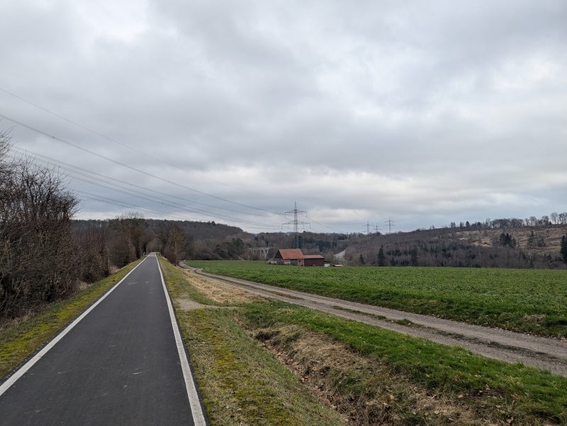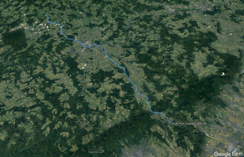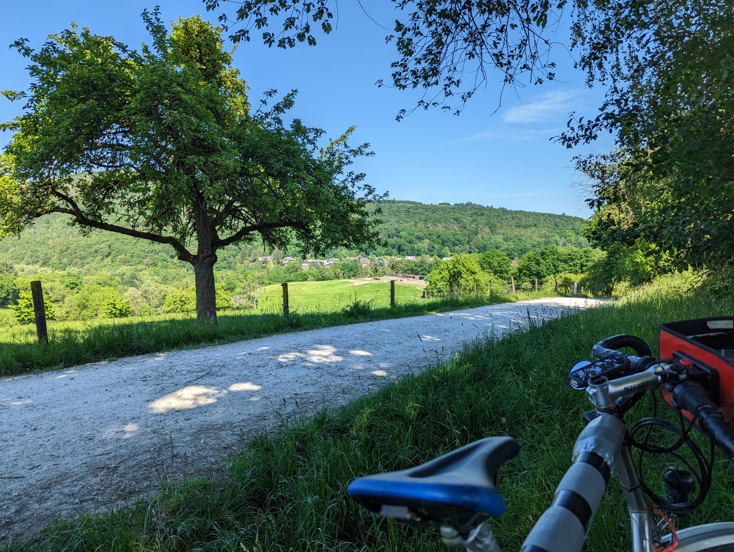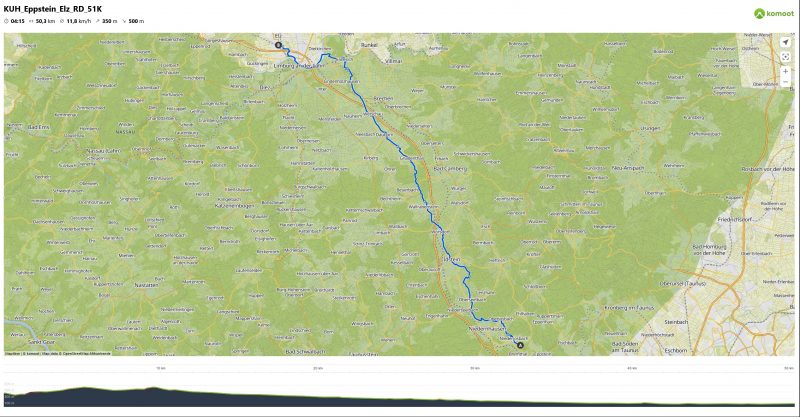 Die Strecke bestand aus endlosen Ortsdurchfahrten, aber auch aus Talpassagen und ehemaligen Bahntrassen. Mit 970/840 hm war die Strecke auch nicht gerade flach. So etwa halbe halbe. Ob sich daraus eine KuhDo Strecke mit Übernachtung basteln lässt muss noch näher analysiert werden. Auf dem hier dokumentierten Hinweg hat ordentlicher Rückenwind geholfen. Der Akku (Pendix 500) hatte noch 33 Prozent. Auf dem Rückweg wurde zur Akkuschonung an den steilen Aufstiegen geschoben und auf den ersten 30 Kilometern auf Elektrohilfe verzichtet. Daher war der Rückweg auch wegen des Gegenwindes trotz der geringeren Höhenmeter mit 12,4 km/h zu 13,8 km/h deutlich langsamer.