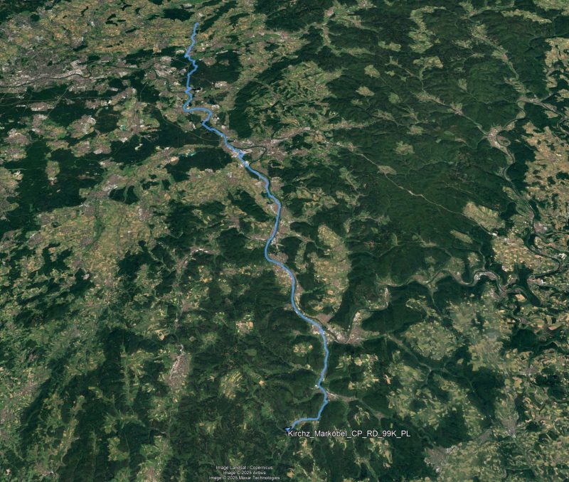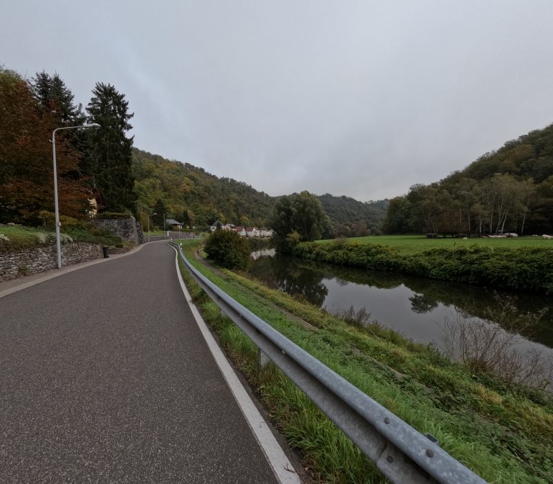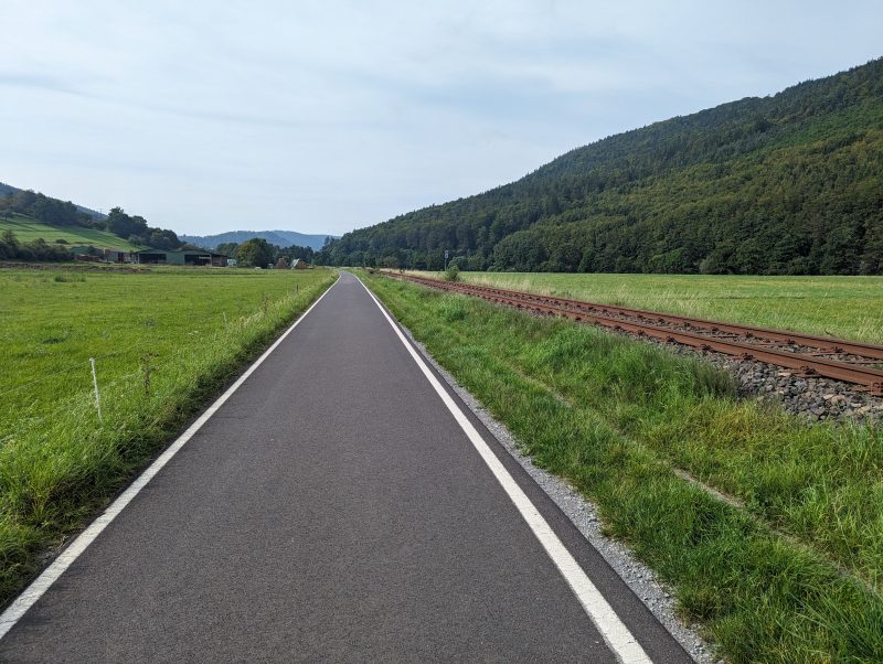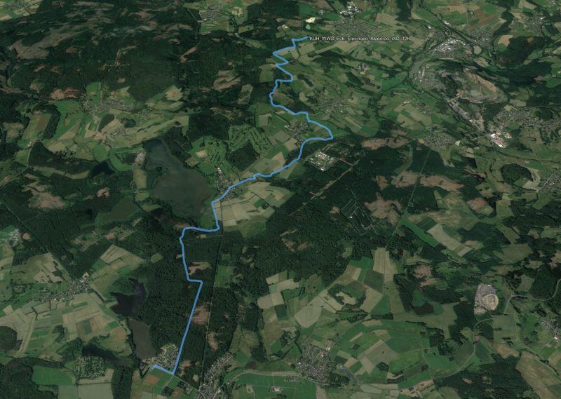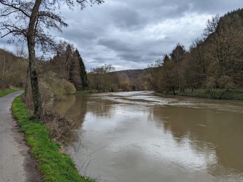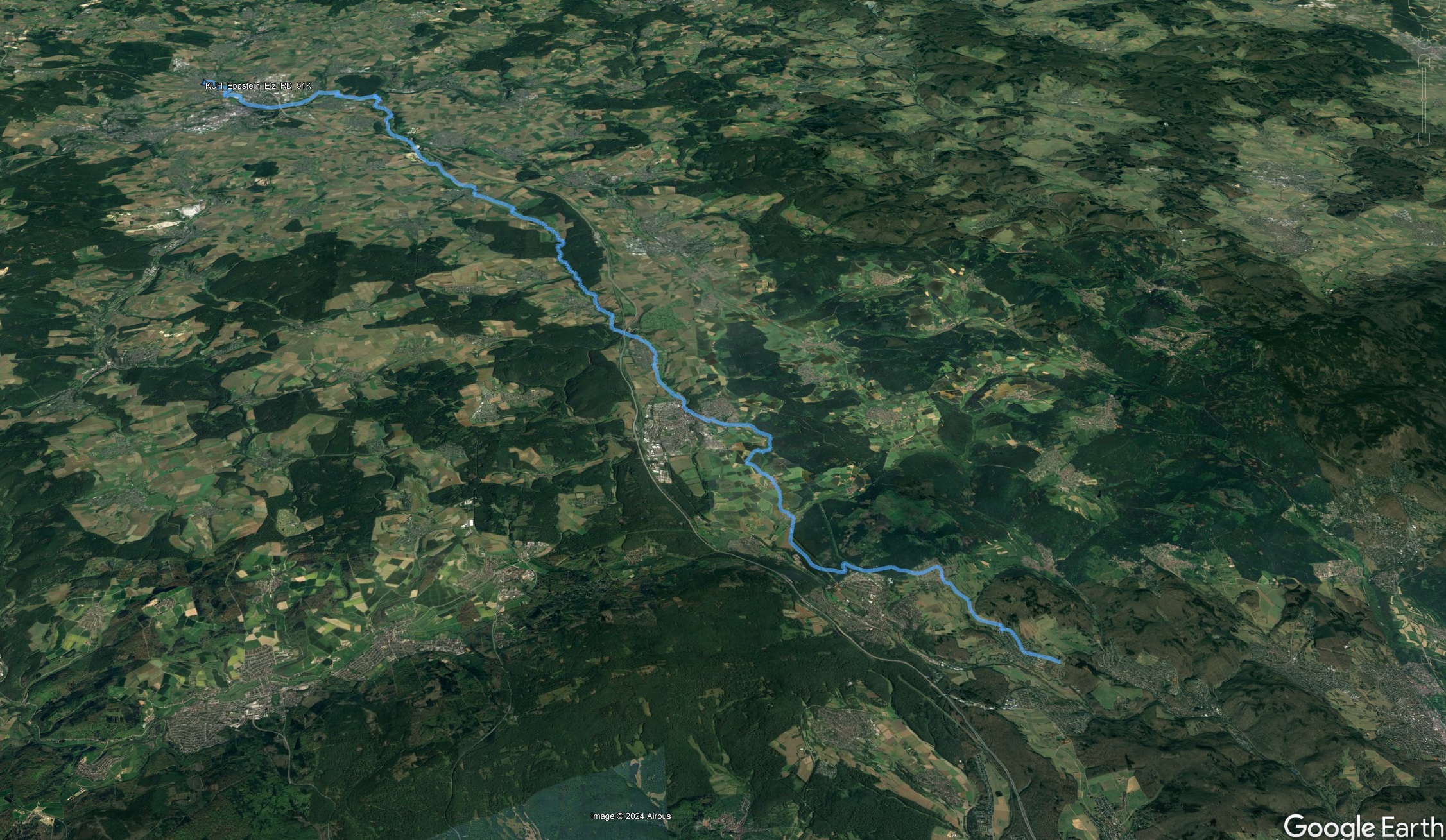 Die Strecke bestand aus endlosen Ortsdurchfahrten, aber auch aus Talpassagen und ehemaligen Bahntrassen. Mit 970/840 hm war die Strecke auch nicht gerade flach. So etwa halbe halbe. Ob sich daraus eine KuhDo Strecke mit Übernachtung basteln lässt muss noch näher analysiert werden. Auf dem hier dokumentierten Hinweg hat ordentlicher Rückenwind geholfen. Der Akku (Pendix 500) hatte noch 33 Prozent. Auf dem Rückweg wurde zur Akkuschonung an den steilen Aufstiegen geschoben und auf den ersten 30 Kilometern auf Elektrohilfe verzichtet. Daher war der Rückweg auch wegen des Gegenwindes trotz der geringeren Höhenmeter mit 12,4 km/h zu 13,8 km/h deutlich langsamer.