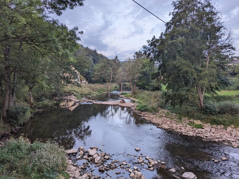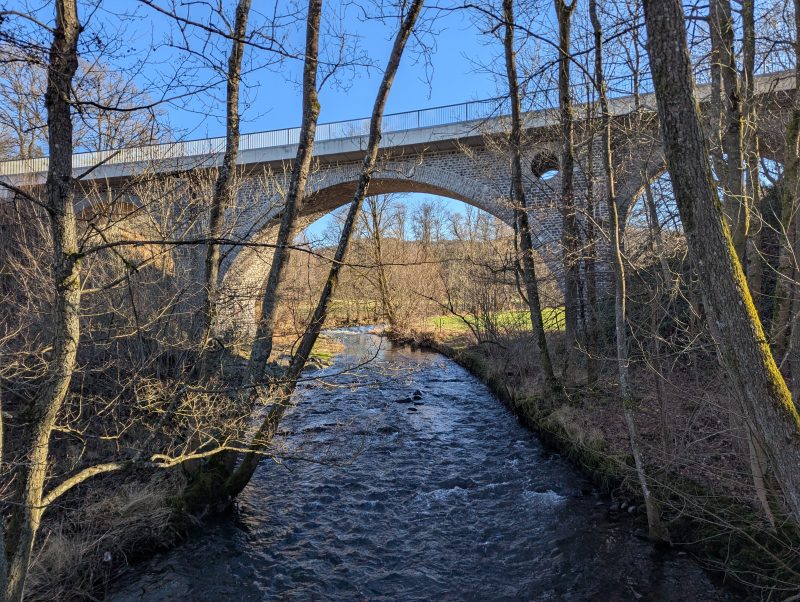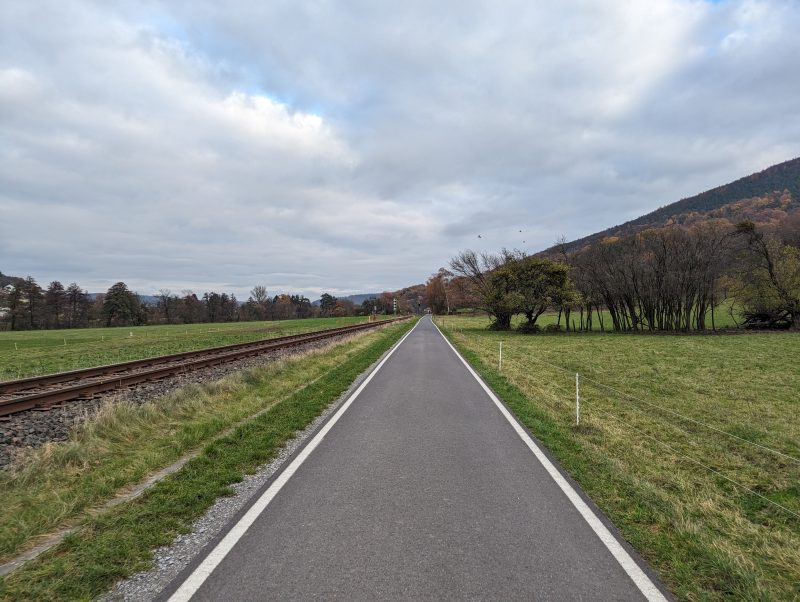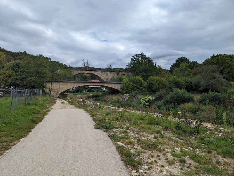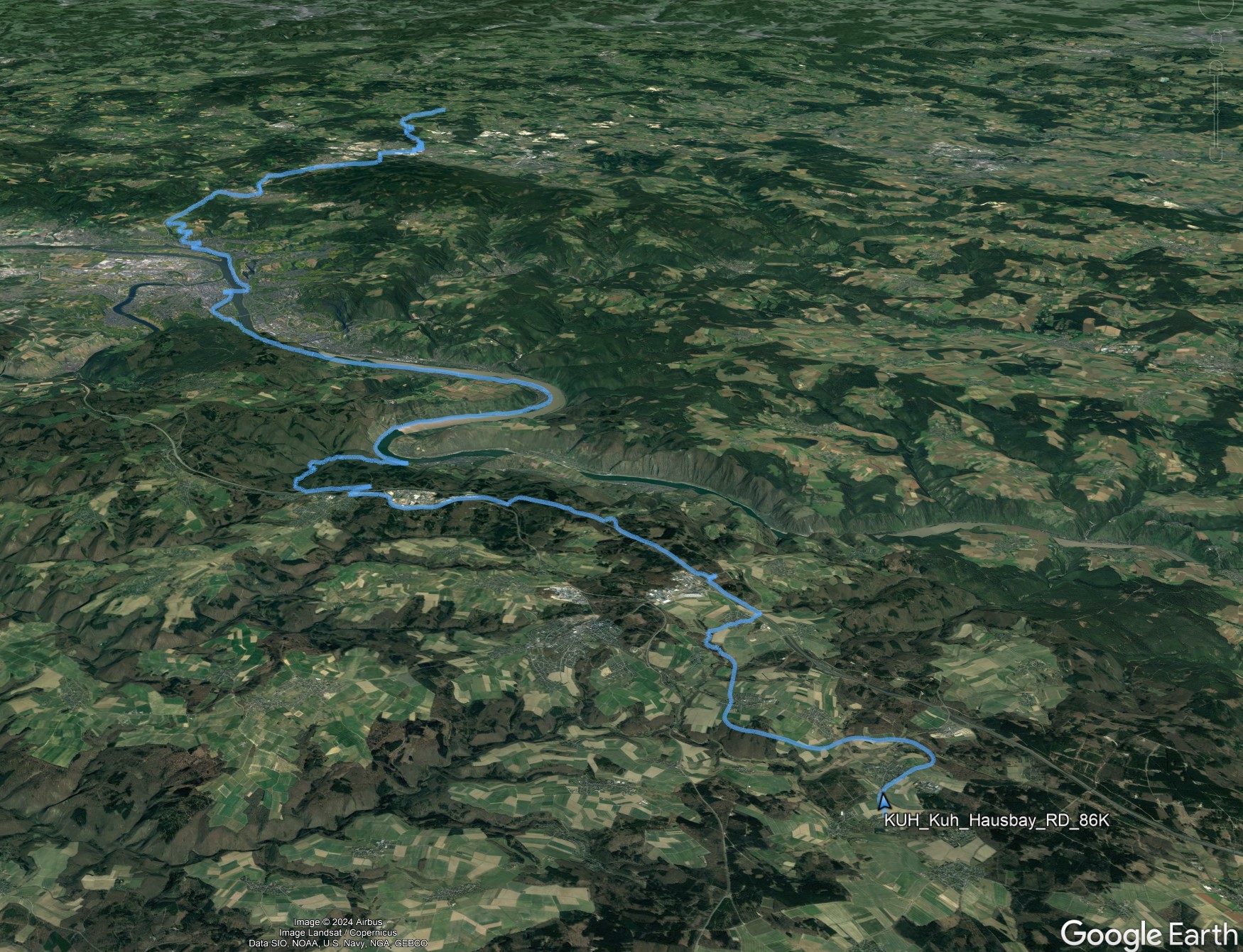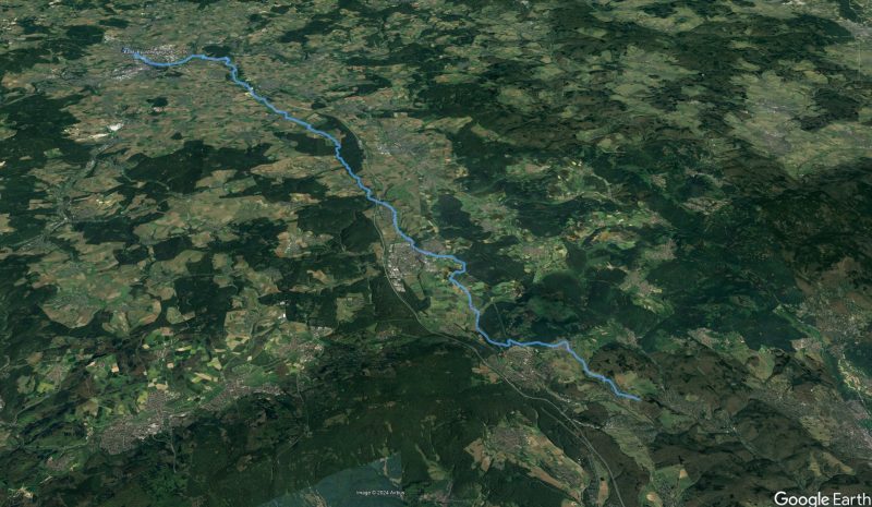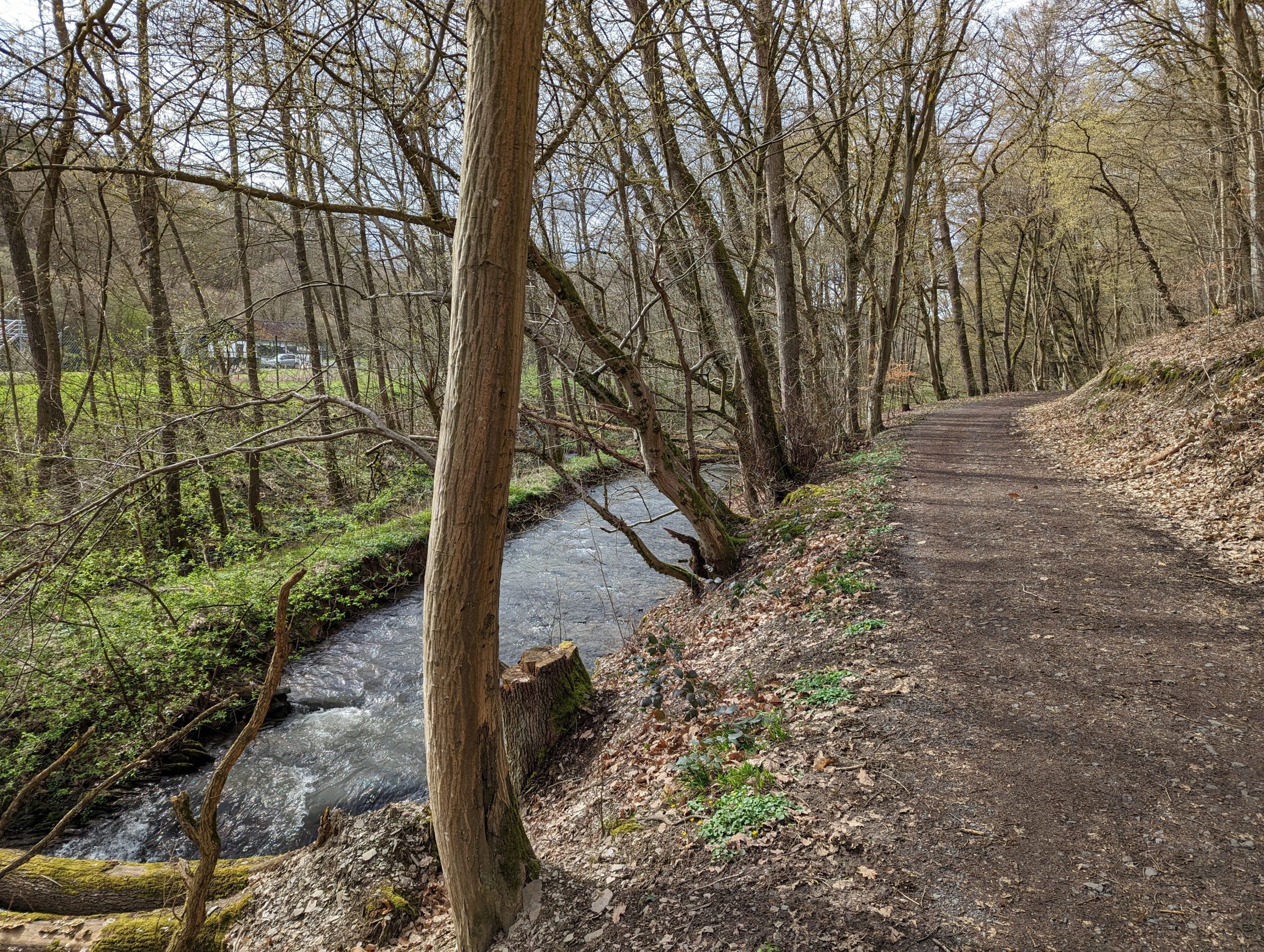 Die Strecke bestand aus endlosen Ortsdurchfahrten, aber auch aus Talpassagen und ehemaligen Bahntrassen. Mit 970/840 hm war die Strecke auch nicht gerade flach. So etwa halbe halbe. Ob sich daraus eine KuhDo Strecke mit Übernachtung basteln lässt muss noch näher analysiert werden. Auf dem hier dokumentierten Hinweg hat ordentlicher Rückenwind geholfen. Der Akku (Pendix 500) hatte noch 33 Prozent. Auf dem Rückweg wurde zur Akkuschonung an den steilen Aufstiegen geschoben und auf den ersten 30 Kilometern auf Elektrohilfe verzichtet. Daher war der Rückweg auch wegen des Gegenwindes trotz der geringeren Höhenmeter mit 12,4 km/h zu 13,8 km/h deutlich langsamer.