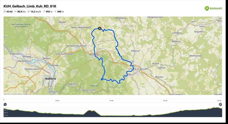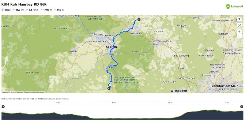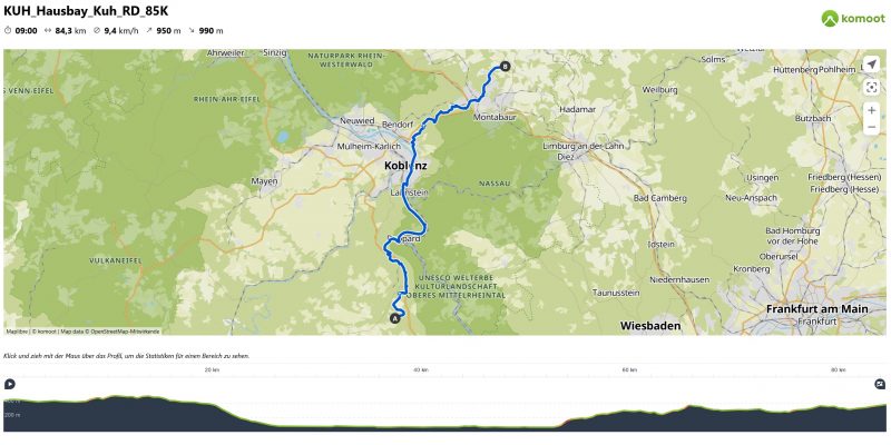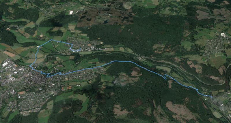 Also erst nach Bad Ems, dann ein Stück den Lahnradweg bis zur Sperrung in Laurenburg, der fiese Anstieg nach Scheid und dann zurück durch den unteren Westerwald auf dem Bergrücken parallel zum Gelbachtal.