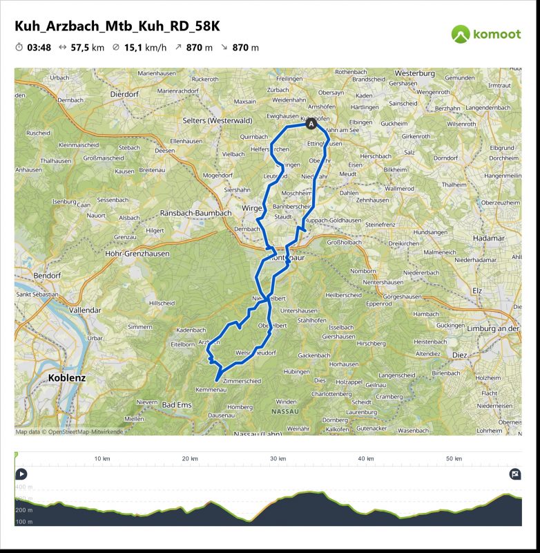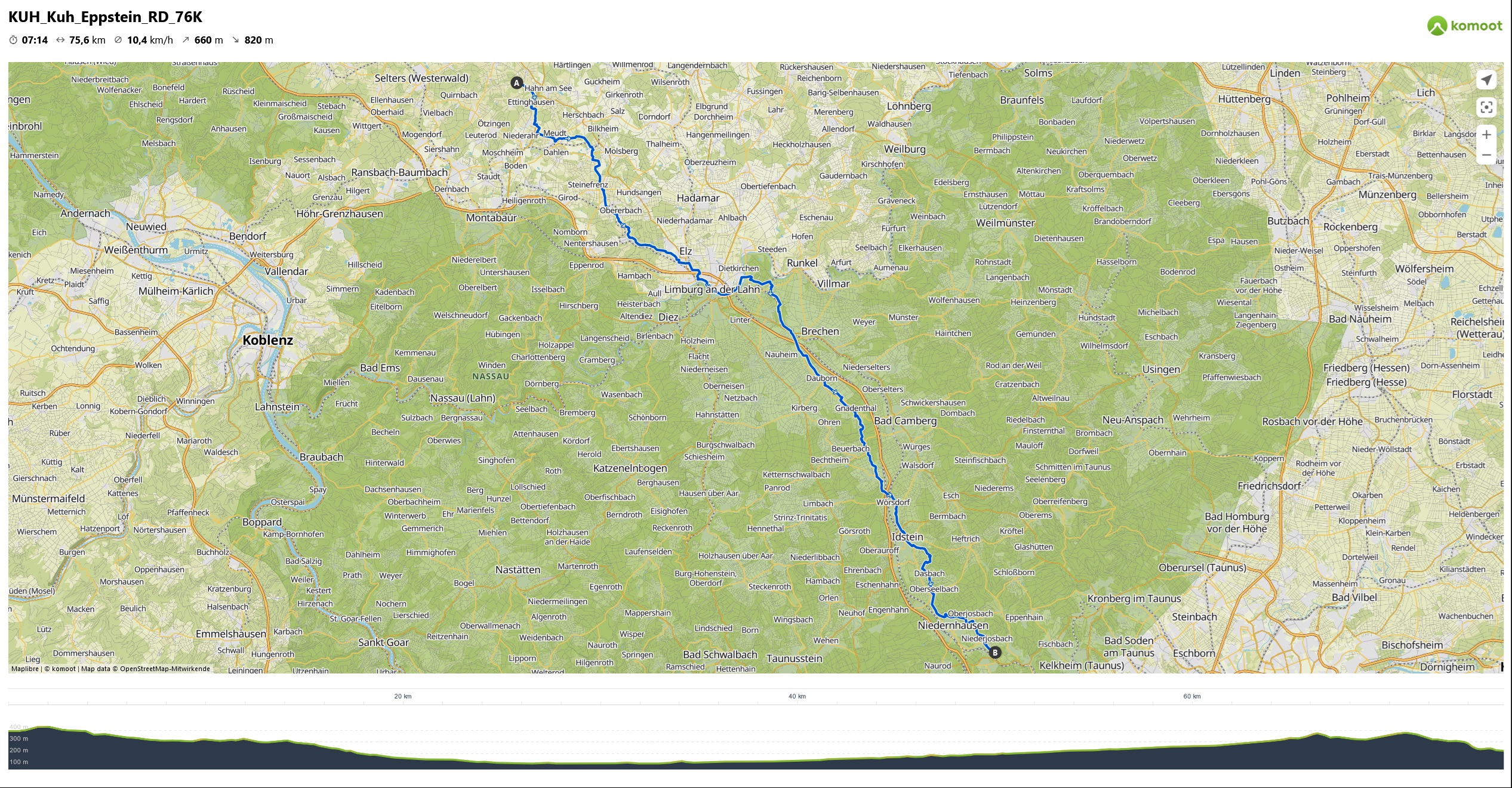 Damit ist der Weg an der Lahn bis nach Diez und der Aufstieg in den Westerwald durch das Erbachtal über Nieder- Obererbach und Dreikirchen eine bessere Variante, weitgehend autofrei und mit weniger Wellen. Die Stecke hat jetzt 110 km aber sogar etwas weniger Höhenmeter. Die Tour mit dem Rennrad-Rahmen von Marschall war die erste und wohl auch die letzte nach der Renovierung und Umbau auf geraden Lenker. Leider hat eine verklemmte Kette am Tag nach der Tour das Schaltauge verbogen. Das Rad wird jetzt erst mal nur noch auf dem Rollentrainer eingesetzt.