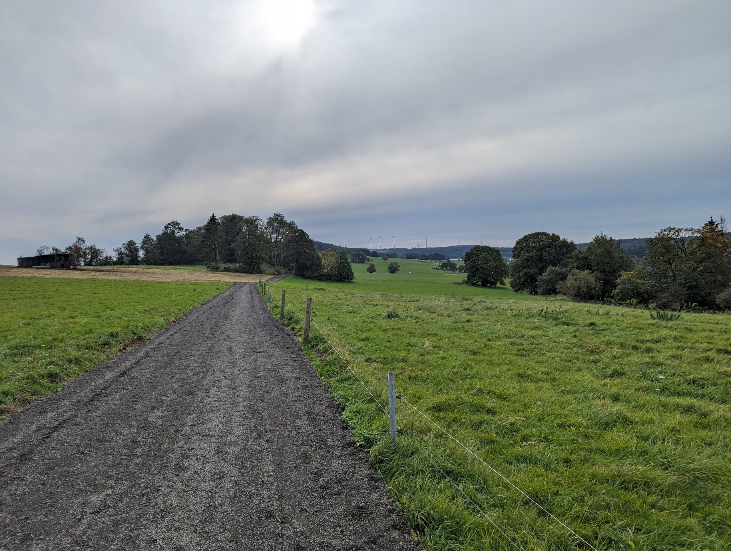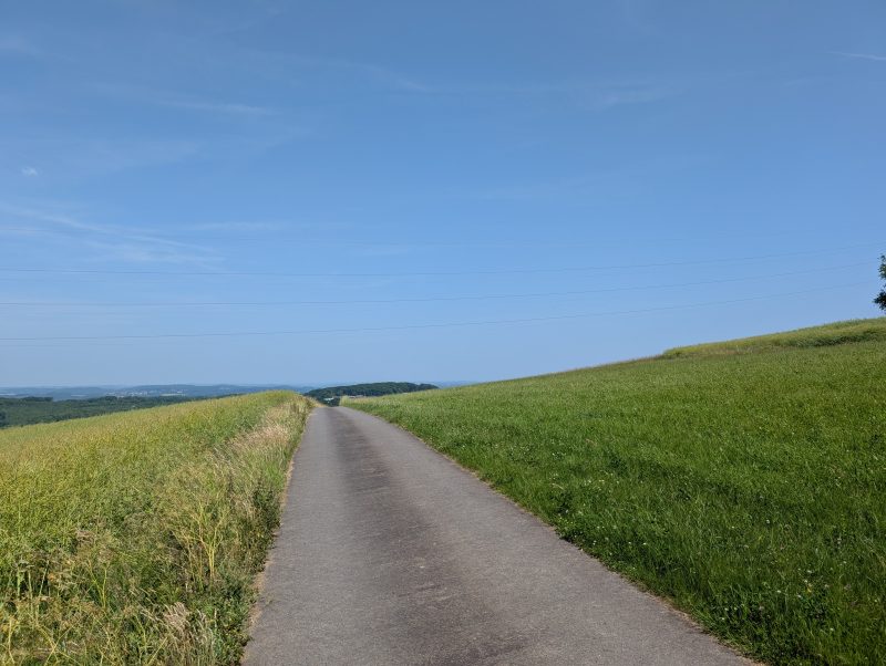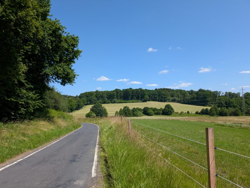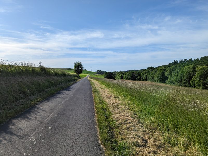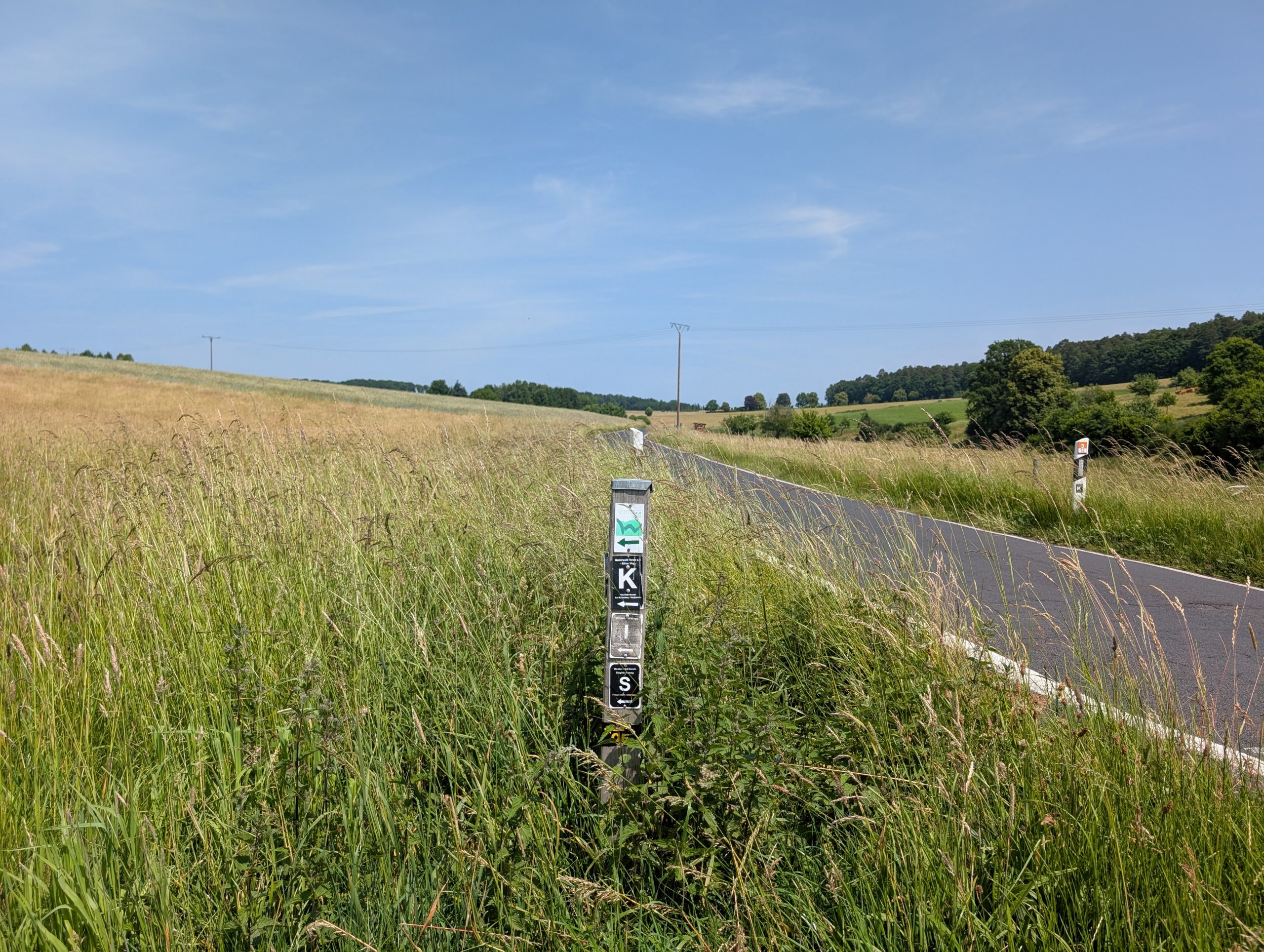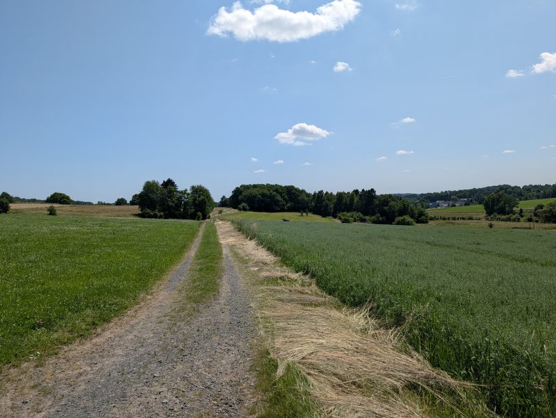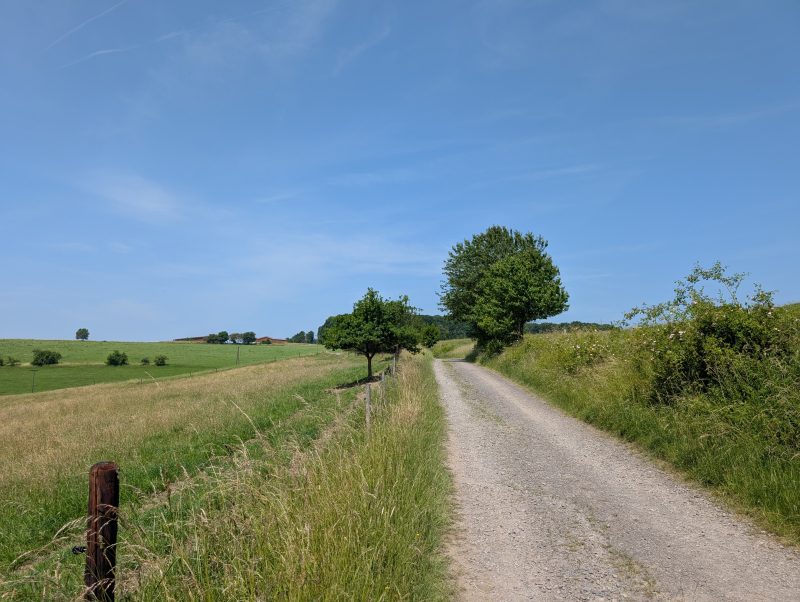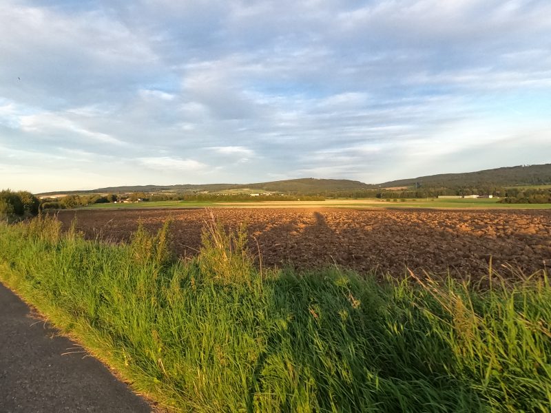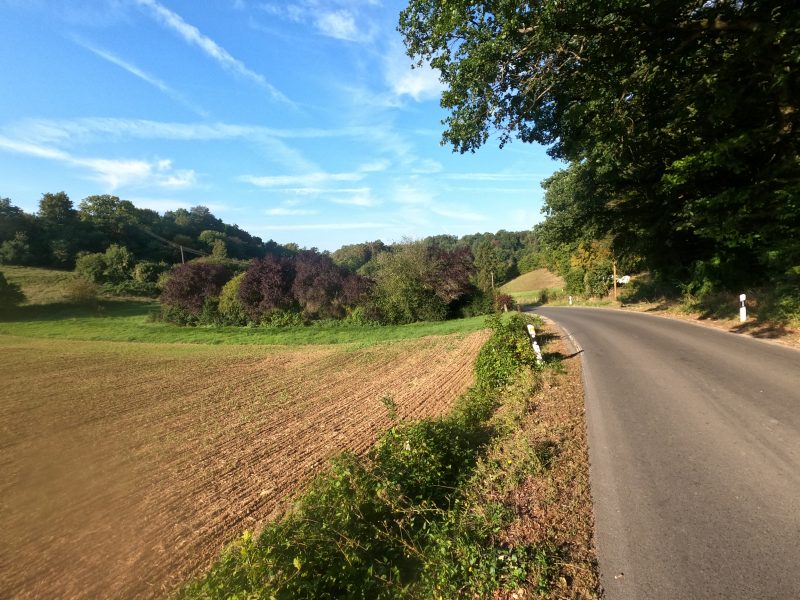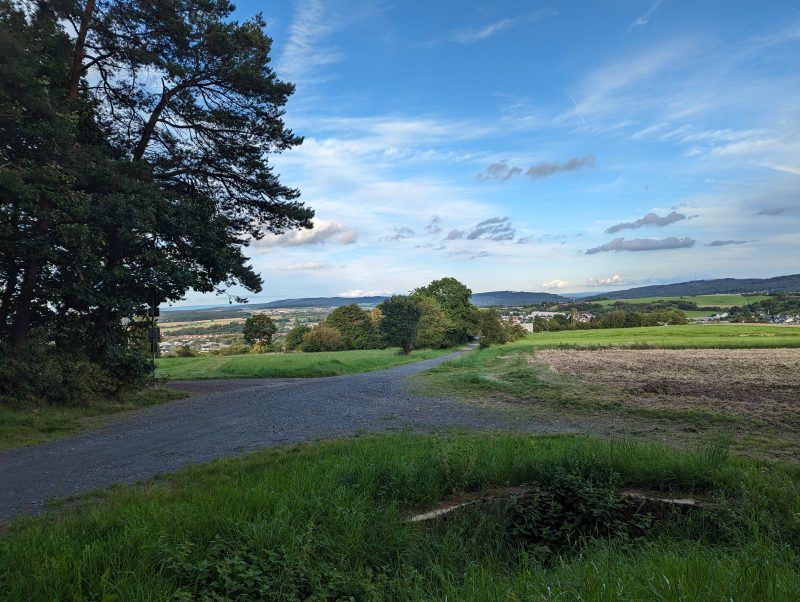 Drei Halbetappen in einer Woche. Die Sommerwärme liegt noch über den Westerwaldhöhen. Das ist angenehm, kein zu kalt, der Wind frisch vom Mittelmeer. Es gibt nur ein paar Höhenmeter durch zwei bescheidene Täler. Der höchste Teil des Westerwaldes ist jetzt eine Freifläche mit ein paar Laubbäumen. Sechshundert Meter über dem Meer ist man hier weit oben und so fühl es sich auch an. Mit dem Karbonstöckchen in der Hand, mal Spitze nach oben, mal nach unten geht es fast locker die 8,5 Kilomter nach Westen und ebenso locker, weil von der Fotopflicht befreit, auch wieder zurück. War eine schöne, fast perfekte Strecke für Alter, Gewicht und Kondition.