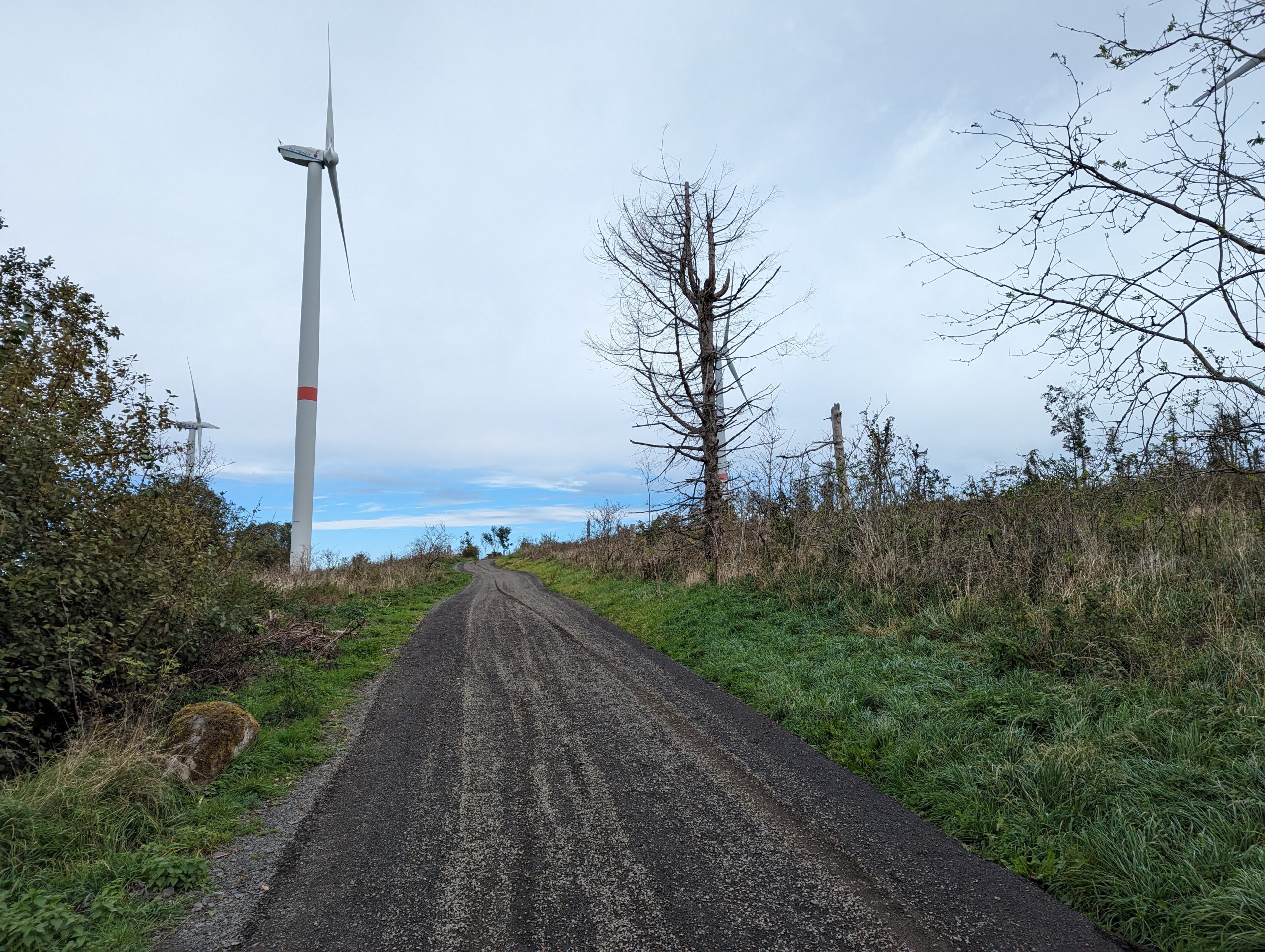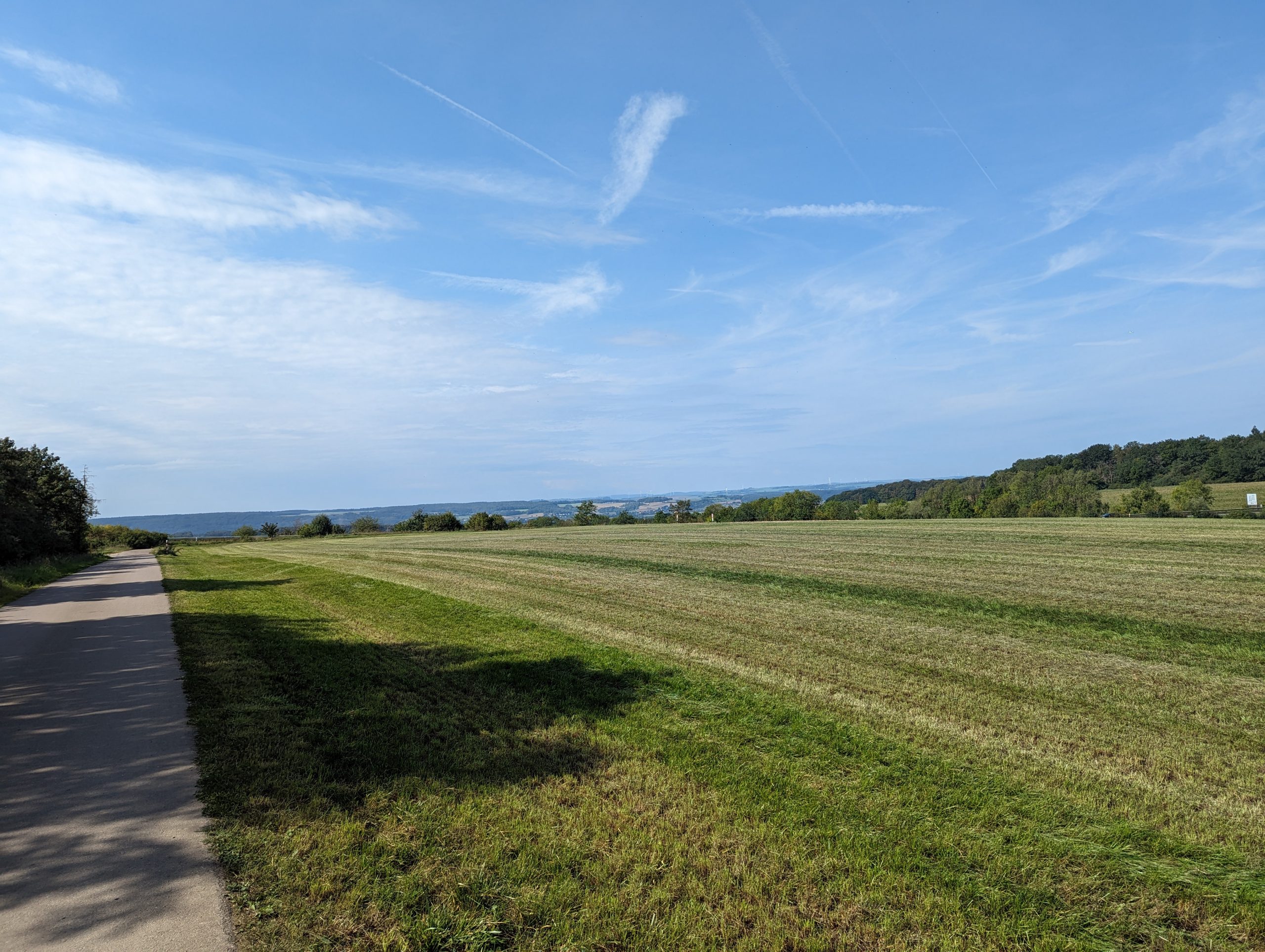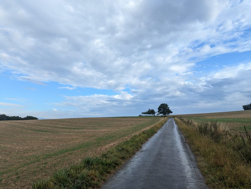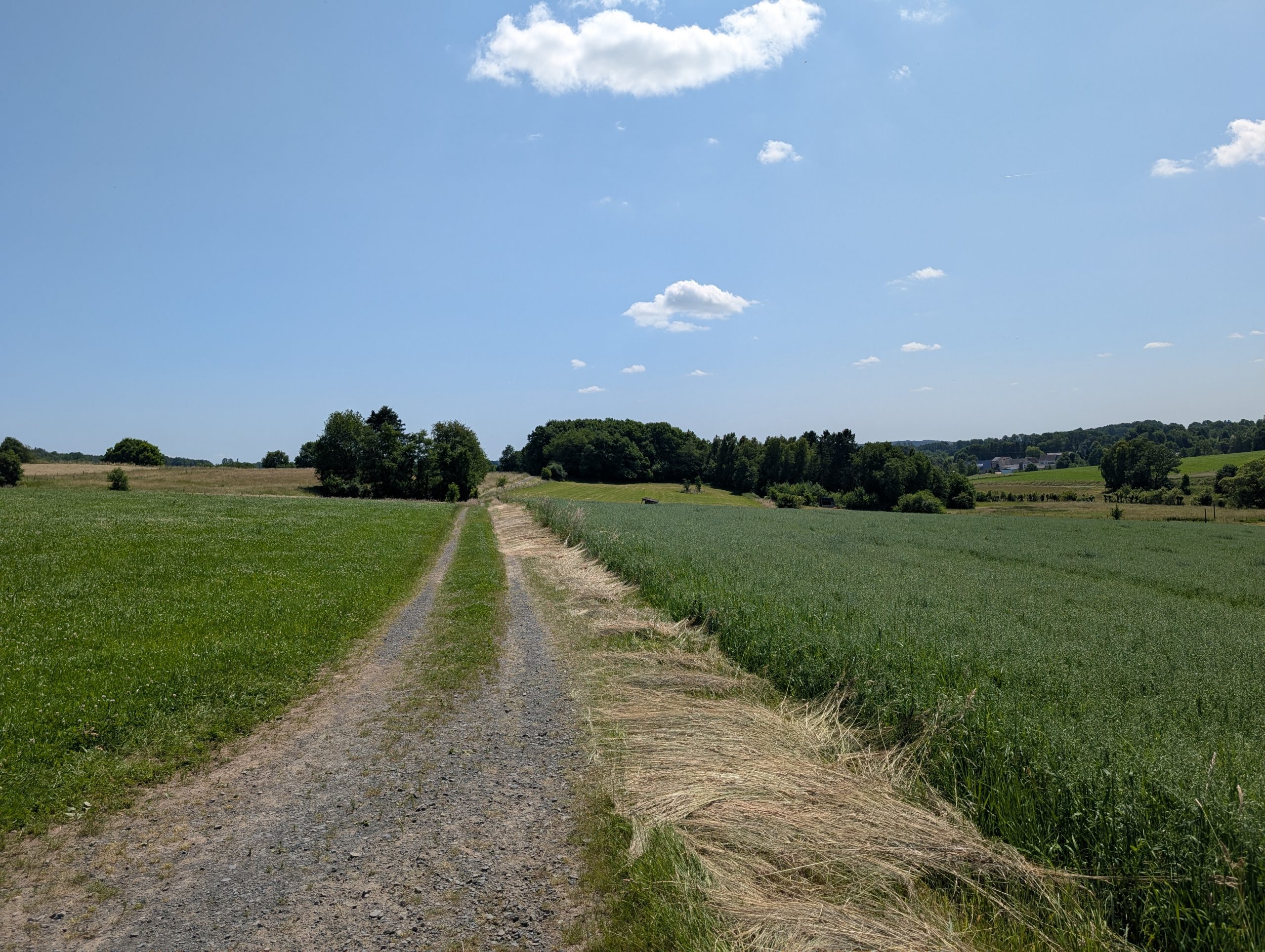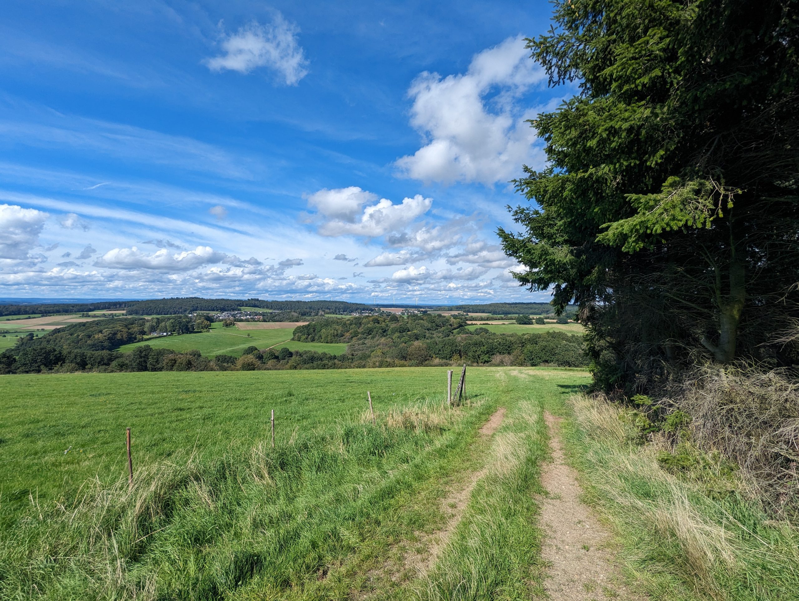 Drei Halbetappen in einer Woche. Die Sommerwärme liegt noch über den Westerwaldhöhen. Das ist angenehm, kein zu kalt, der Wind frisch vom Mittelmeer. Es gibt nur ein paar Höhenmeter durch zwei bescheidene Täler. Der höchste Teil des Westerwaldes ist jetzt eine Freifläche mit ein paar Laubbäumen. Sechshundert Meter über dem Meer ist man hier weit oben und so fühl es sich auch an. Mit dem Karbonstöckchen in der Hand, mal Spitze nach oben, mal nach unten geht es fast locker die 8,5 Kilomter nach Westen und ebenso locker, weil von der Fotopflicht befreit, auch wieder zurück. War eine schöne, fast perfekte Strecke für Alter, Gewicht und Kondition.
