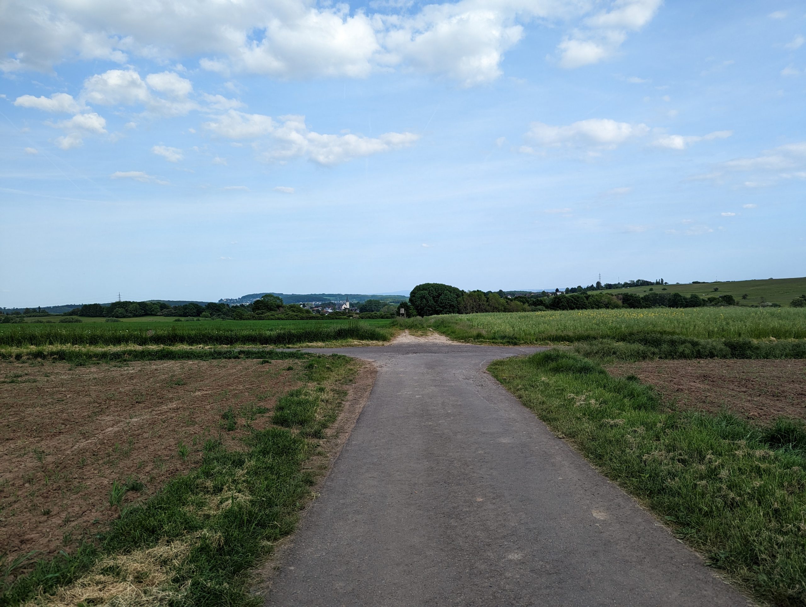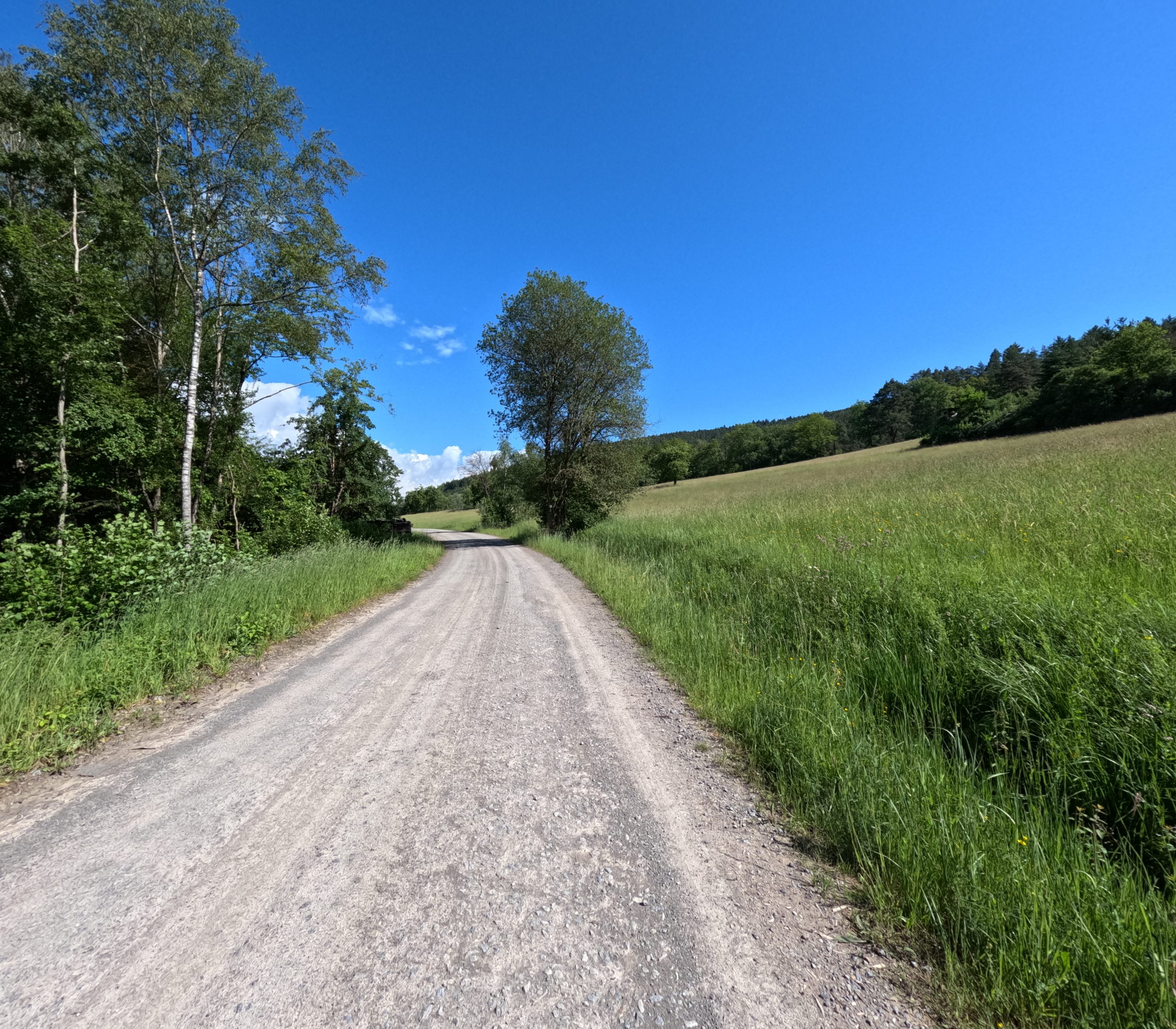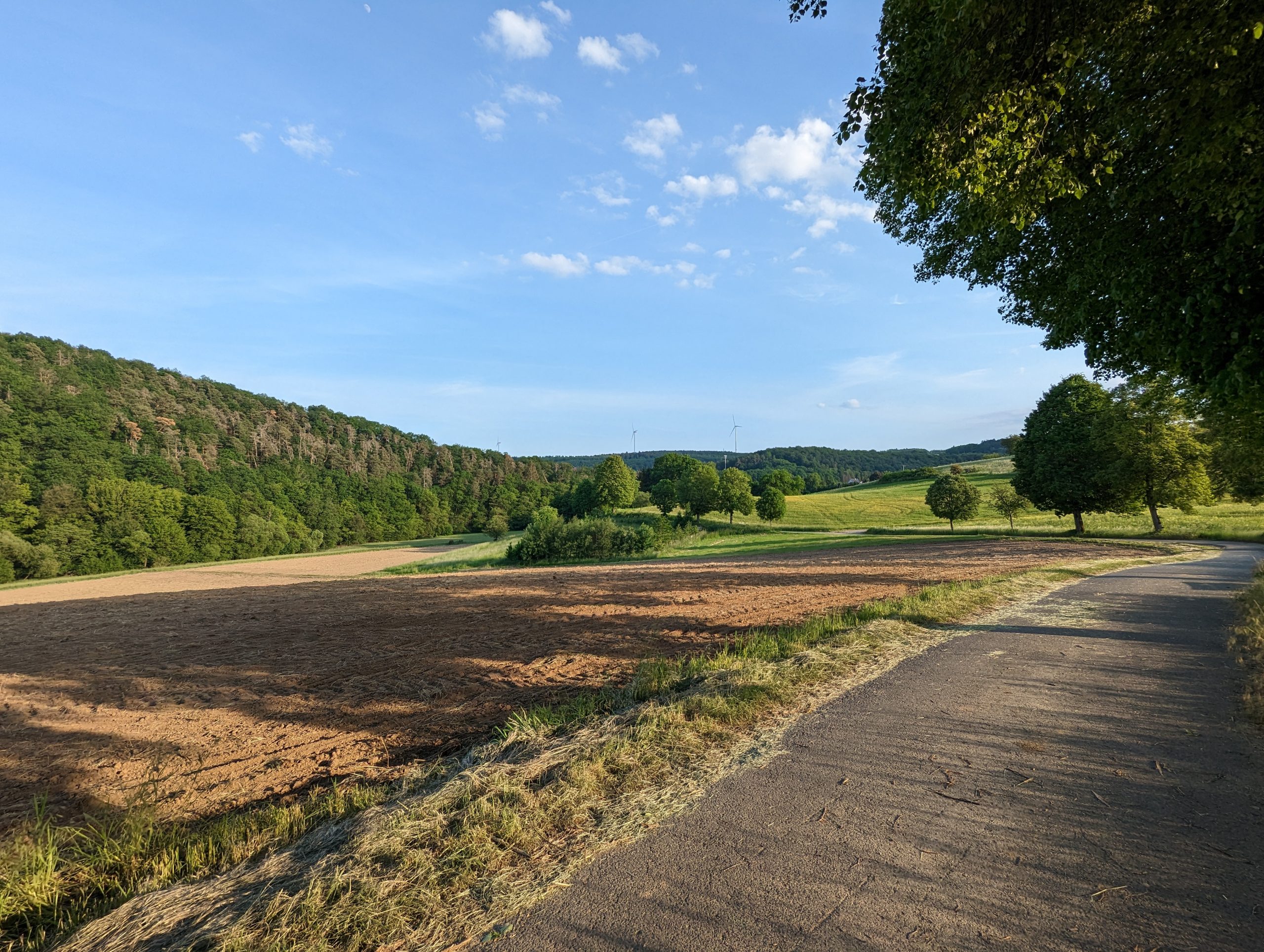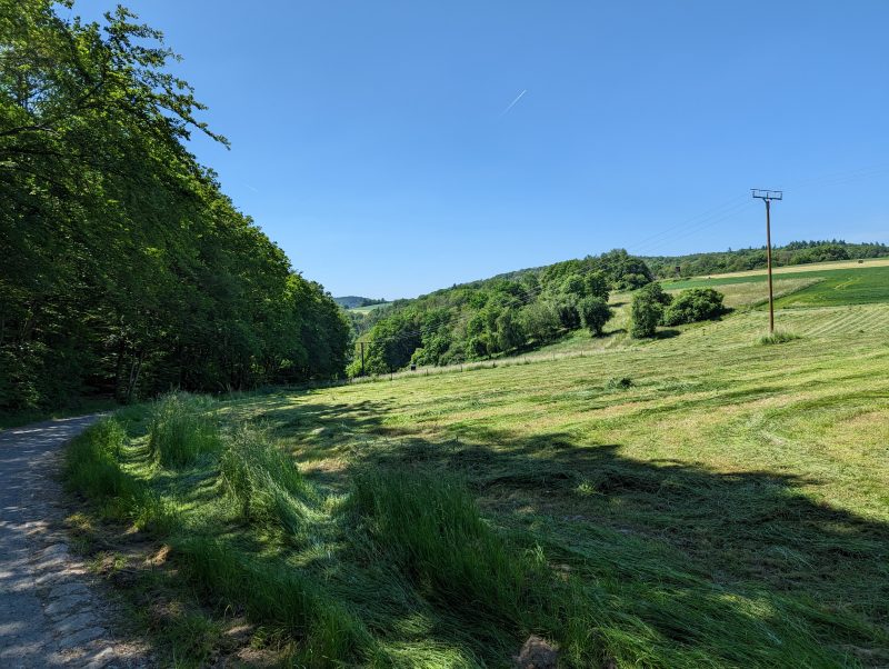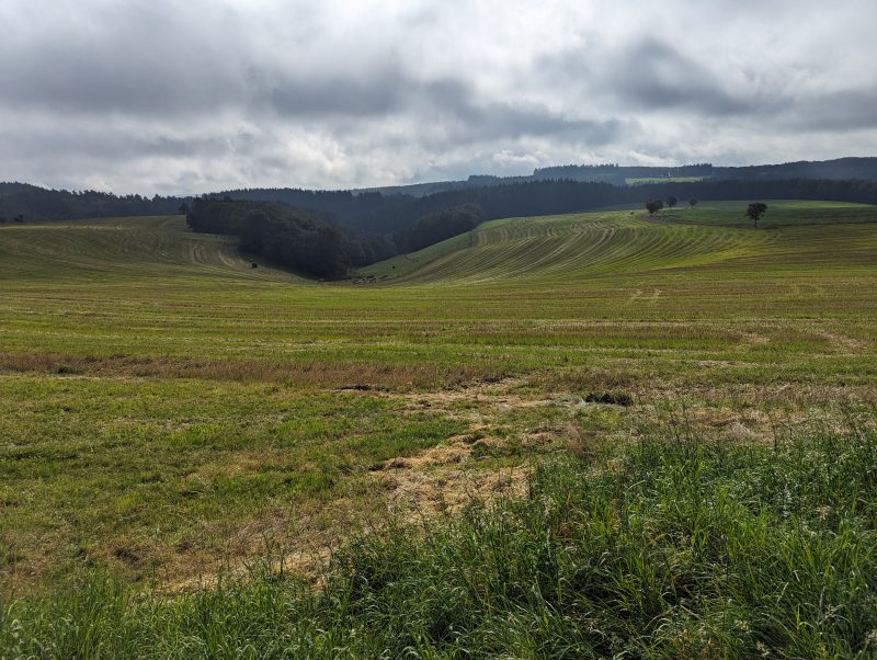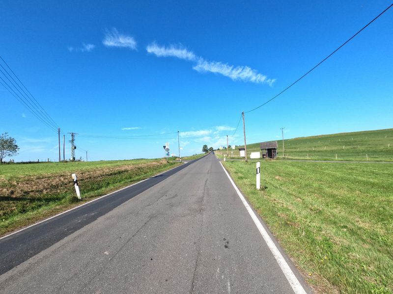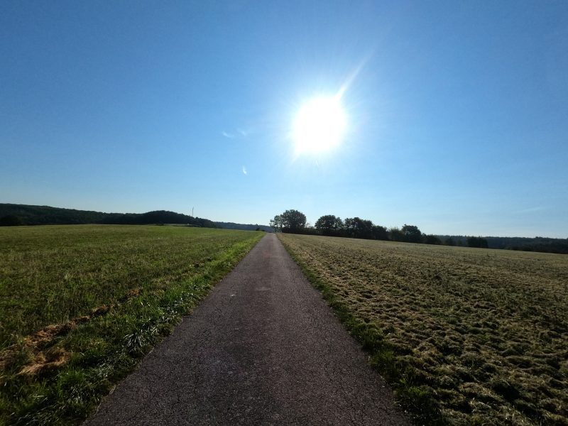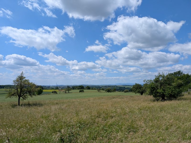 Drei Halbetappen in einer Woche. Die Sommerwärme liegt noch über den Westerwaldhöhen. Das ist angenehm, kein zu kalt, der Wind frisch vom Mittelmeer. Es gibt nur ein paar Höhenmeter durch zwei bescheidene Täler. Der höchste Teil des Westerwaldes ist jetzt eine Freifläche mit ein paar Laubbäumen. Sechshundert Meter über dem Meer ist man hier weit oben und so fühl es sich auch an. Mit dem Karbonstöckchen in der Hand, mal Spitze nach oben, mal nach unten geht es fast locker die 8,5 Kilomter nach Westen und ebenso locker, weil von der Fotopflicht befreit, auch wieder zurück. War eine schöne, fast perfekte Strecke für Alter, Gewicht und Kondition.
