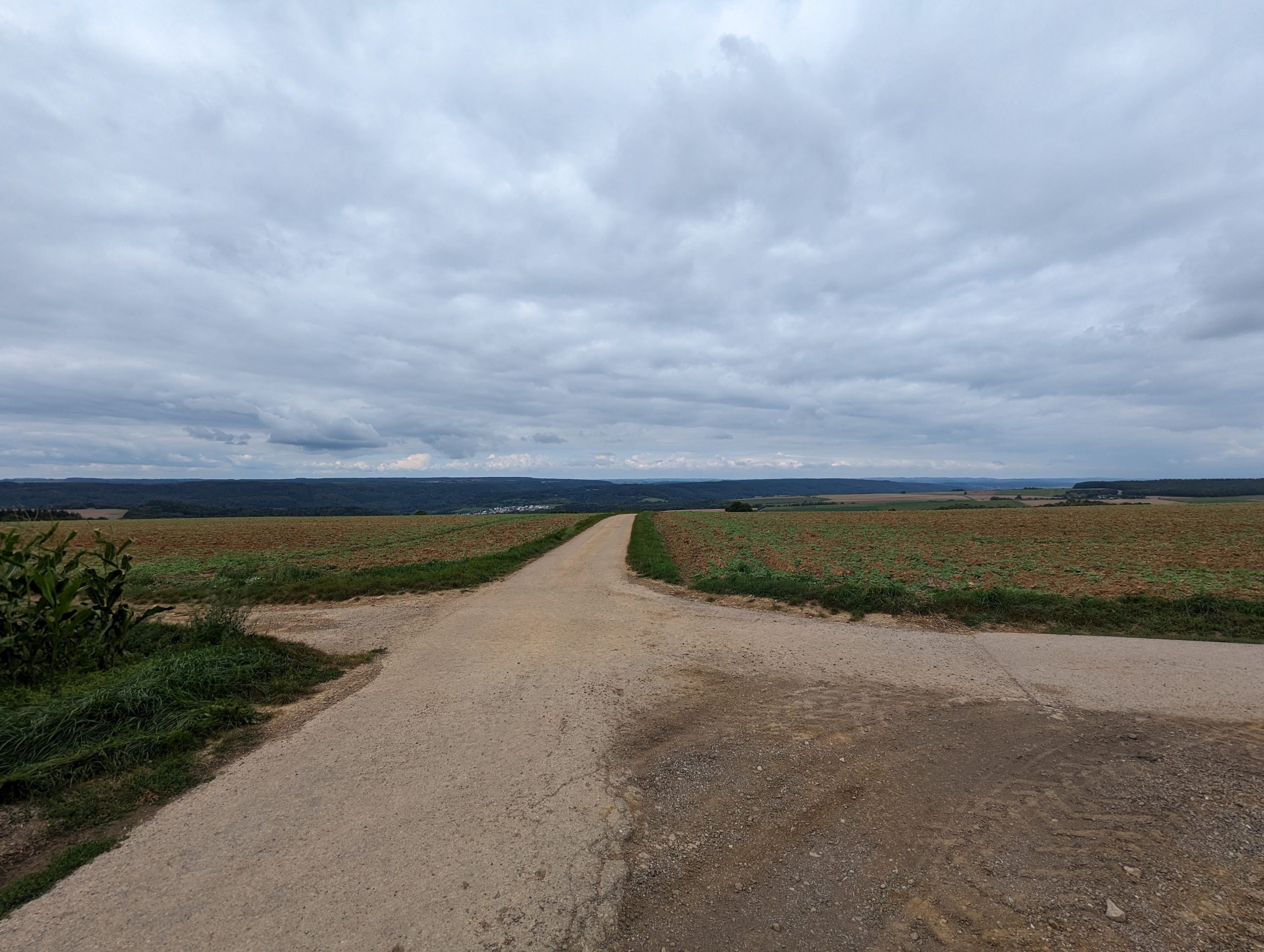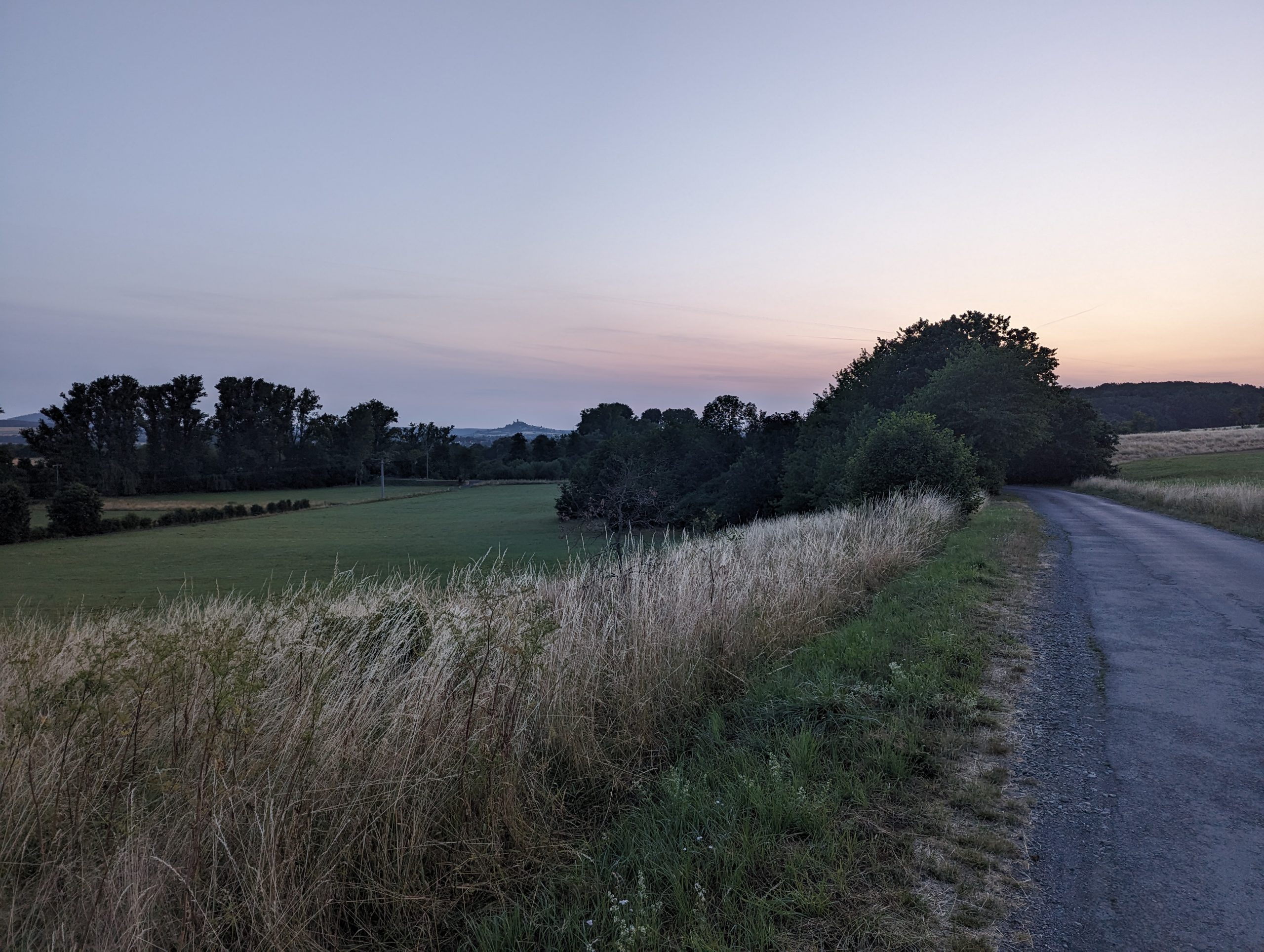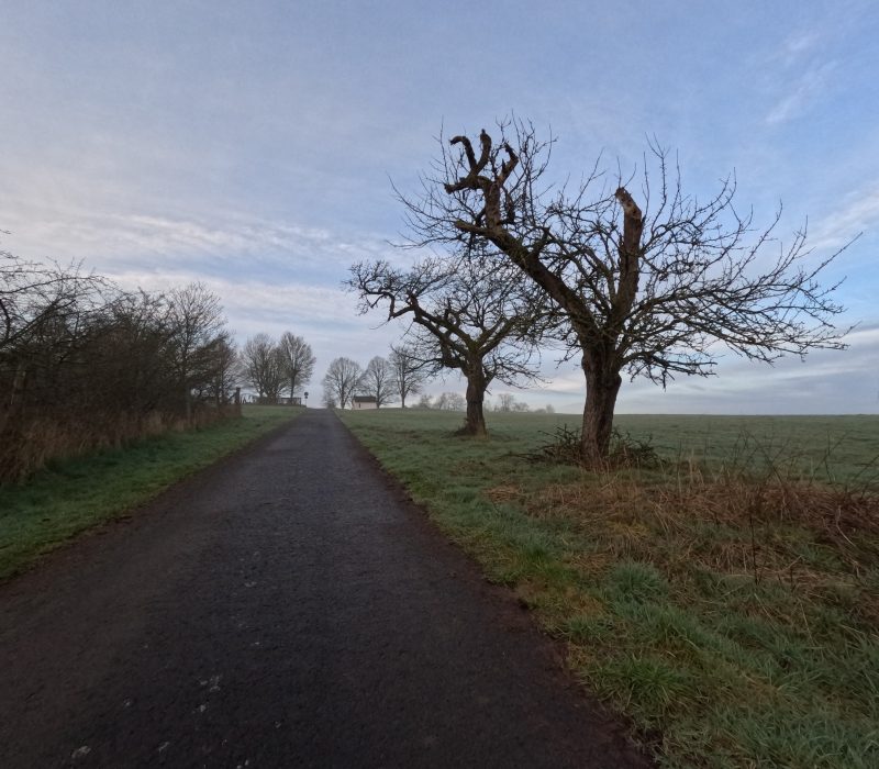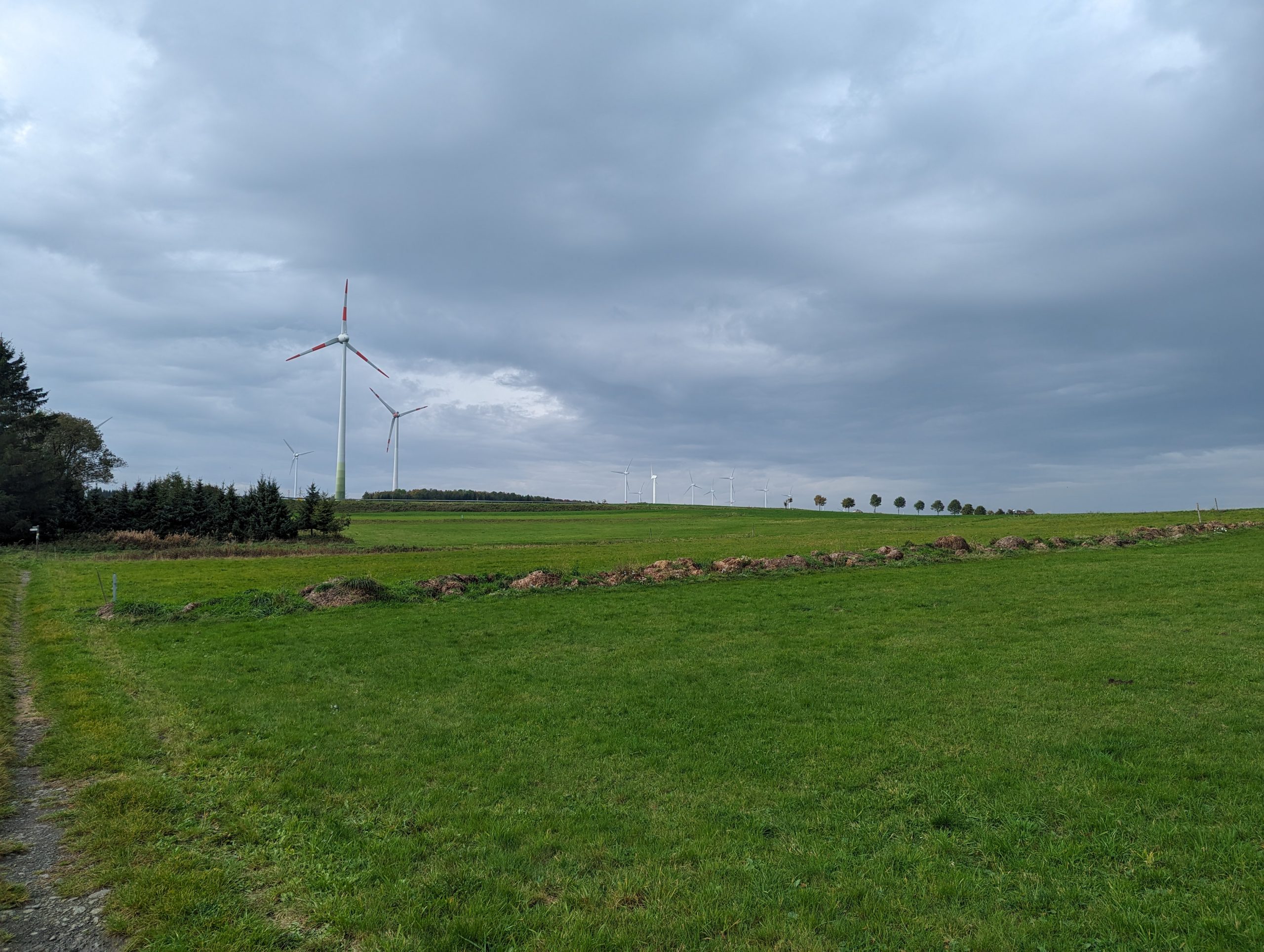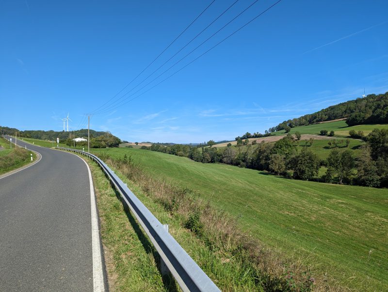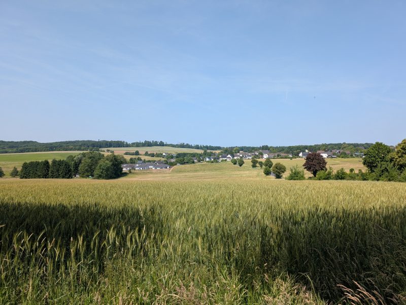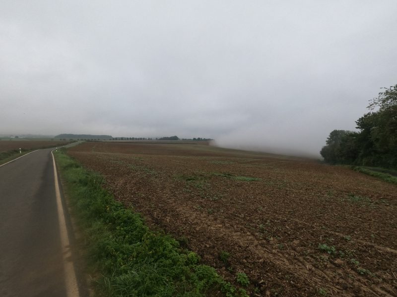 Drei Halbetappen in einer Woche. Die Sommerwärme liegt noch über den Westerwaldhöhen. Das ist angenehm, kein zu kalt, der Wind frisch vom Mittelmeer. Es gibt nur ein paar Höhenmeter durch zwei bescheidene Täler. Der höchste Teil des Westerwaldes ist jetzt eine Freifläche mit ein paar Laubbäumen. Sechshundert Meter über dem Meer ist man hier weit oben und so fühl es sich auch an. Mit dem Karbonstöckchen in der Hand, mal Spitze nach oben, mal nach unten geht es fast locker die 8,5 Kilomter nach Westen und ebenso locker, weil von der Fotopflicht befreit, auch wieder zurück. War eine schöne, fast perfekte Strecke für Alter, Gewicht und Kondition.