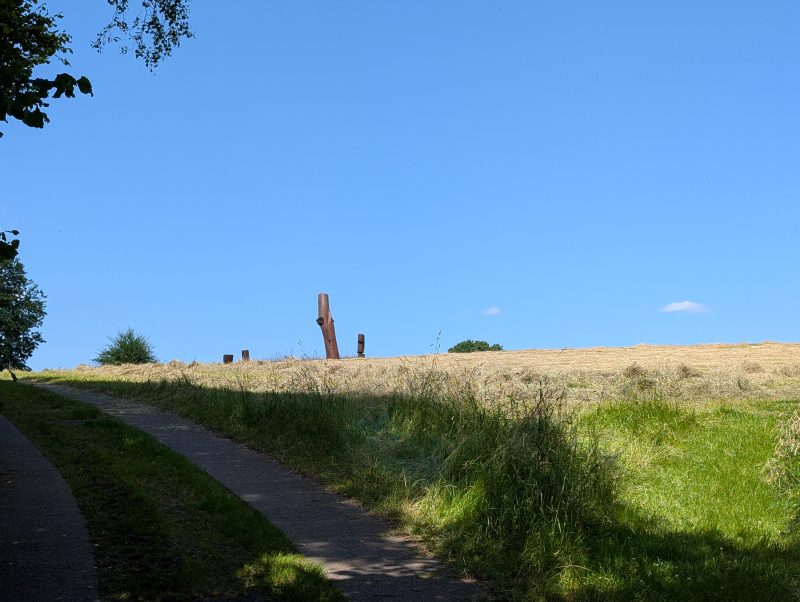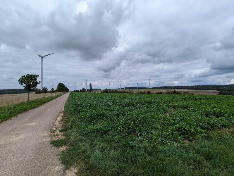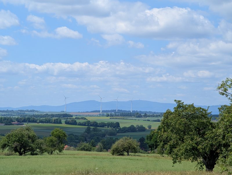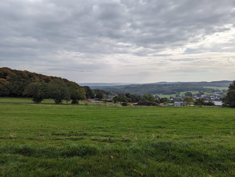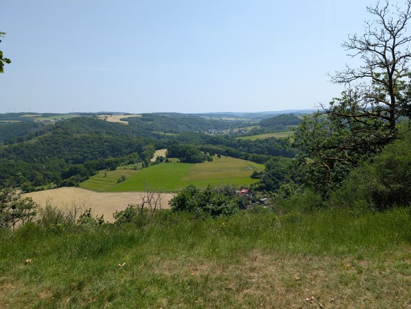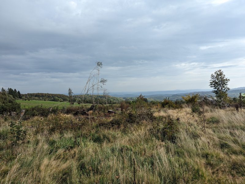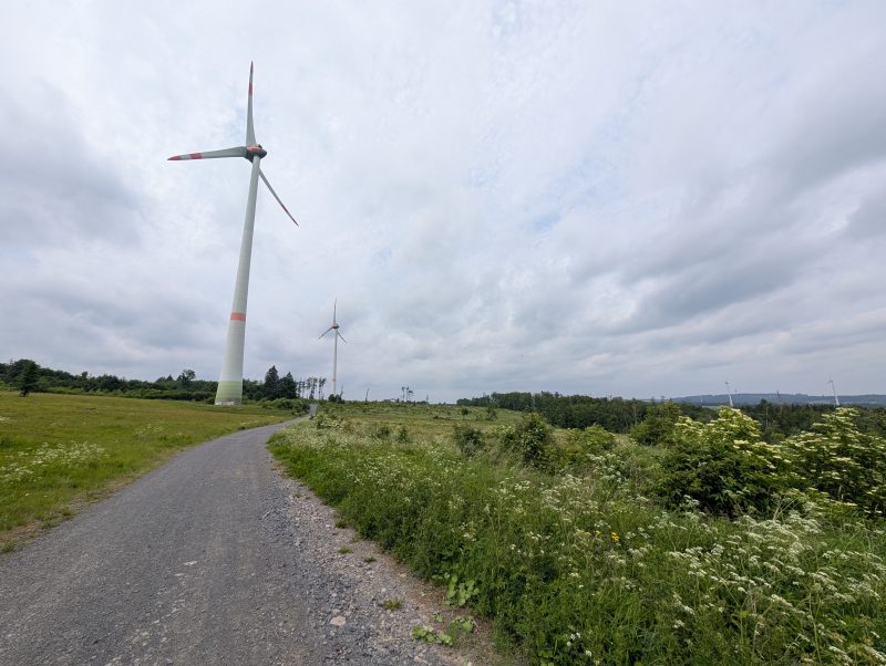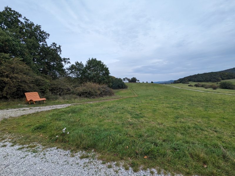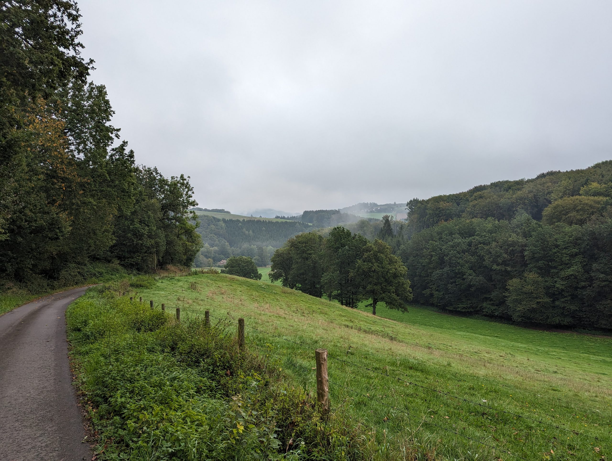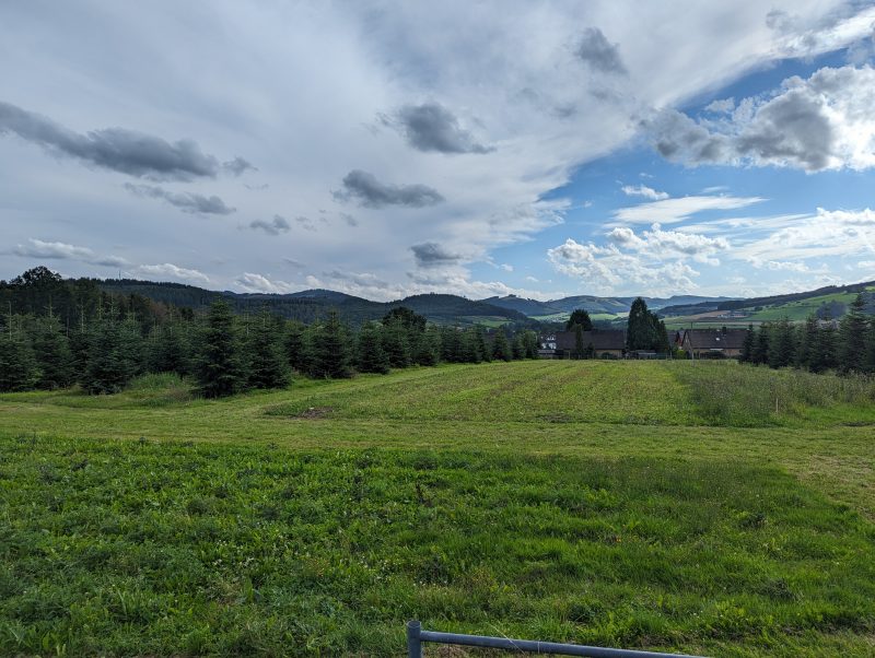 Drei Halbetappen in einer Woche. Die Sommerwärme liegt noch über den Westerwaldhöhen. Das ist angenehm, kein zu kalt, der Wind frisch vom Mittelmeer. Es gibt nur ein paar Höhenmeter durch zwei bescheidene Täler. Der höchste Teil des Westerwaldes ist jetzt eine Freifläche mit ein paar Laubbäumen. Sechshundert Meter über dem Meer ist man hier weit oben und so fühl es sich auch an. Mit dem Karbonstöckchen in der Hand, mal Spitze nach oben, mal nach unten geht es fast locker die 8,5 Kilomter nach Westen und ebenso locker, weil von der Fotopflicht befreit, auch wieder zurück. War eine schöne, fast perfekte Strecke für Alter, Gewicht und Kondition.