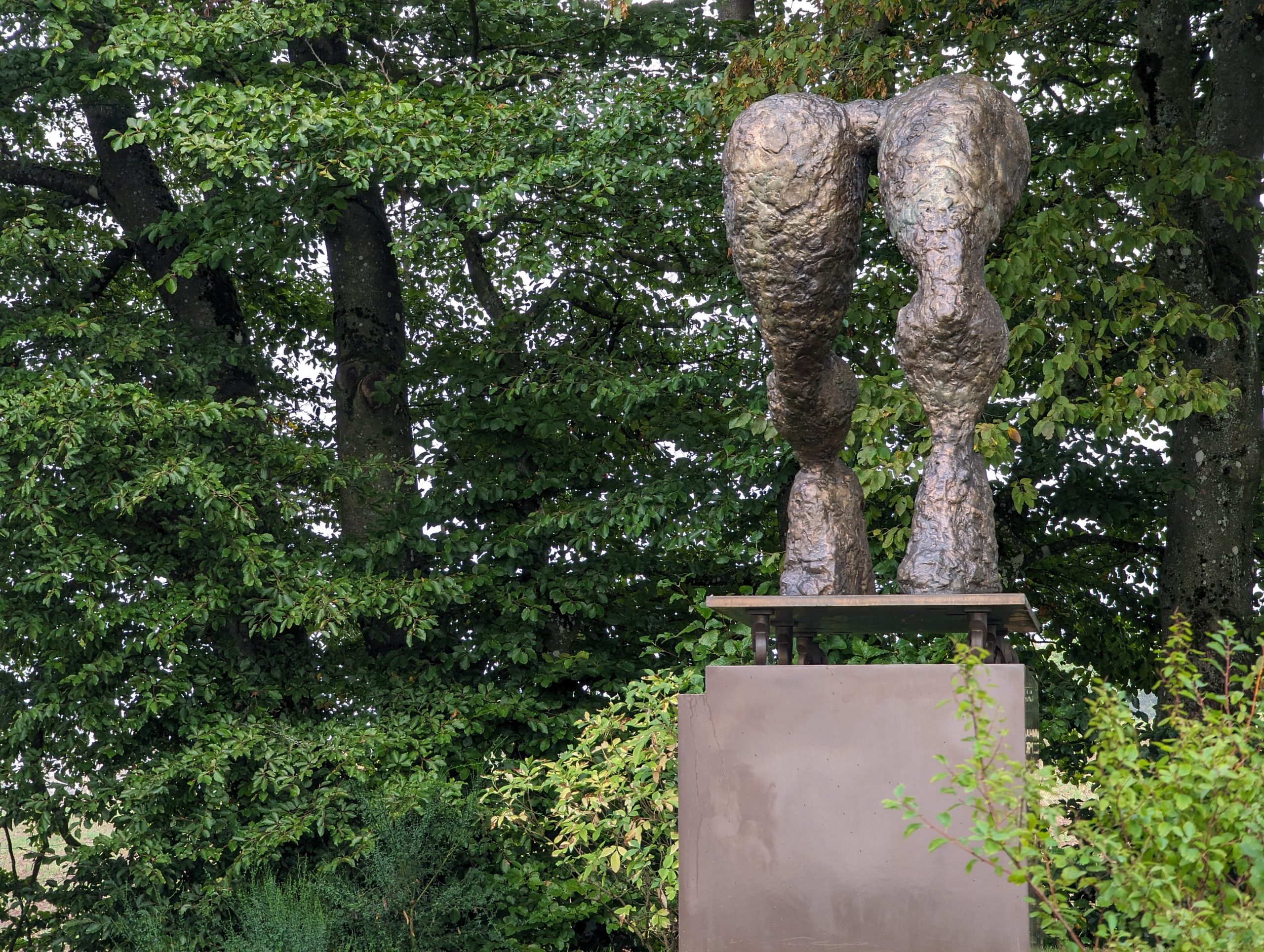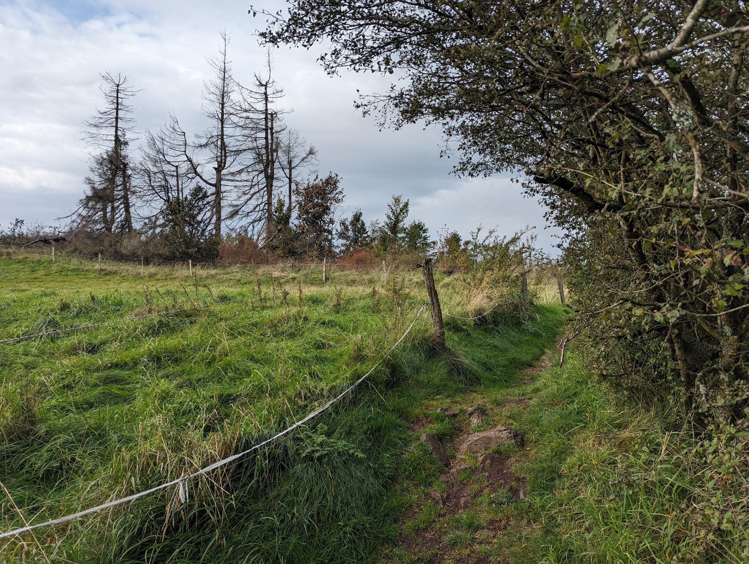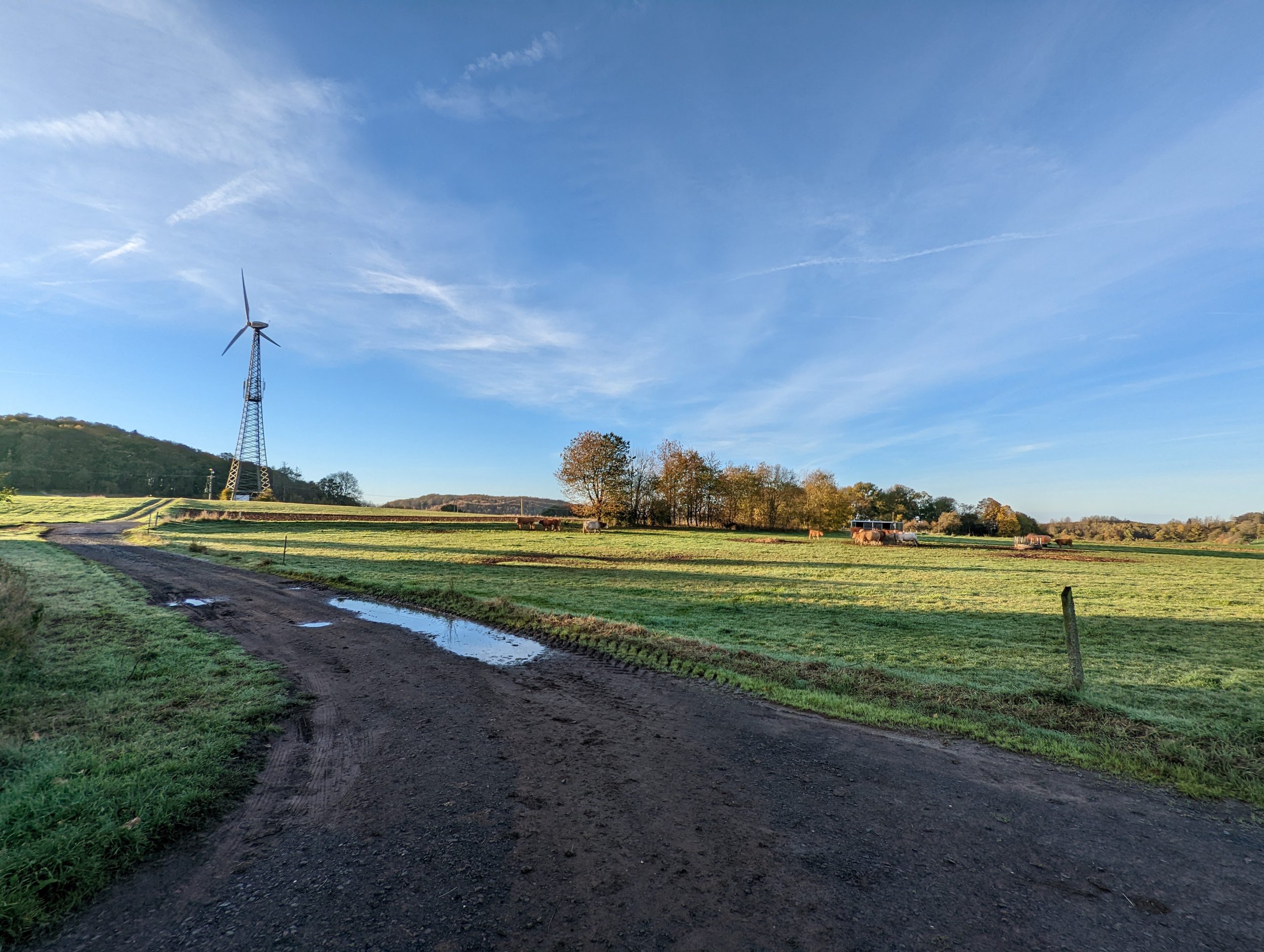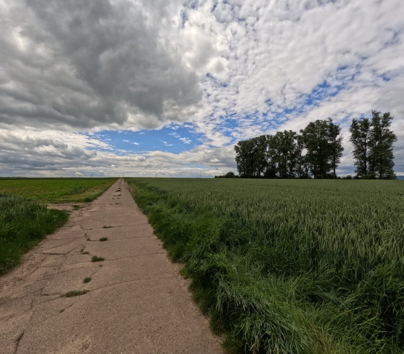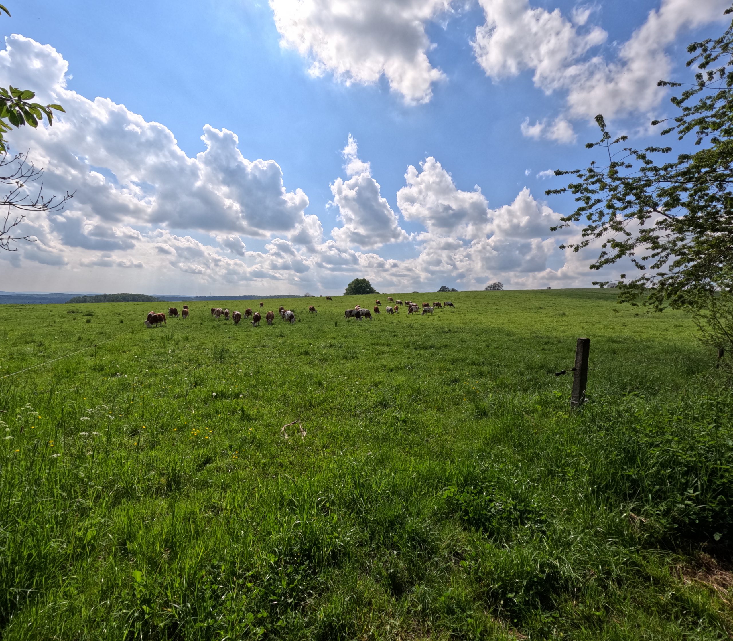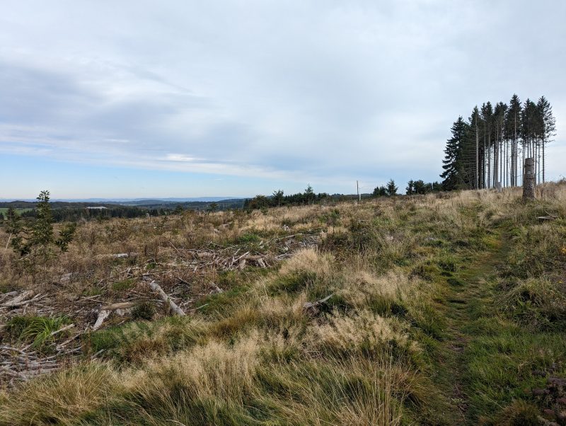 Drei Halbetappen in einer Woche. Die Sommerwärme liegt noch über den Westerwaldhöhen. Das ist angenehm, kein zu kalt, der Wind frisch vom Mittelmeer. Es gibt nur ein paar Höhenmeter durch zwei bescheidene Täler. Der höchste Teil des Westerwaldes ist jetzt eine Freifläche mit ein paar Laubbäumen. Sechshundert Meter über dem Meer ist man hier weit oben und so fühl es sich auch an. Mit dem Karbonstöckchen in der Hand, mal Spitze nach oben, mal nach unten geht es fast locker die 8,5 Kilomter nach Westen und ebenso locker, weil von der Fotopflicht befreit, auch wieder zurück. War eine schöne, fast perfekte Strecke für Alter, Gewicht und Kondition.