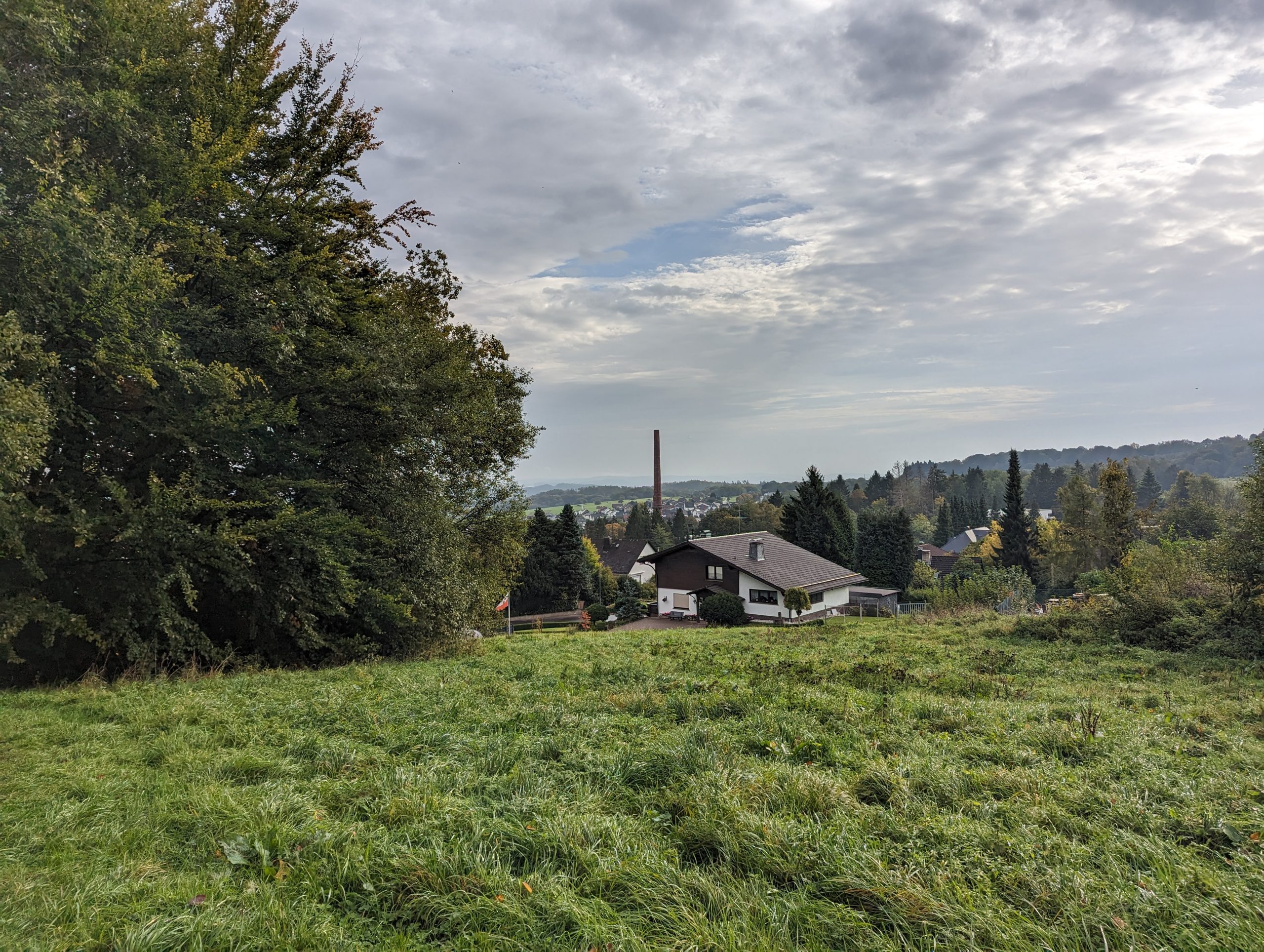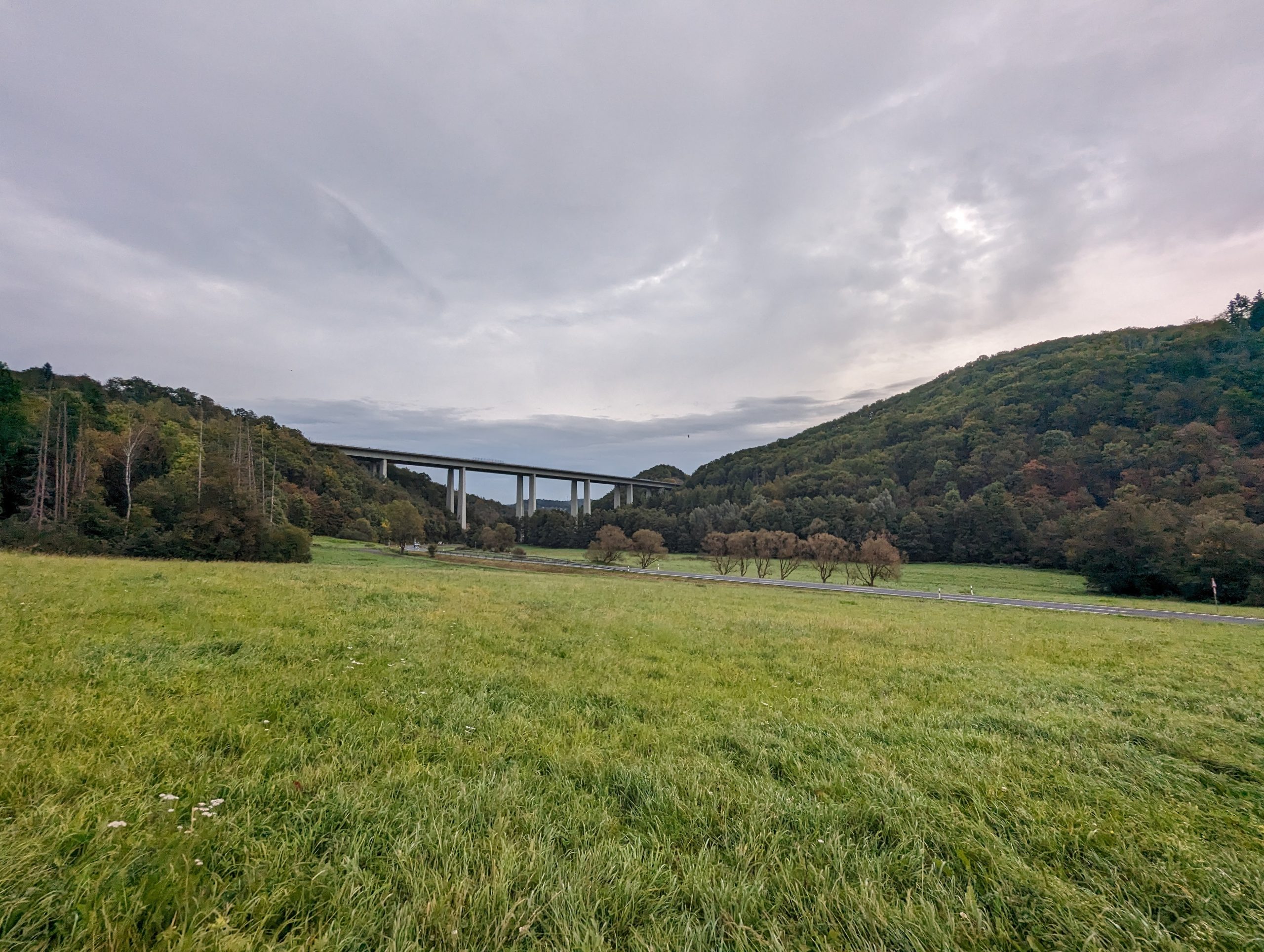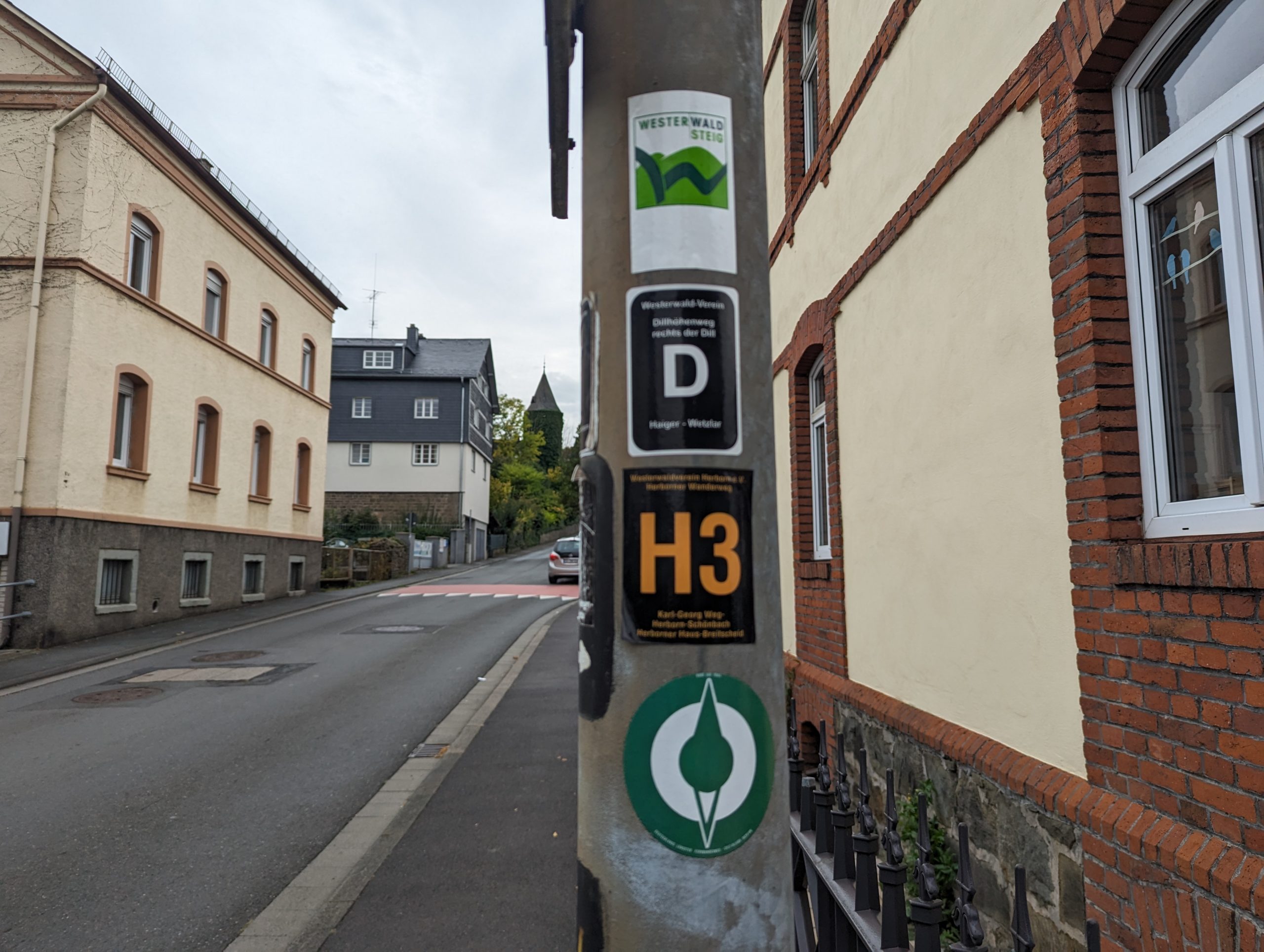 Die erste Etappe mit Laufklamotten im Schlurfschritt durch die schöne Herborner Altstadt, da muss man schon die irritierten Blicke der Einkäufer in den engen Gassen ignorieren. Bald geht es steil in die Wohnlage von Herborn und mit einigen Schleifen entlang der Autobahnbrücken der A45 ins Ambachtal, der die Rampe, den Zugang zum Westerwald von der Ostseite her bildet. Damit die versprochenen Höhenmeter zusammen kommen, pendelt die Wegführung von der rechten zur linken Talseite, was müde Beine und schöne Aussicht beschert. Es ist einer der letzten an den Sommer erinnernden Oktobertage und die Stimmung ist mit Wehmut und Knieschmerz durchsetzt.