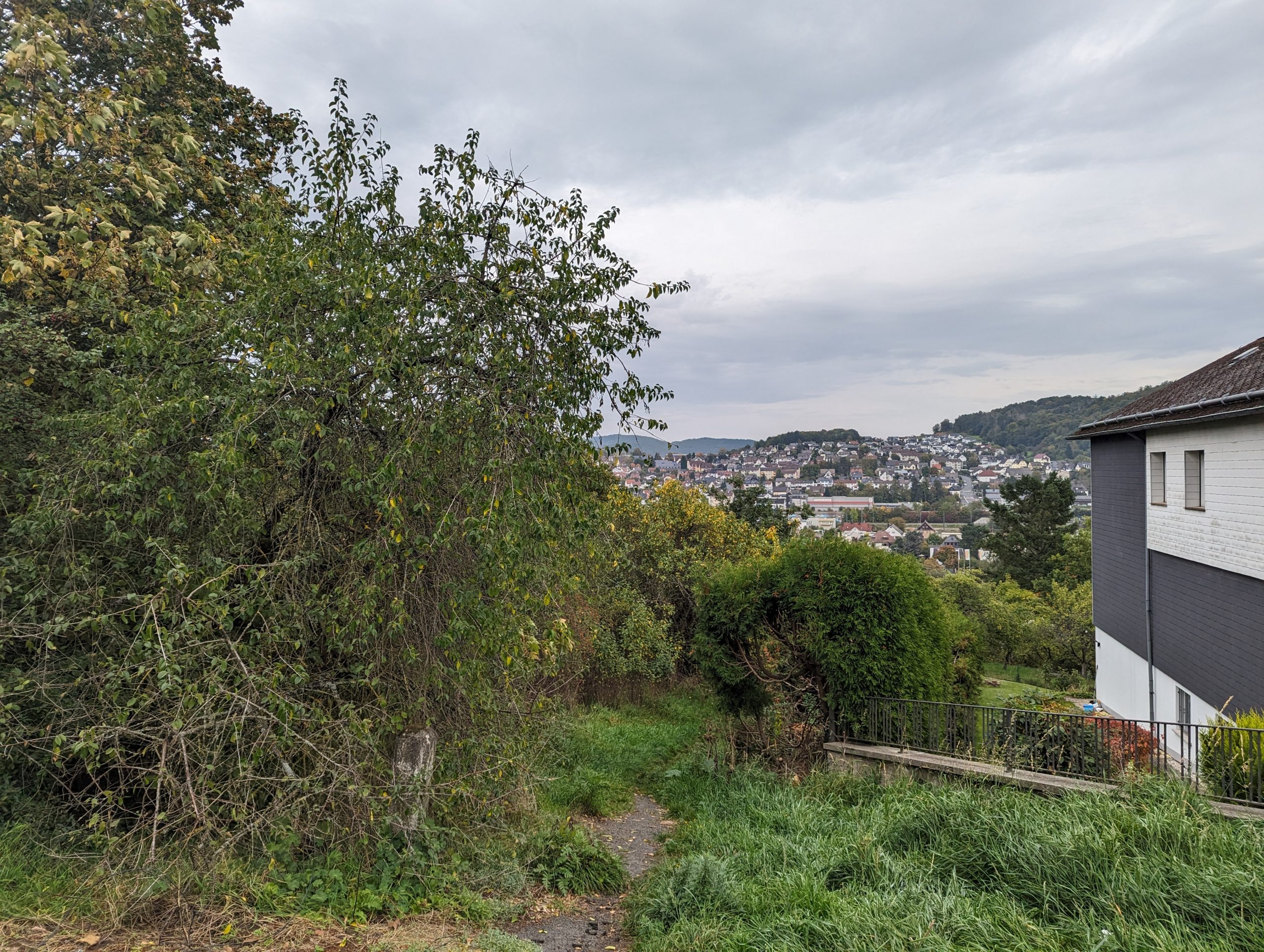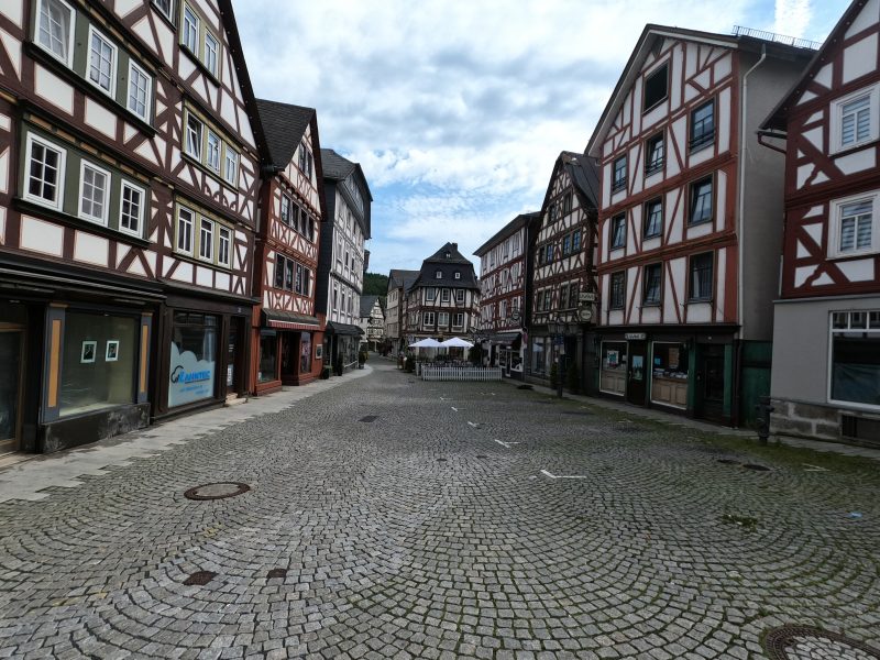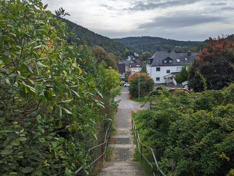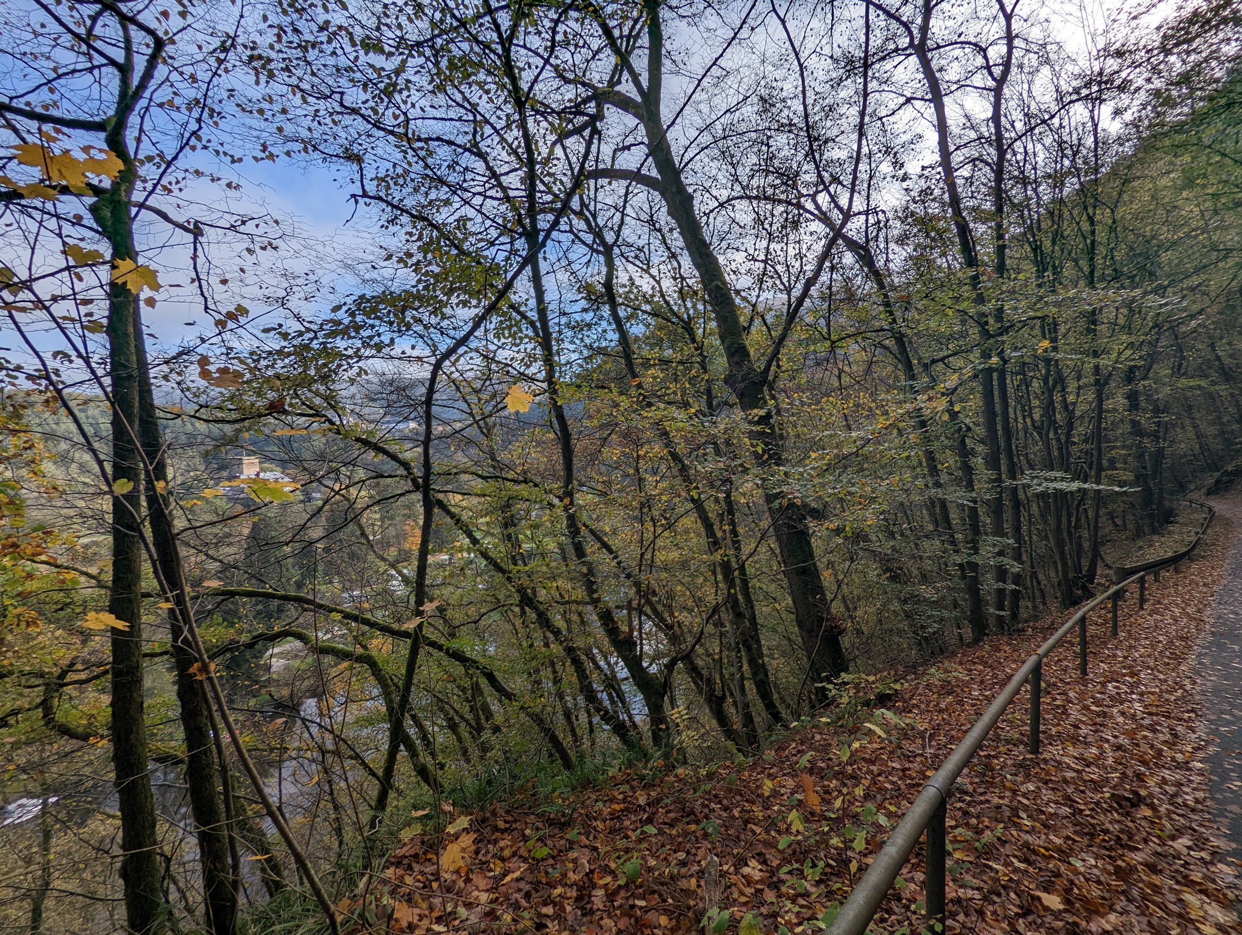 Die erste Etappe mit Laufklamotten im Schlurfschritt durch die schöne Herborner Altstadt, da muss man schon die irritierten Blicke der Einkäufer in den engen Gassen ignorieren. Bald geht es steil in die Wohnlage von Herborn und mit einigen Schleifen entlang der Autobahnbrücken der A45 ins Ambachtal, der die Rampe, den Zugang zum Westerwald von der Ostseite her bildet. Damit die versprochenen Höhenmeter zusammen kommen, pendelt die Wegführung von der rechten zur linken Talseite, was müde Beine und schöne Aussicht beschert. Es ist einer der letzten an den Sommer erinnernden Oktobertage und die Stimmung ist mit Wehmut und Knieschmerz durchsetzt.