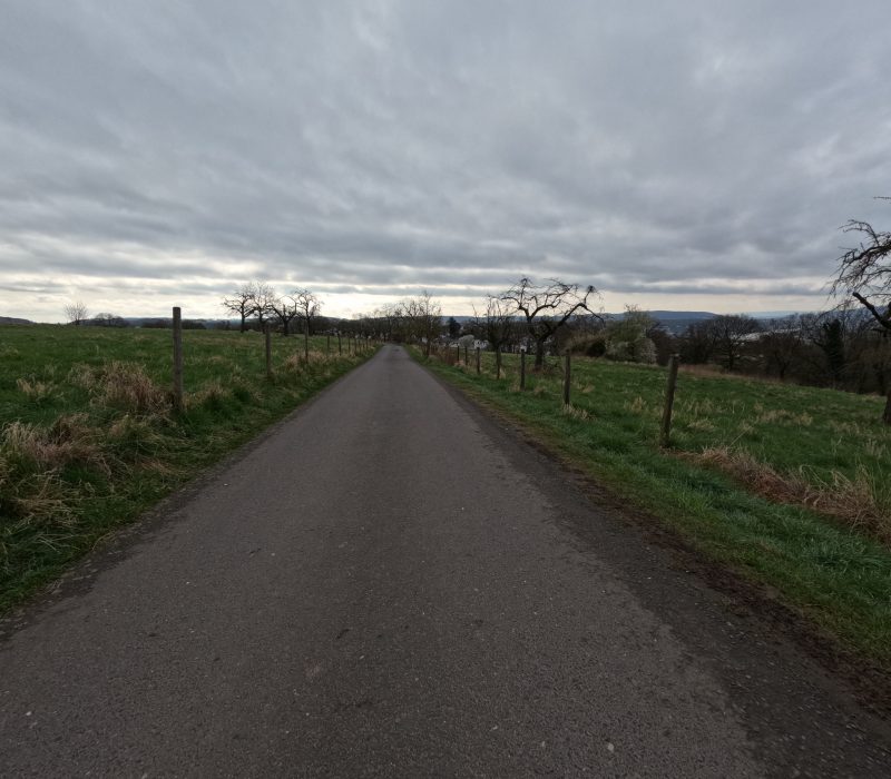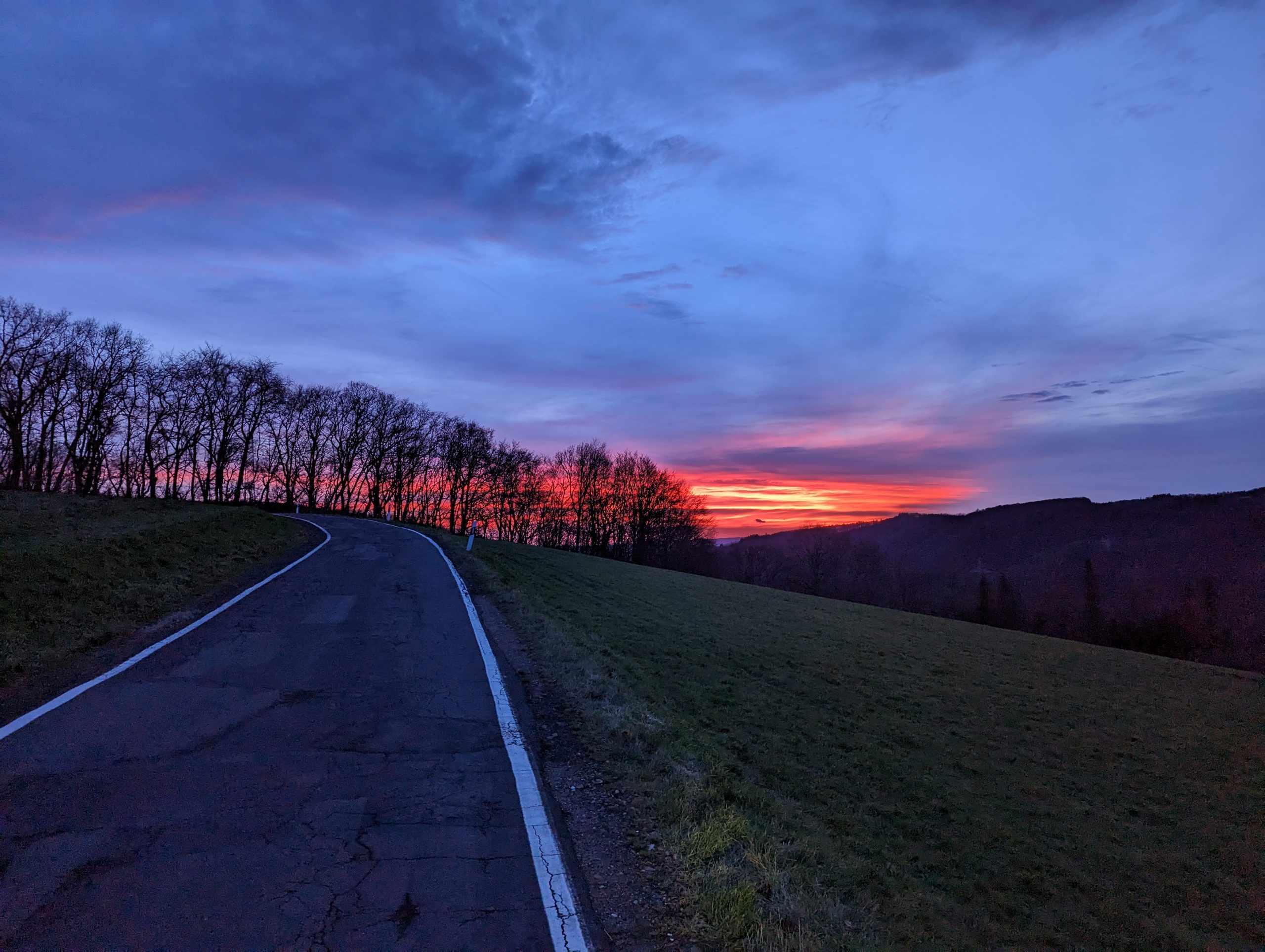 Die kleine Variante als Halbtagestour hat einen schönen Anstieg von Arzbach über die K2 nach Kemmenau mit Ausblick über die Lahn und Rheintalhöhen bei Bad Ems. Bei für Dezember sehr warmem Wind gab es bei der Jahresabschlußfahrt dann an dieser Stelle noch ein Abendrot als Zugabe. Es war gleichzeitig die erste längere Strecke mit dem auf Moonlenker umgebauten Marschall Rennradrahmen. Hat technisch ganz gut funktioniert und das Rad fühlt sich bergauf sehr leicht an.