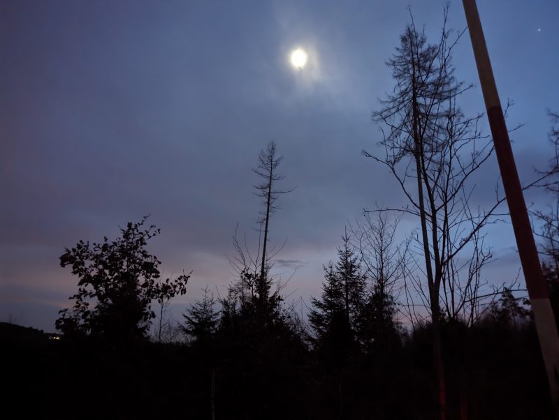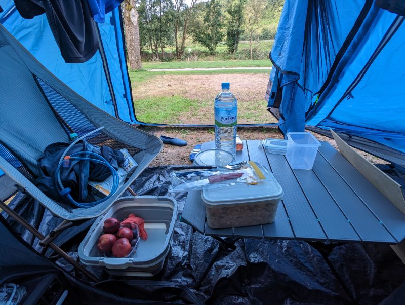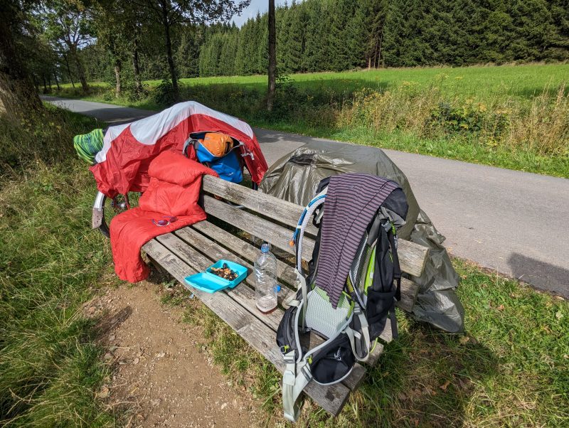 In der Nacht gab es dann ordentlich Wasser von oben, das Zelt hatte damit keine Probleme. Ich am nächsten Morgen schon, denn mit der Zeltplane wurde auch gefühlte 2 kg Wassertropfen eingepackt.