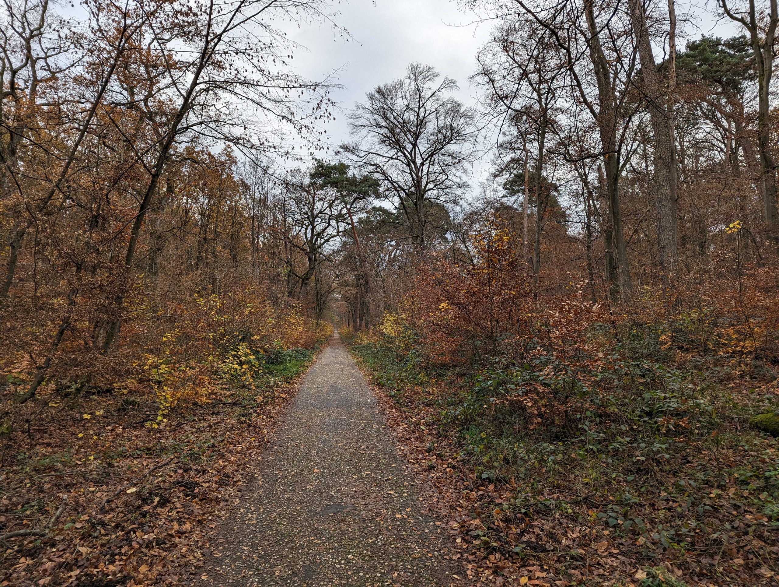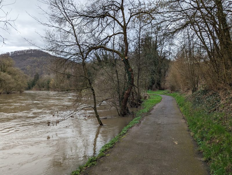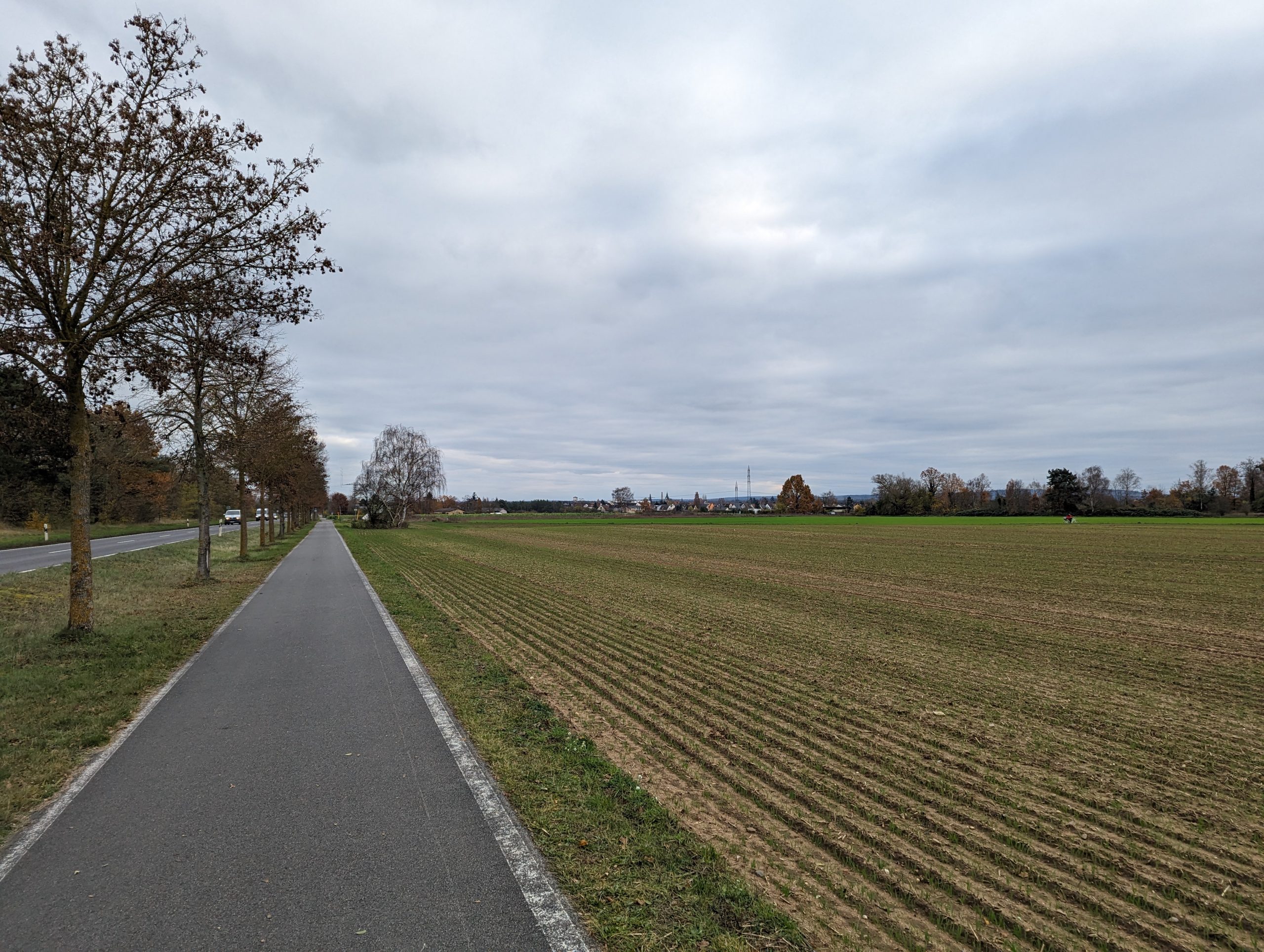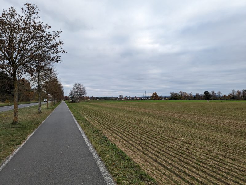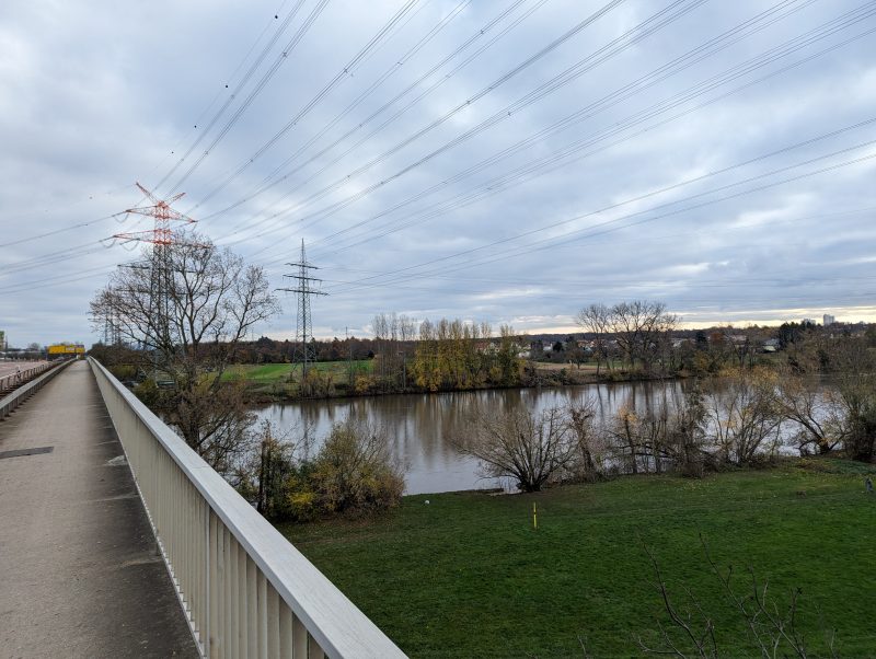 Das mit dem E-Bike im Winter zur Vermeidung von Schwitznässe und anschliessenden Frierattacken hat sich dann an zwei aufeinander folgenden trockenen Tagen (eine echte Seltenheit im Herbst 2023) Ende November doch noch realisieren lassen. Da die Gesamtstrecke dafür zu lang war erfolgte eine Kürzung durch eine Fahrt mit dem Auto nach Kriftel. Von dort über die bekannte Hoechst-Strecke sind es noch 108 Kilometer, gerade kurz genug, um lange Dunkelfahrten und Überlastung zu vermeiden.