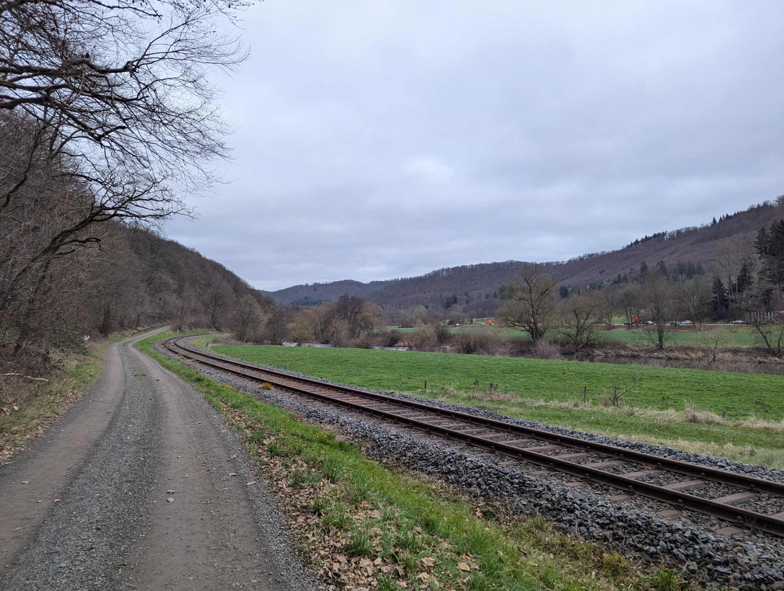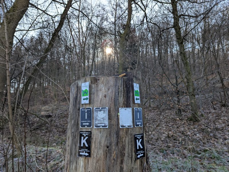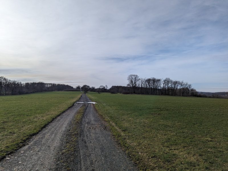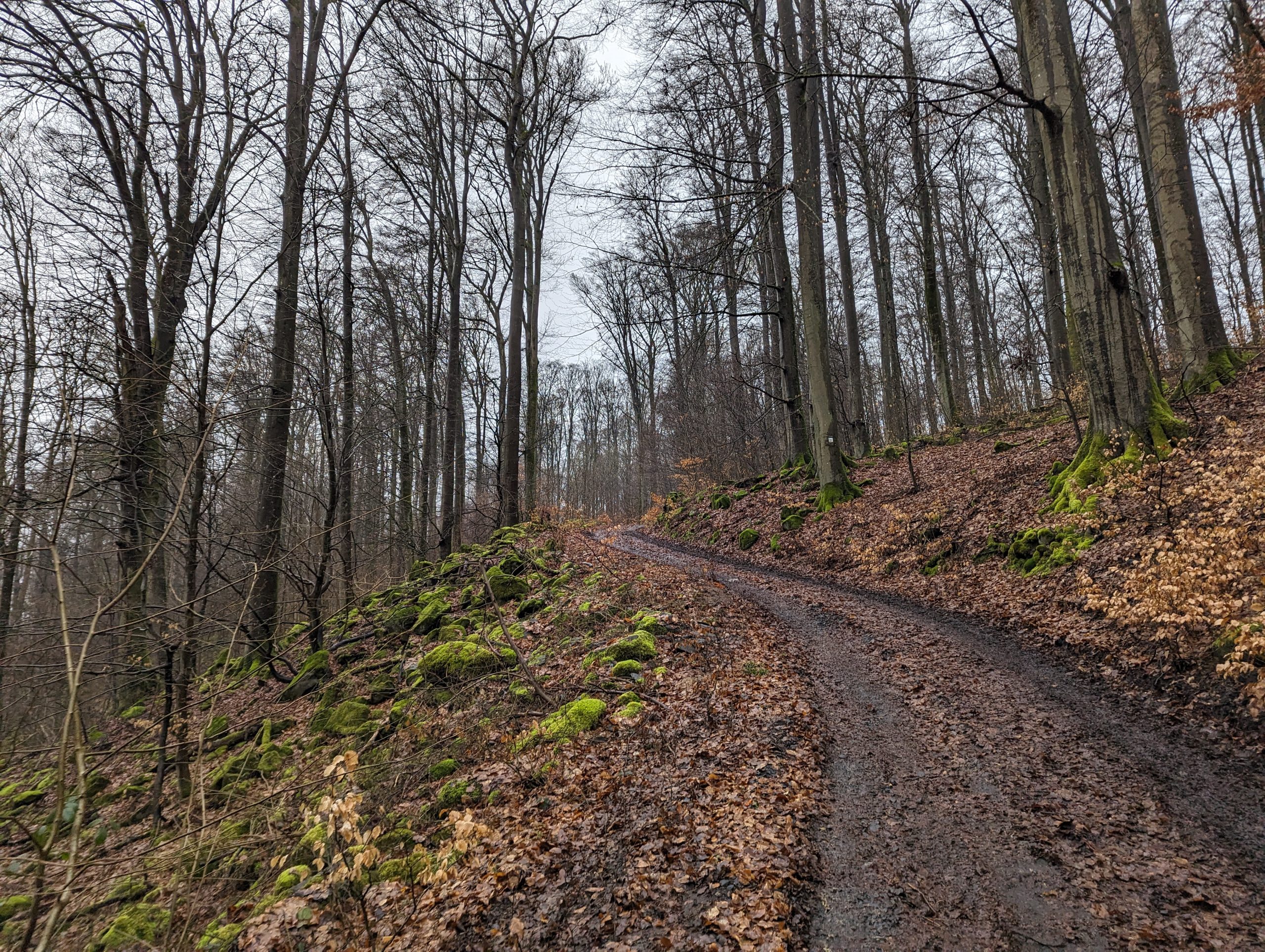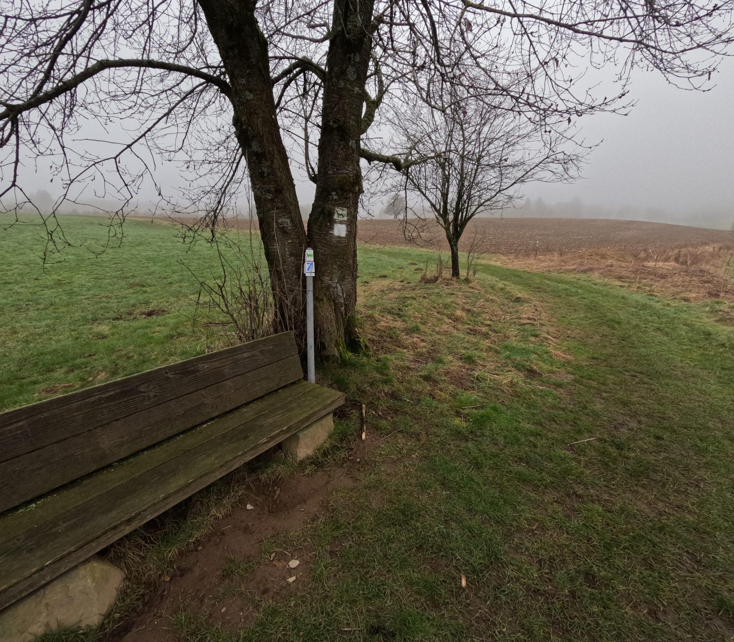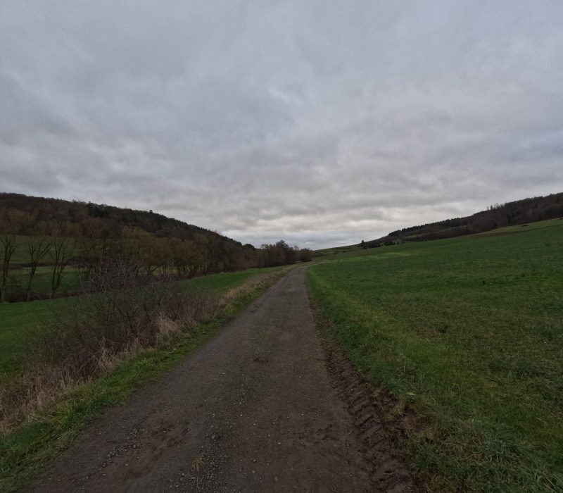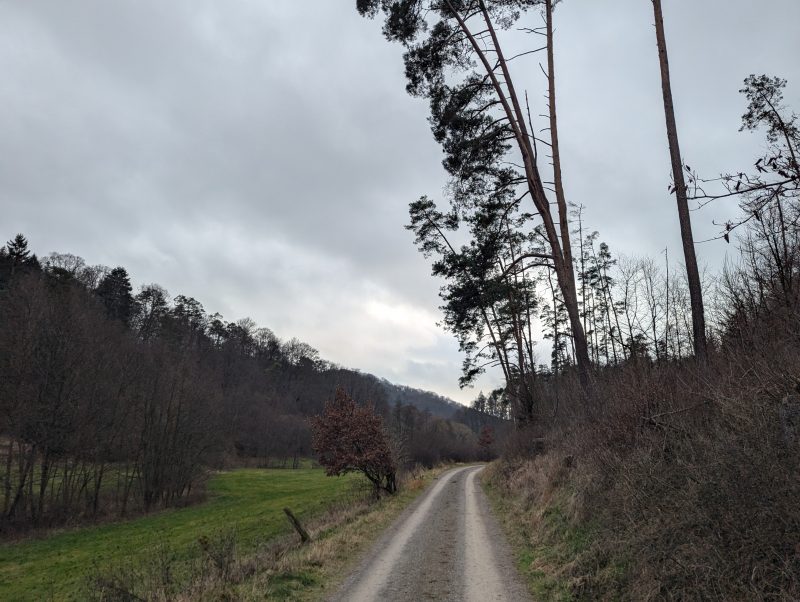 An einem der ersten Märztage im Jahre 2024 sieht es sehr nach November aus. Die Teilstrecke West der Etappe 5 geht über bekanntes Gelände mit eher leichten Steigungen ganz in der Nähe von Kunidorf vorbei. Den Weg von Rothenbach nach Freilingen wir mit Kunigunde gelaufen und zurück geht es dann allein. Nach der Radtour am Vortag droht am Anfang auf den Trailstreckenteilen das rechte Knie, das lässt dann aber durch kontrollierte Laufbewegungen nach. Die rechte Fußsohle hat einen scherzenden Riß aufgeboten und der rechte kleine Zeh meckert trotz Tapeverband vor sich hin.