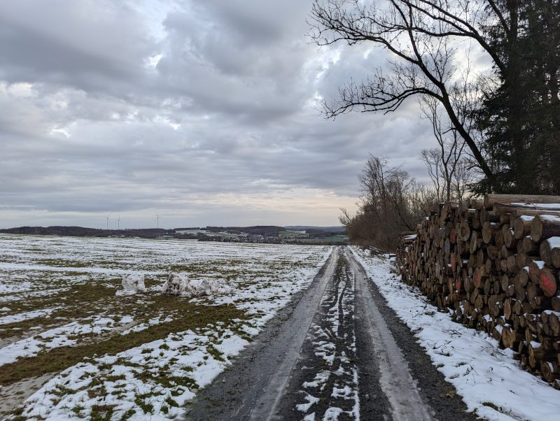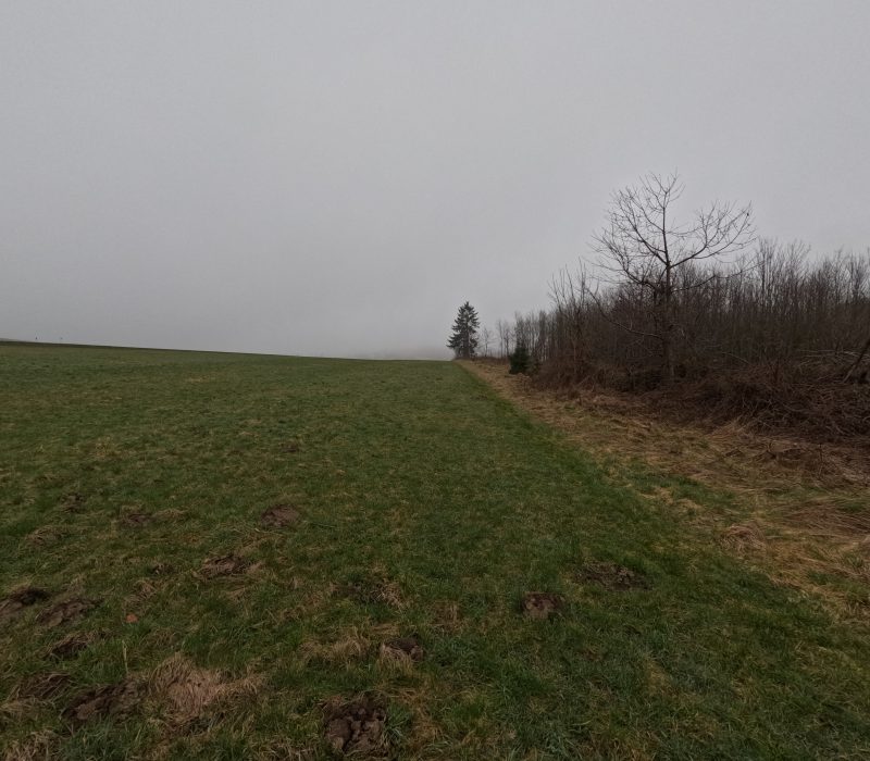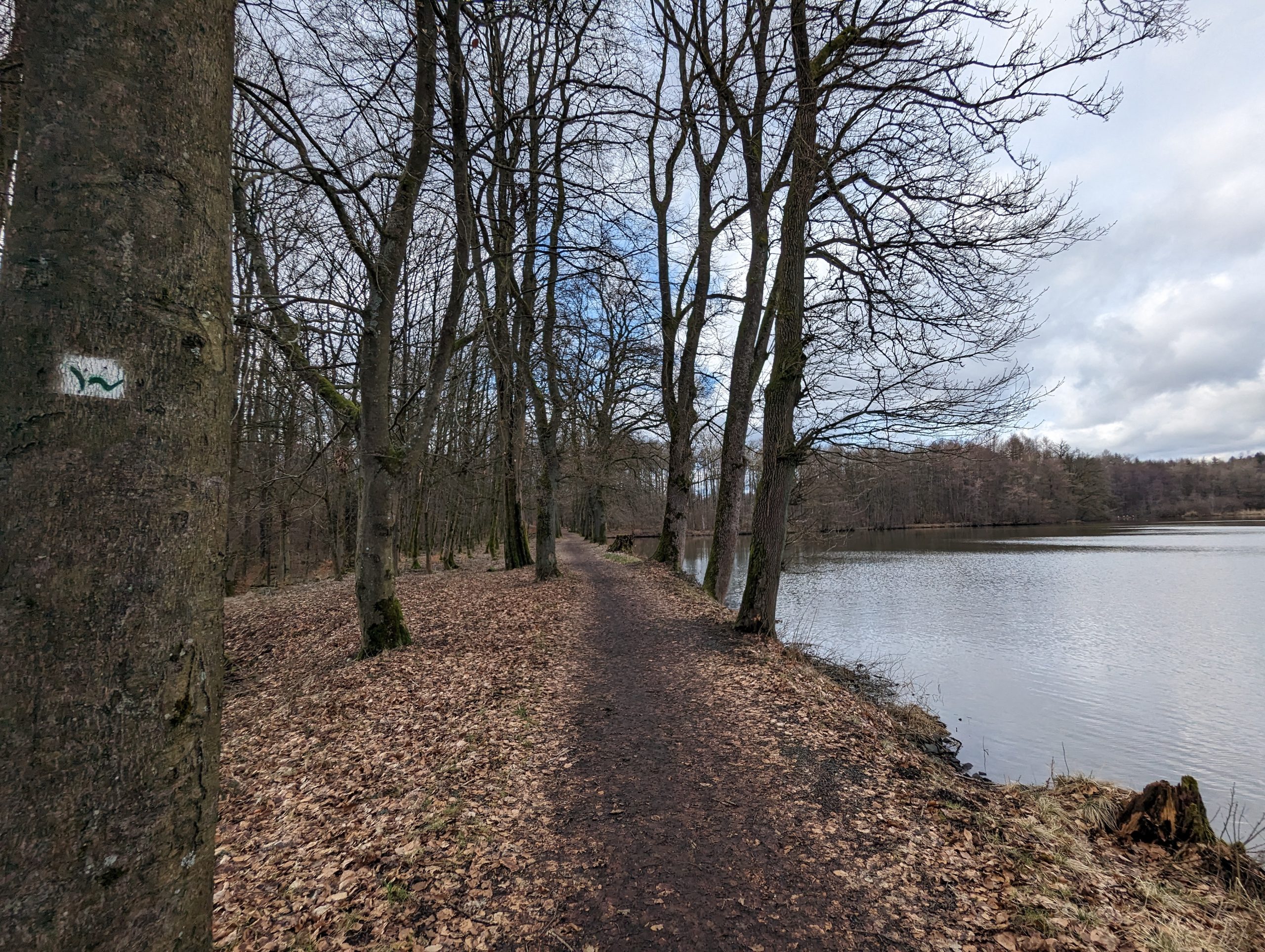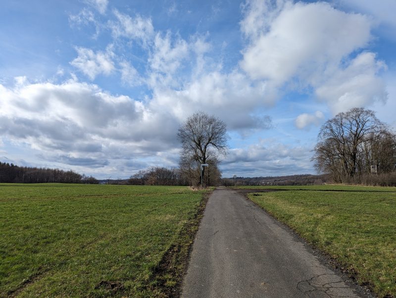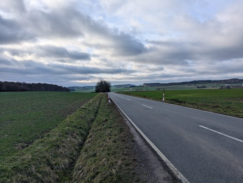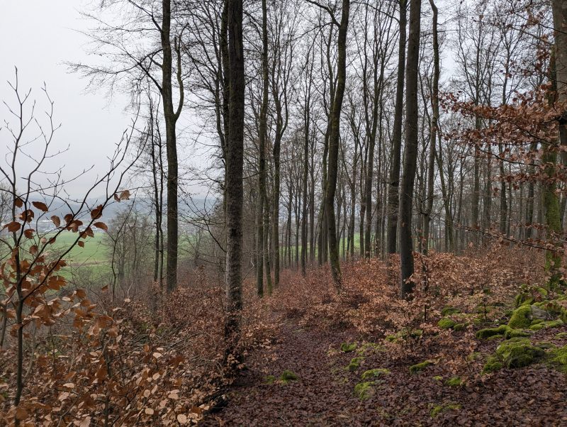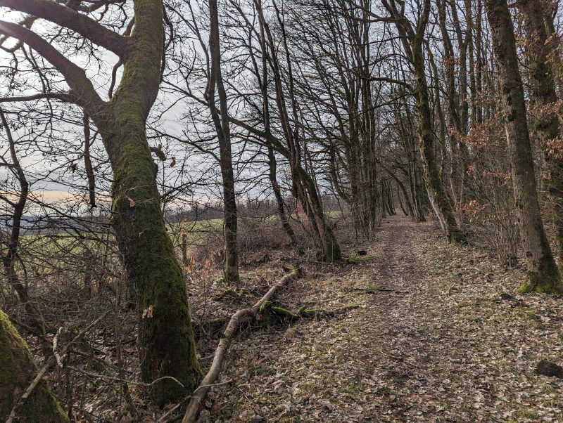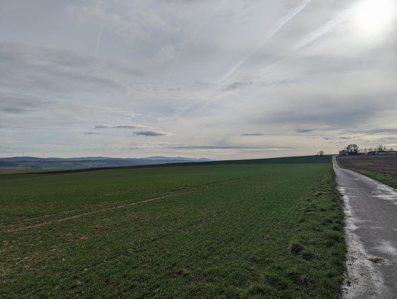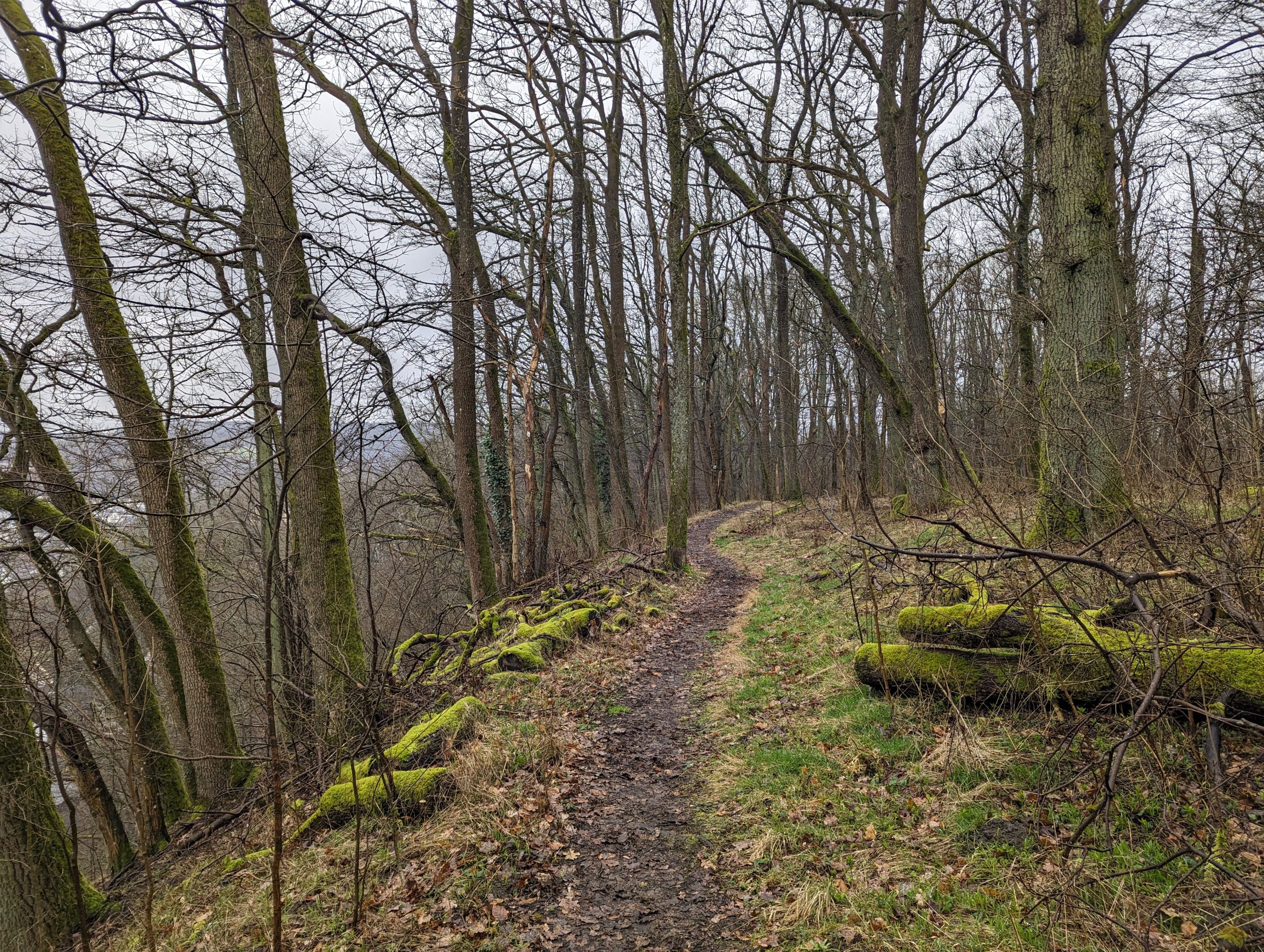 An einem der ersten Märztage im Jahre 2024 sieht es sehr nach November aus. Die Teilstrecke West der Etappe 5 geht über bekanntes Gelände mit eher leichten Steigungen ganz in der Nähe von Kunidorf vorbei. Den Weg von Rothenbach nach Freilingen wir mit Kunigunde gelaufen und zurück geht es dann allein. Nach der Radtour am Vortag droht am Anfang auf den Trailstreckenteilen das rechte Knie, das lässt dann aber durch kontrollierte Laufbewegungen nach. Die rechte Fußsohle hat einen scherzenden Riß aufgeboten und der rechte kleine Zeh meckert trotz Tapeverband vor sich hin.