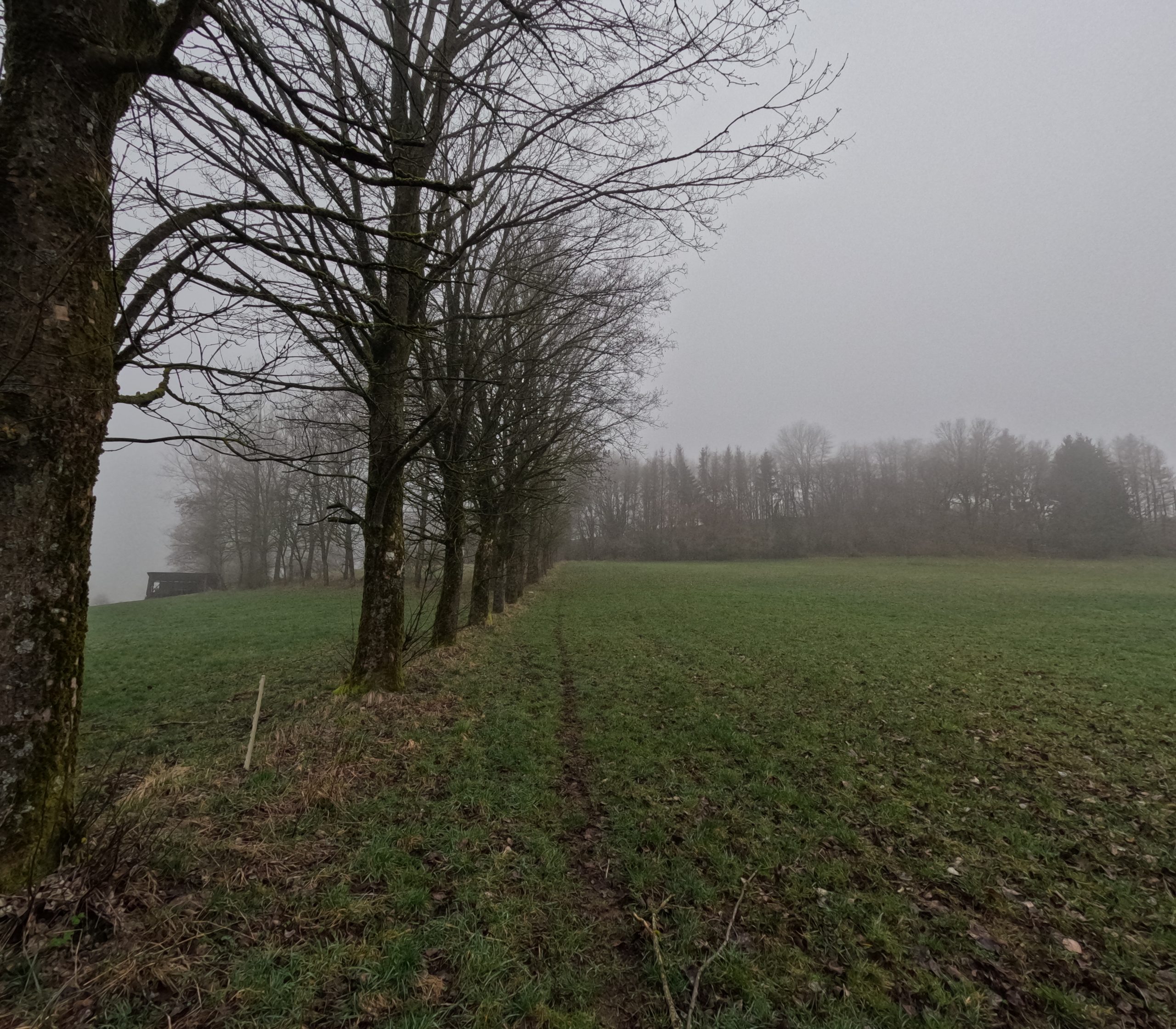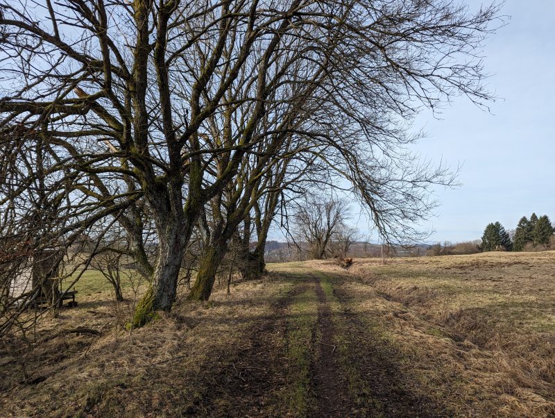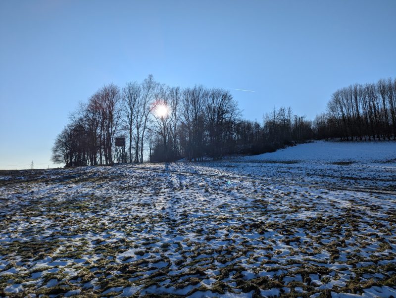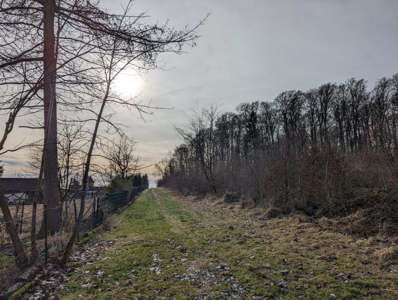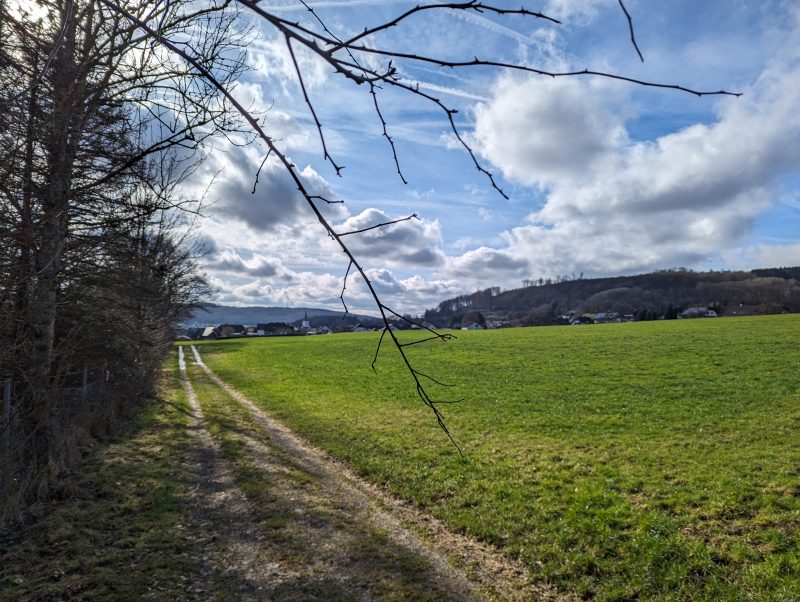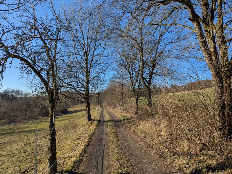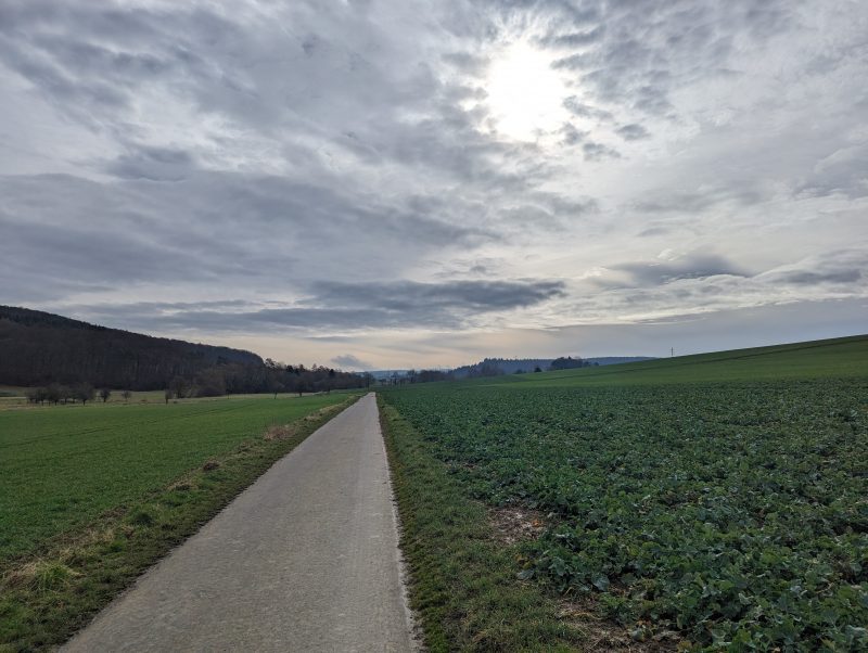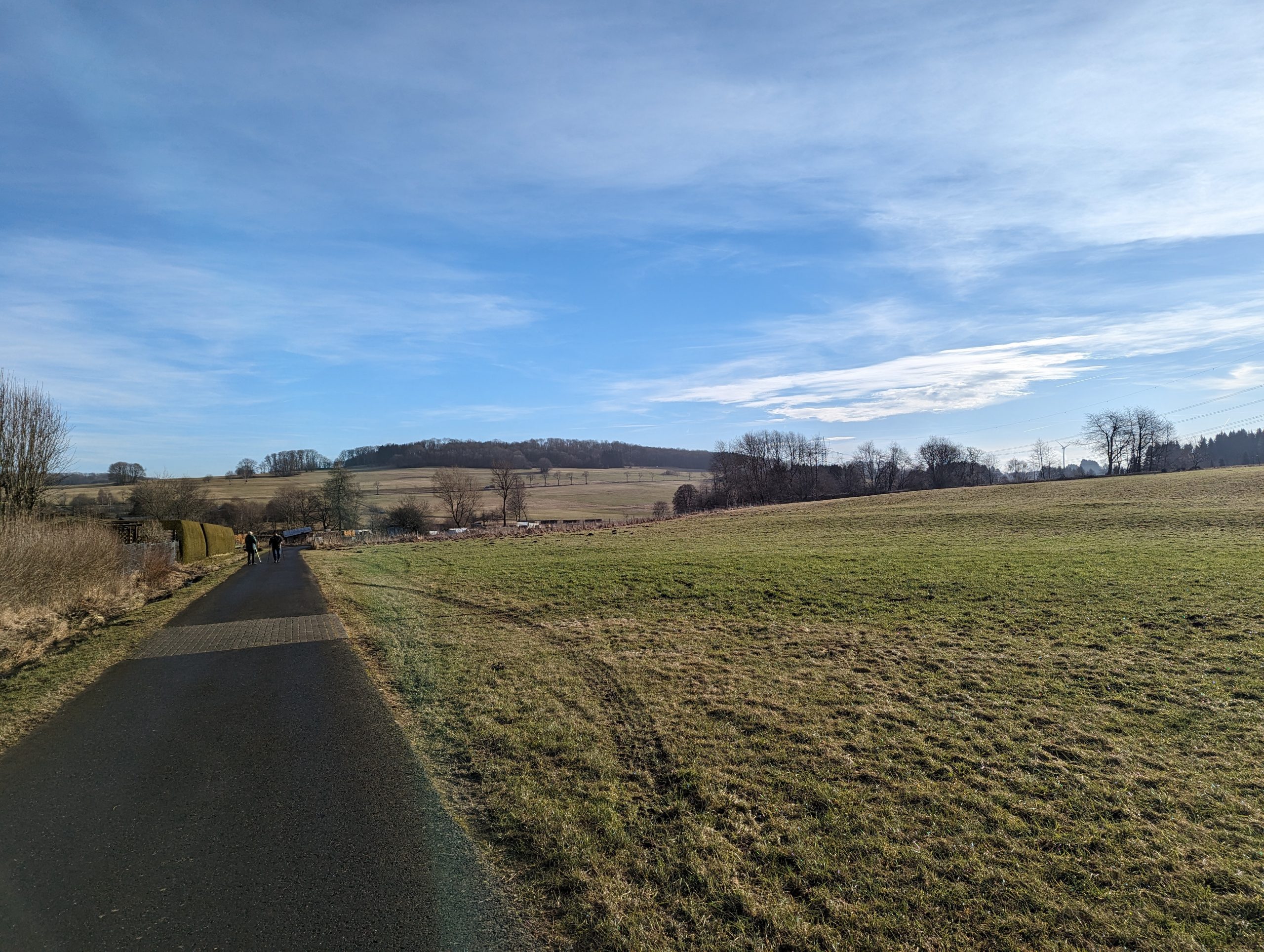 An einem kalten aber heiterem Februar war nach Mittag ein Zeitfenster im Regenwolkenrennen dieses Winters regenfrei. Die nächste Etappe schnell mit Stöcken gelaufschlurft. Die Wiesenwege waren für die erstmalig ausprobierten Joe Nimble Trailschuhe aber zu flach, ein abmatschen war nicht an allen Stellen zu vermeiden. Die Schuhe hatten Grip, aber waren innen in Kombination mit den gewählten Socken etwas rutschig. Das Laufgefühl war gut und der rechte Zeh hat sich nicht besonders gemeldet.