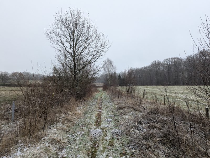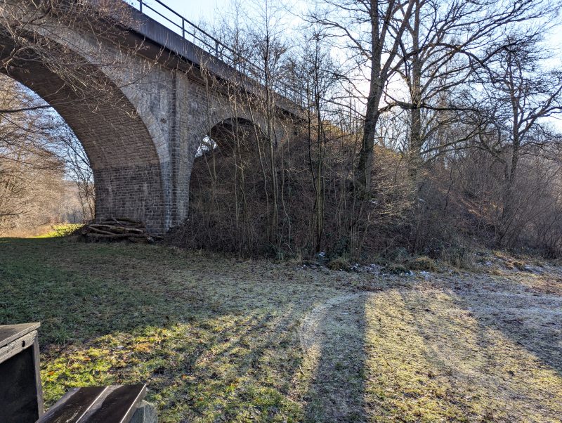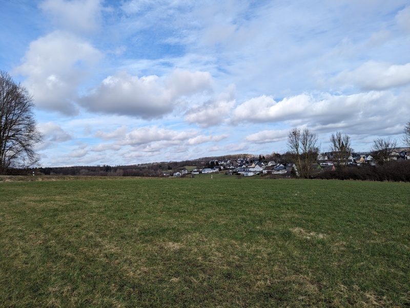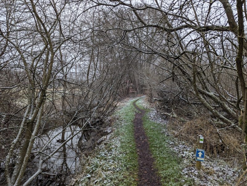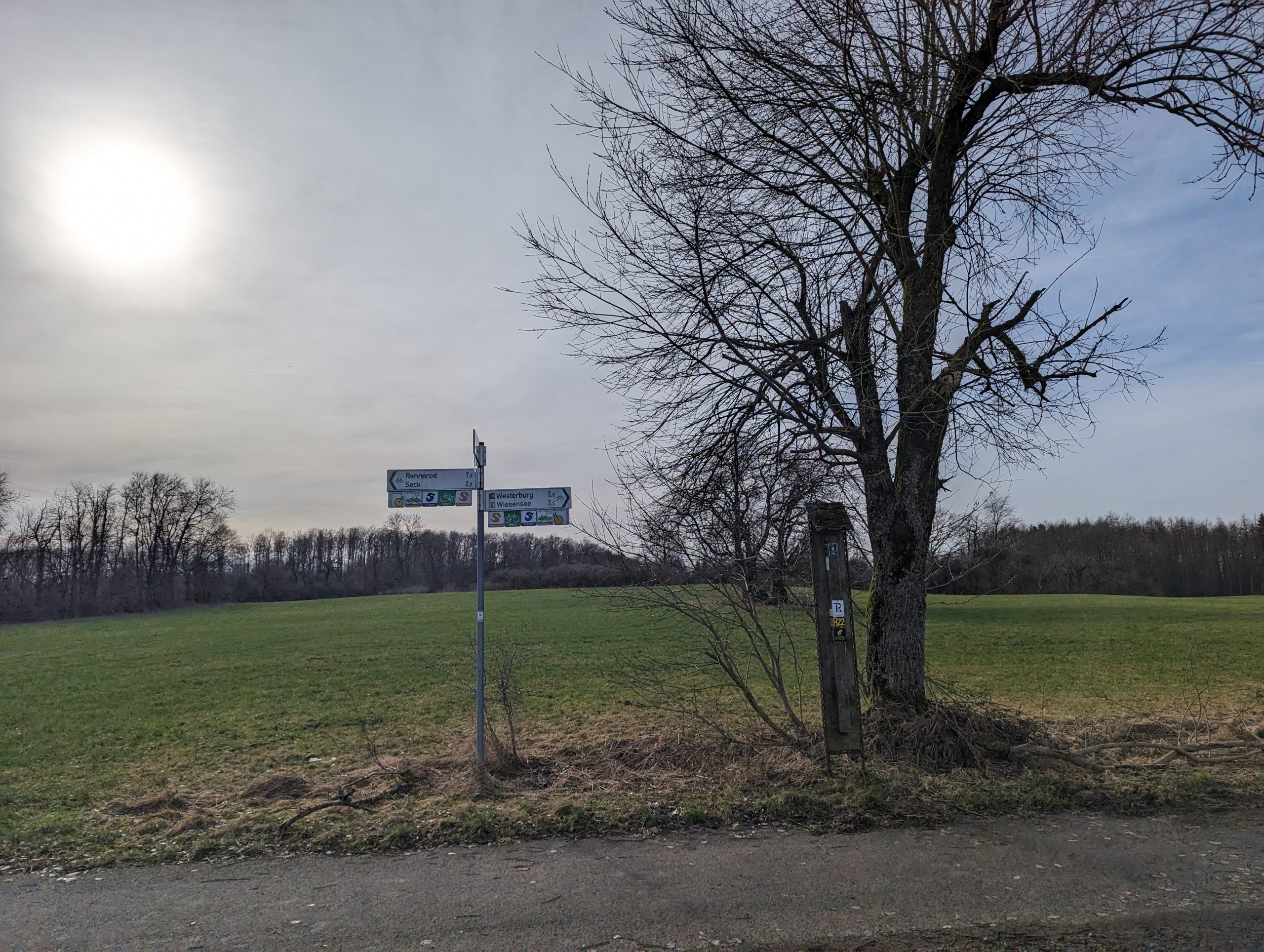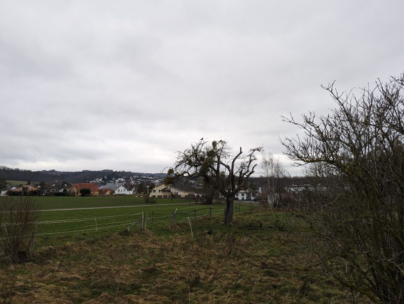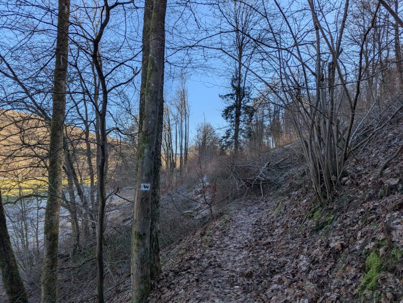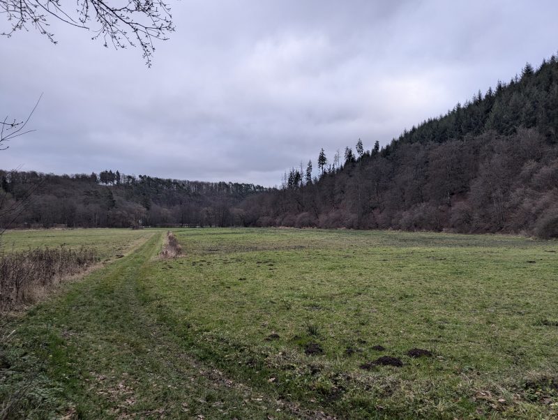 An einem kalten aber heiterem Februar war nach Mittag ein Zeitfenster im Regenwolkenrennen dieses Winters regenfrei. Die nächste Etappe schnell mit Stöcken gelaufschlurft. Die Wiesenwege waren für die erstmalig ausprobierten Joe Nimble Trailschuhe aber zu flach, ein abmatschen war nicht an allen Stellen zu vermeiden. Die Schuhe hatten Grip, aber waren innen in Kombination mit den gewählten Socken etwas rutschig. Das Laufgefühl war gut und der rechte Zeh hat sich nicht besonders gemeldet.