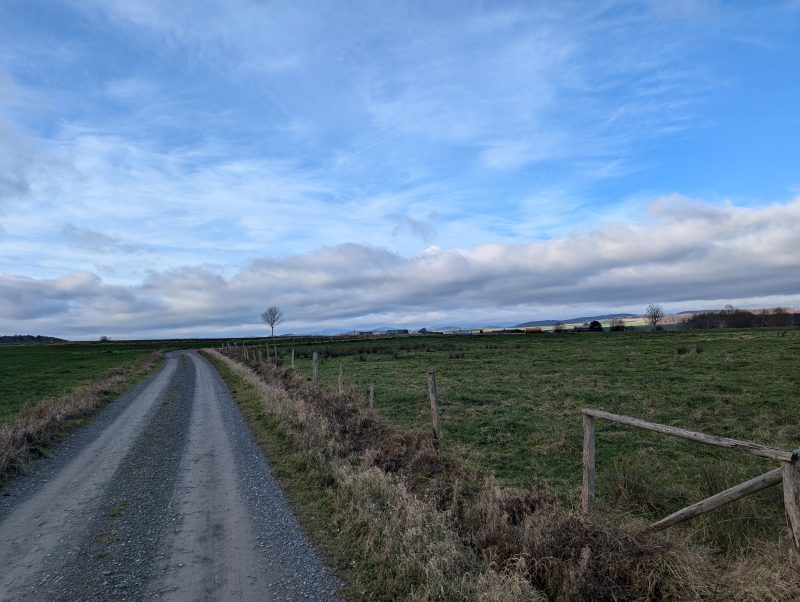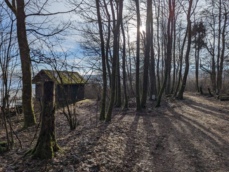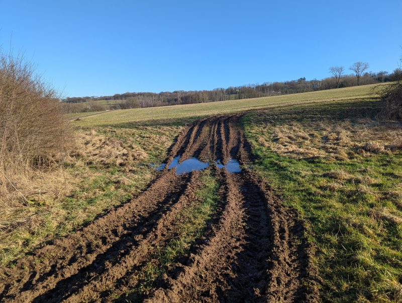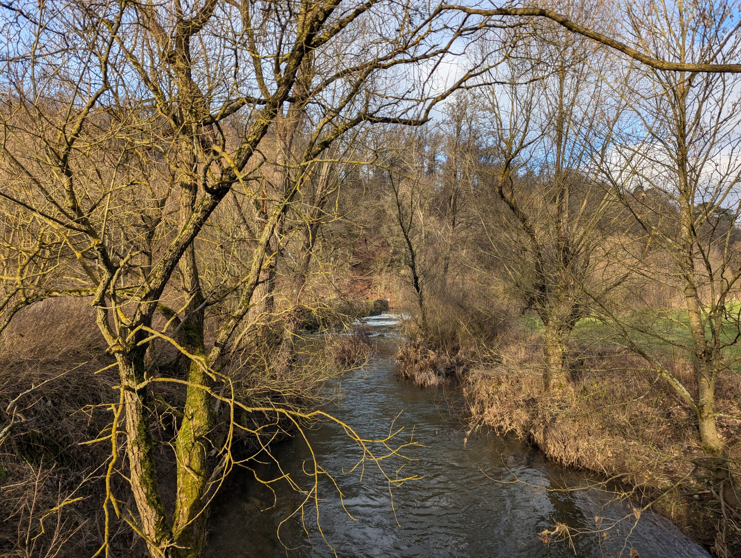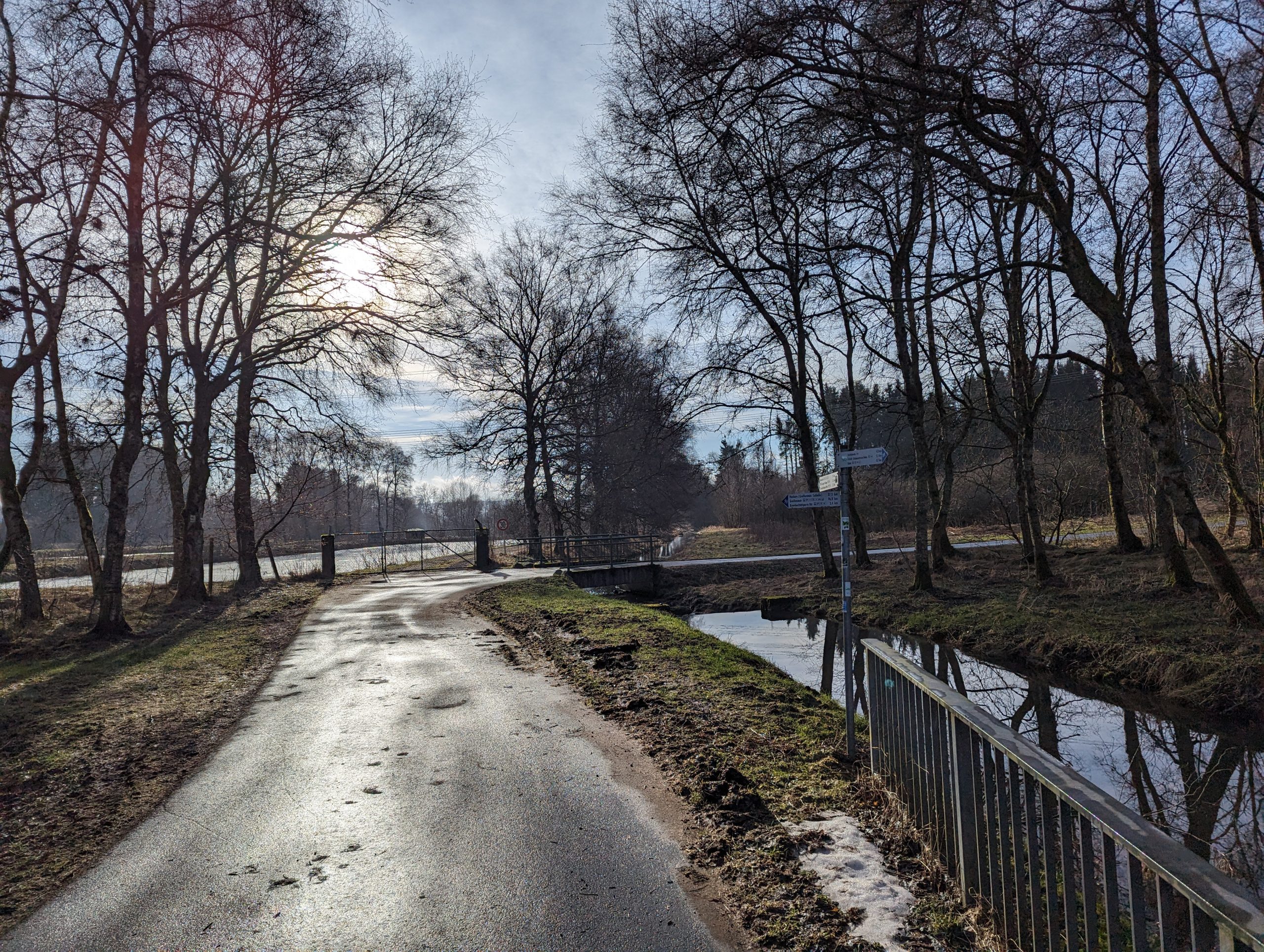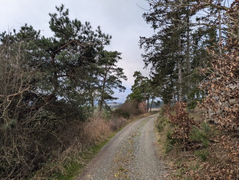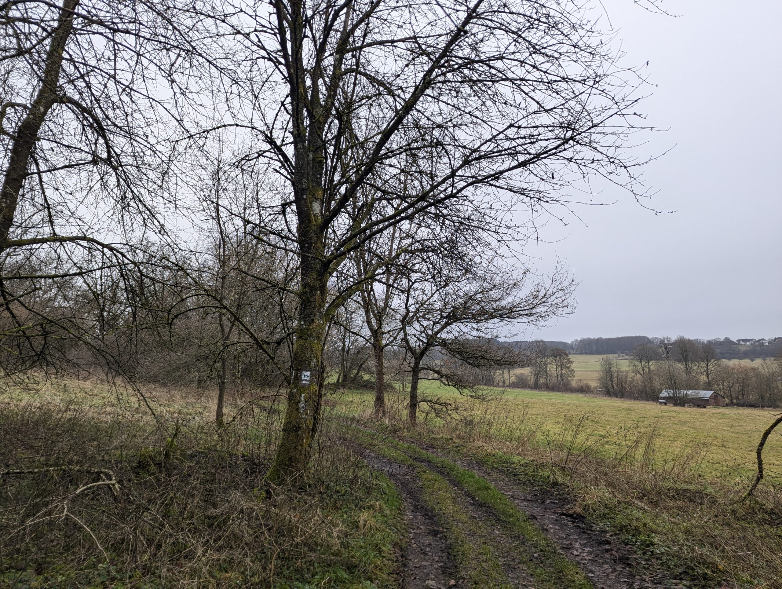 An einem kalten aber heiterem Februar war nach Mittag ein Zeitfenster im Regenwolkenrennen dieses Winters regenfrei. Die nächste Etappe schnell mit Stöcken gelaufschlurft. Die Wiesenwege waren für die erstmalig ausprobierten Joe Nimble Trailschuhe aber zu flach, ein abmatschen war nicht an allen Stellen zu vermeiden. Die Schuhe hatten Grip, aber waren innen in Kombination mit den gewählten Socken etwas rutschig. Das Laufgefühl war gut und der rechte Zeh hat sich nicht besonders gemeldet.