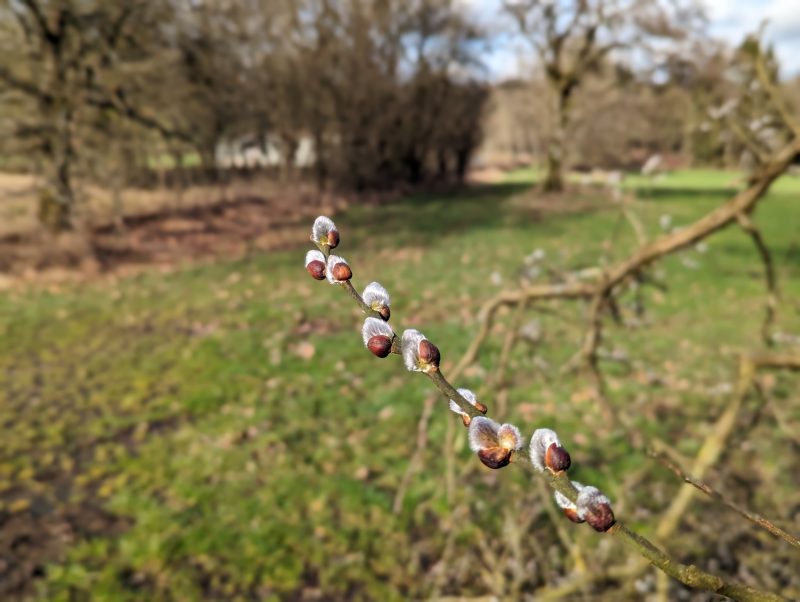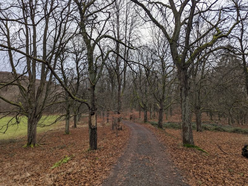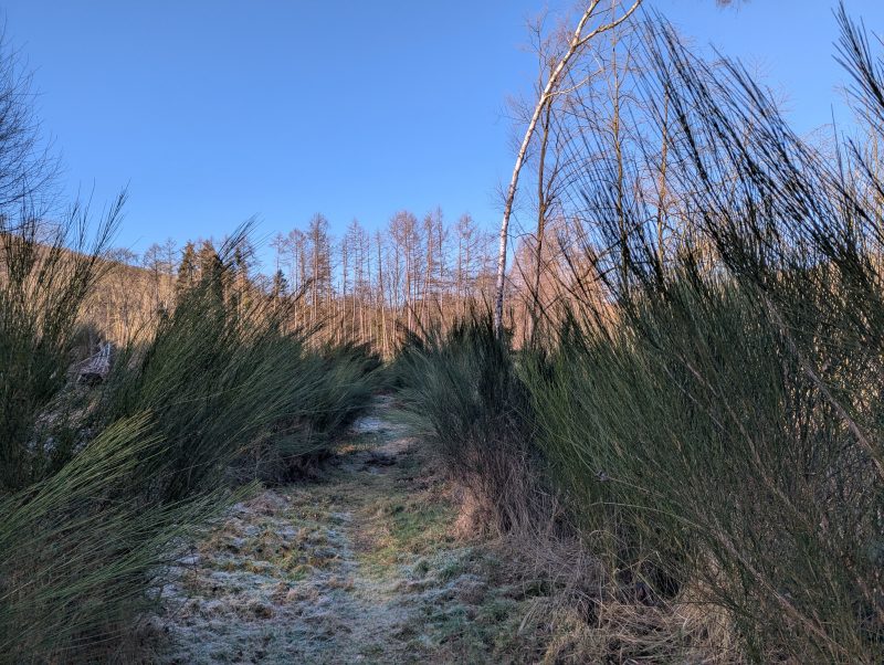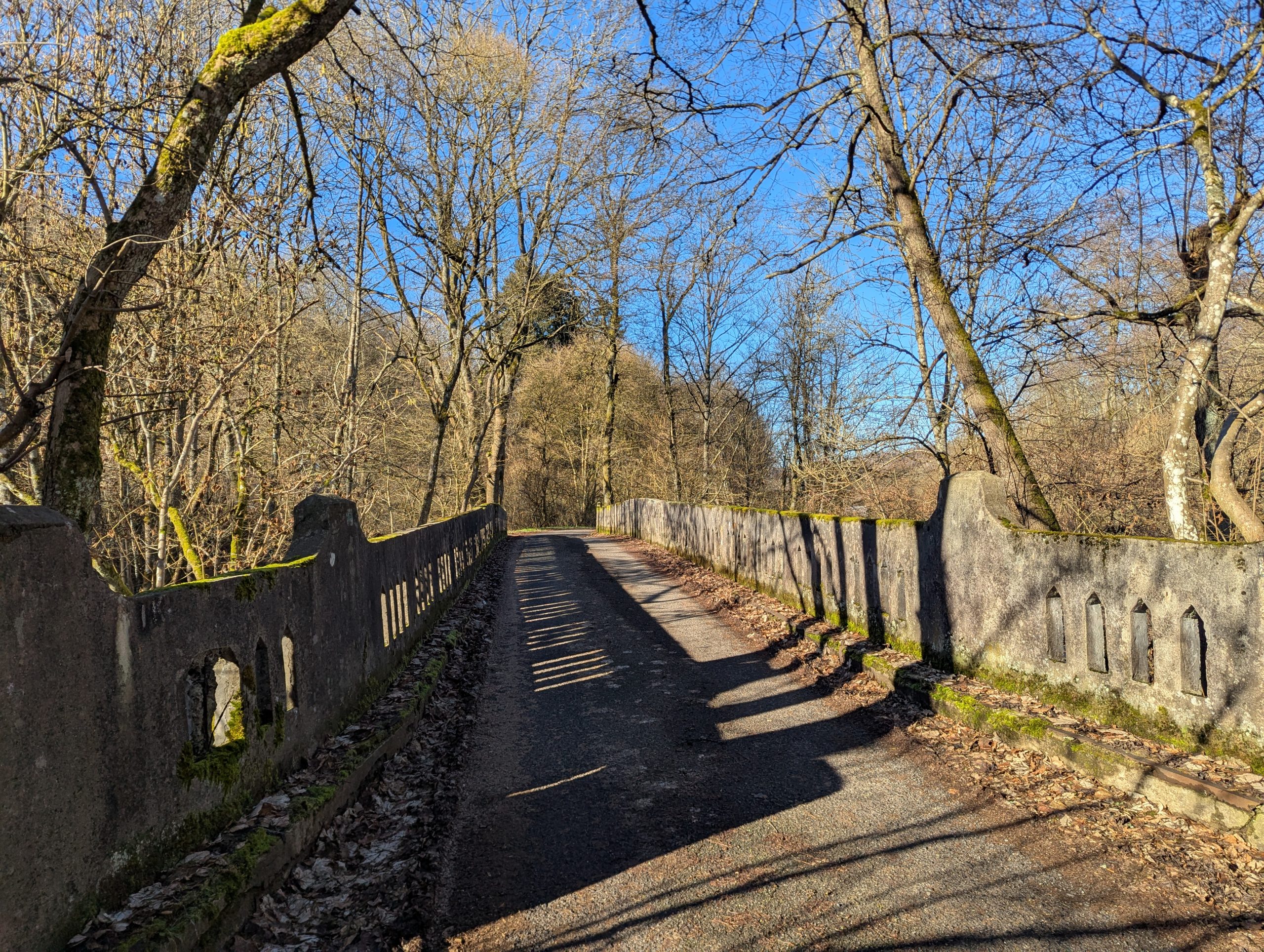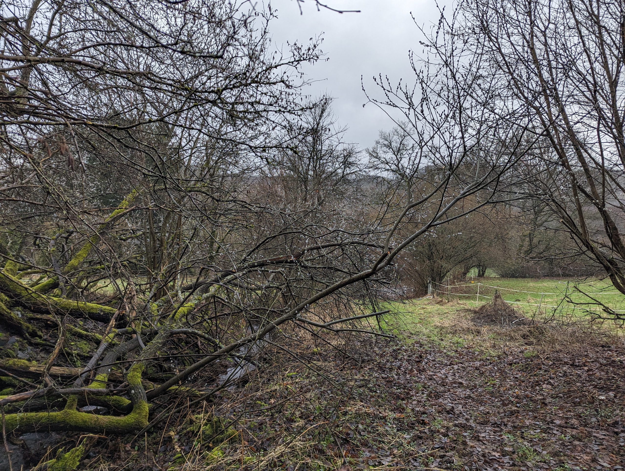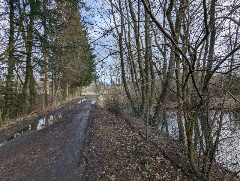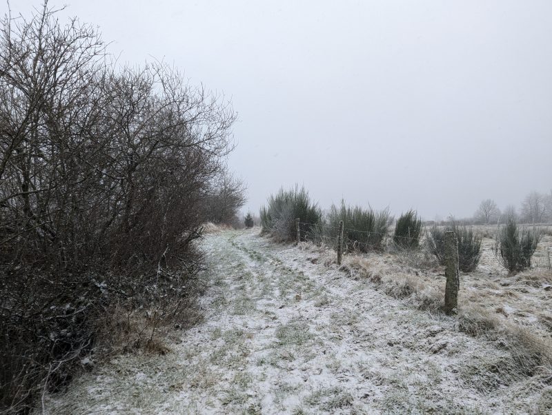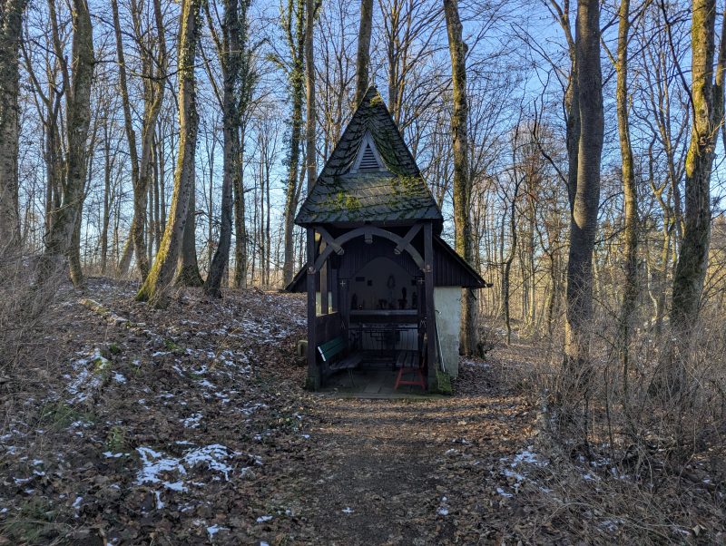 An einem kalten aber heiterem Februar war nach Mittag ein Zeitfenster im Regenwolkenrennen dieses Winters regenfrei. Die nächste Etappe schnell mit Stöcken gelaufschlurft. Die Wiesenwege waren für die erstmalig ausprobierten Joe Nimble Trailschuhe aber zu flach, ein abmatschen war nicht an allen Stellen zu vermeiden. Die Schuhe hatten Grip, aber waren innen in Kombination mit den gewählten Socken etwas rutschig. Das Laufgefühl war gut und der rechte Zeh hat sich nicht besonders gemeldet.
