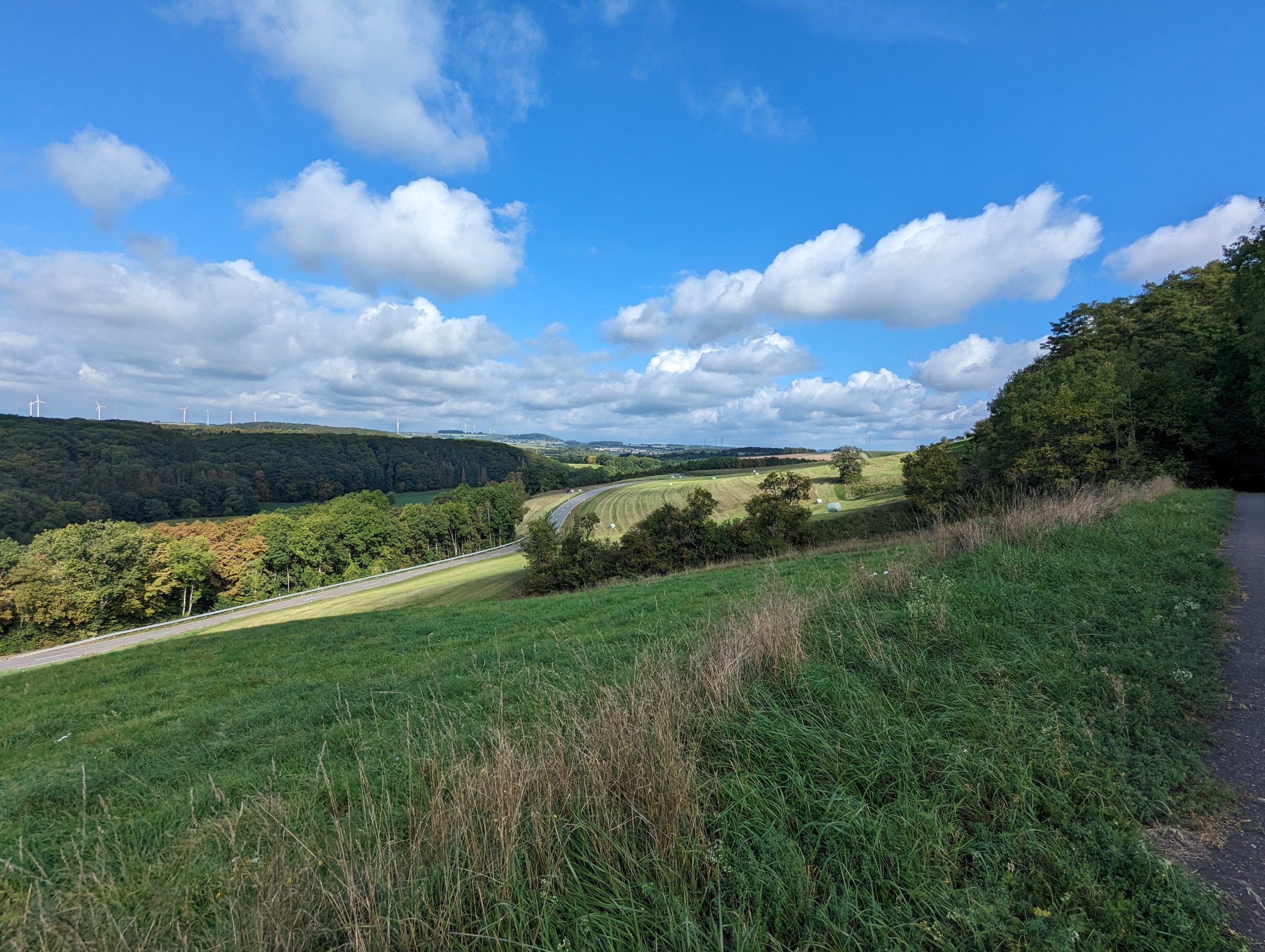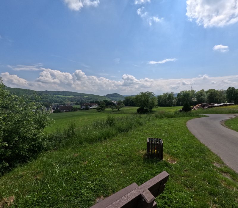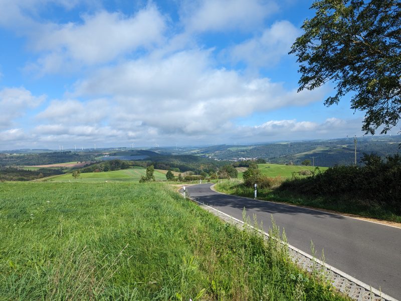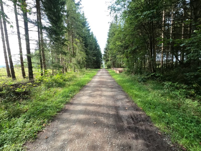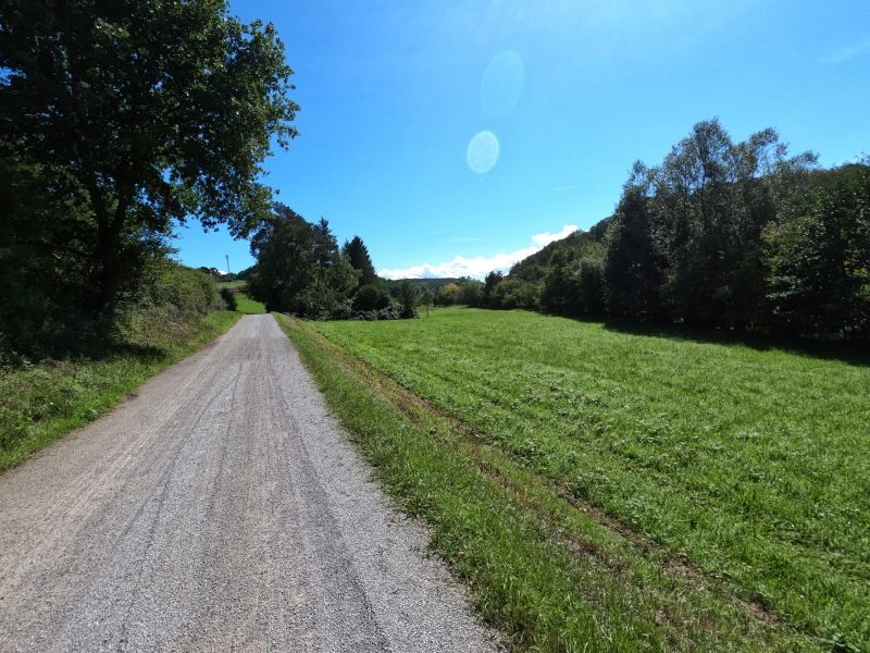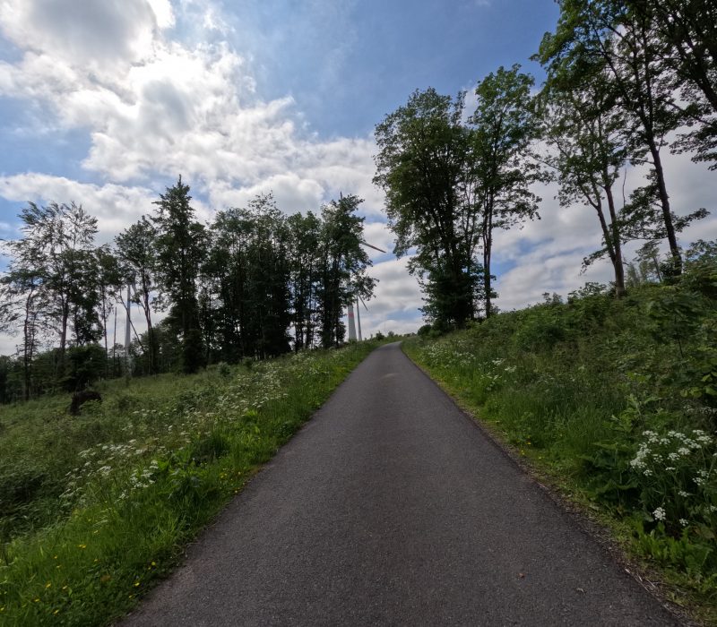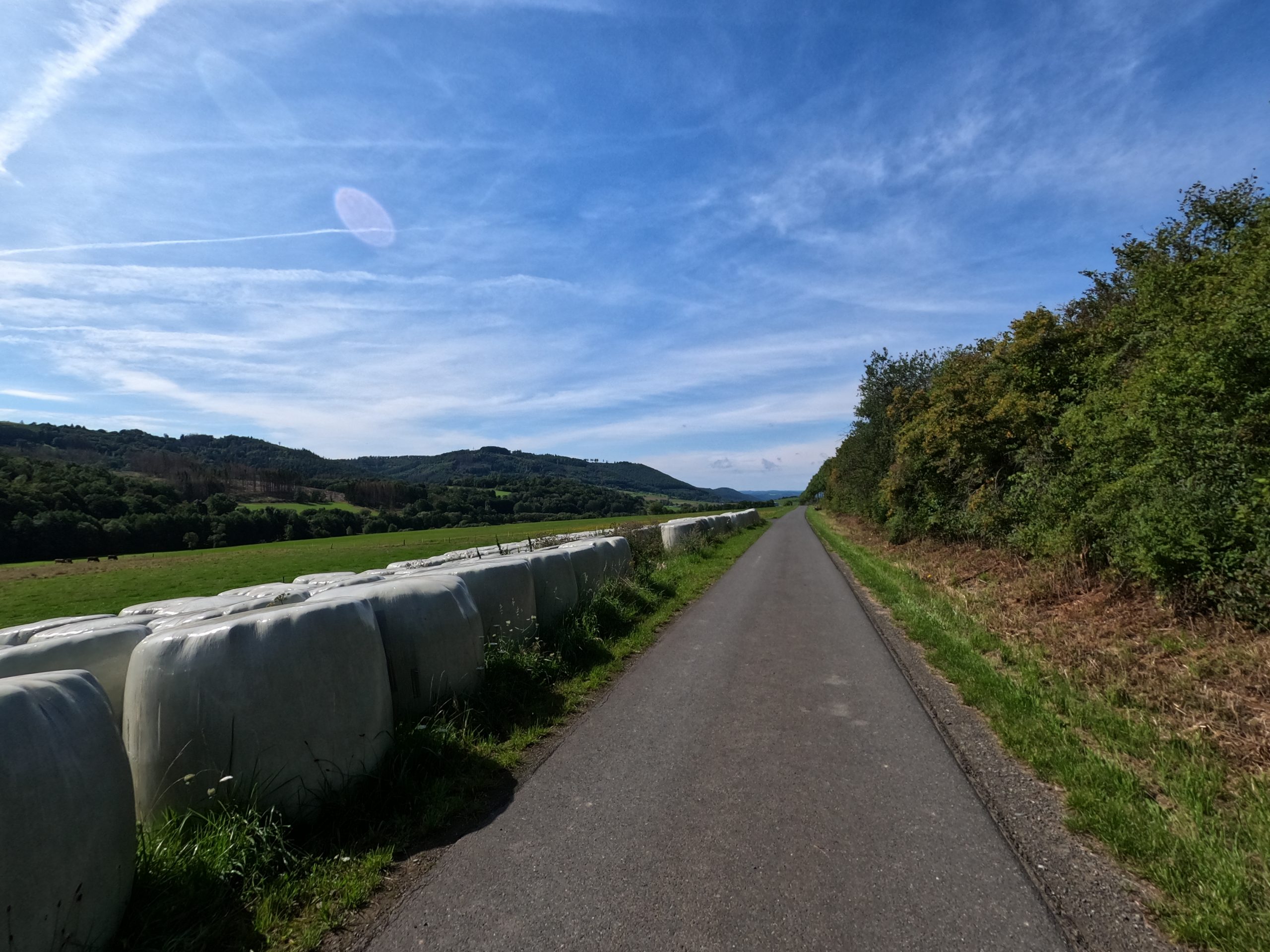 Es ist immer noch warm und der zweite Tandemtest bietet wieder eine Mischung aus Fahr- und Schiebestrecken. Häufig Aussicht, mal etwas Wald ist die Landschaft nach dem Nisterabzweig übersichtlicher und die Wege sind nicht so pfadig und daher gibt es nicht so viele Umleitungen auf dem Westerwaldsteig, weil wir das Rad dabei haben.