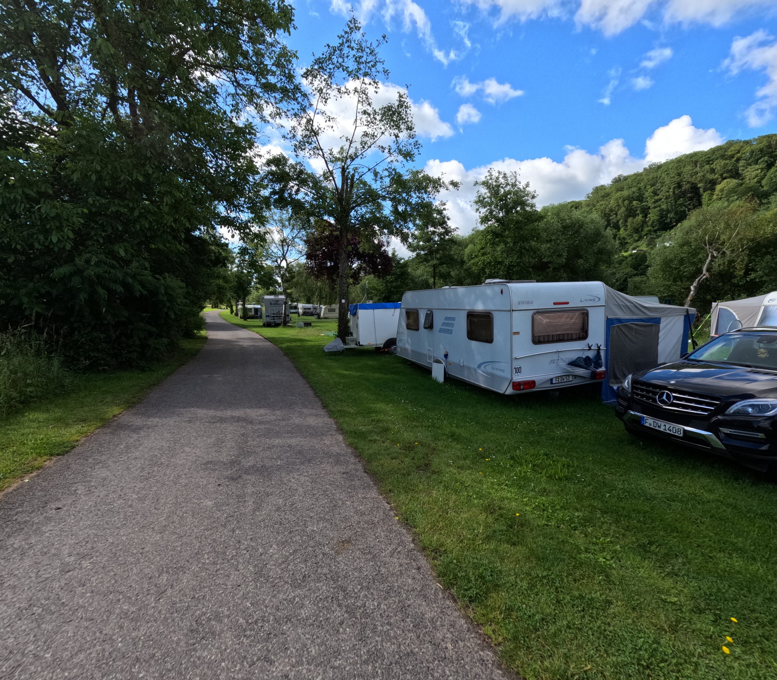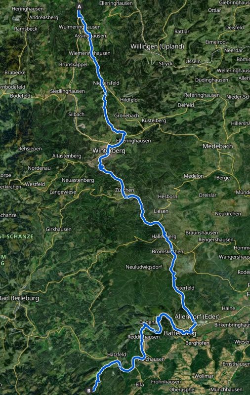 Der Campingpark Teichmann zwischen Bahnstrecke, Eder und B252 im Edertal. Einen Bäcker gibt es in der näheren Umgebung nicht. Aber in Schmittlotheim gibt es einen kleinen Lebensmittelladen mit Bäckertheke, den man über den Ederradweg gut erreichen kann. Die 8 km Runde ist fast flach und überquer zweimal die Eder.