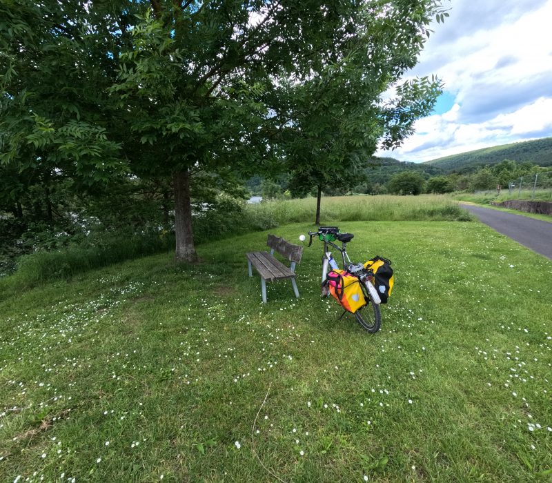 Die Variante mit Helinox Liege und aufgelegtem Zelt hat mit dem Marschall Rohloff Rad und dem sonstigen Urlaubsgepäck um die 55 kg auf die Waage gebracht. Die Fahrt rauf zum Knoten und zur Krombach Talsperre war machbar, wenn auch das Gewicht deutlich spürbar war. Am Campingplatz Wetzlar war es am Pfingstmontag noch voll bis ausgebucht und auf die Zeltwiese war gut belegt. Der Aufbau von Liege und Zelt war ok, die Nacht aber mit Lärm von der Lahnpromenade, einem penetranten Kukuck und in der Früh von der Straße waren unangenehm. Das Kopfkissen war mit und im Laufe der Nacht gab es Kopfschmerzen, die erst im laufe des nächsten Tage verschwanden. Abends kramen, Morgens kramen, in der Dusche kramen, hat alles funktioniert, aber wieder auf dem Rad stellte sich keine Freude ein. Immer größer werdendes Lagerspiel an der Gabel machten die schon des nachts begonnenen Gedanken zur Realität. Zurück, Aufgabe, es gibt keine Solo Radtouren mit Übernachtung im Zelt mehr, aus und vorbei, zu alt, zu gebrechlich als das es Spaß machen würde. Und mit dem E-Bike und dem Mehrgewicht ist es auch nicht besser.