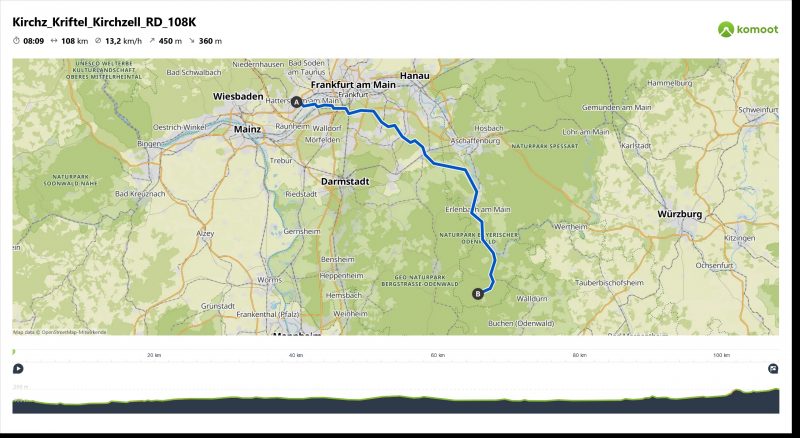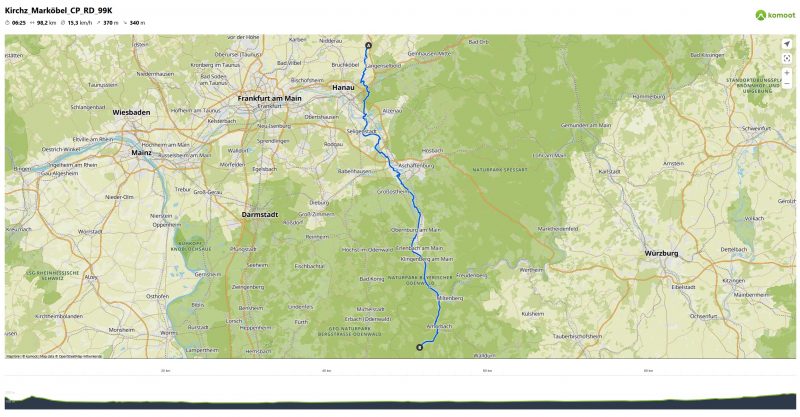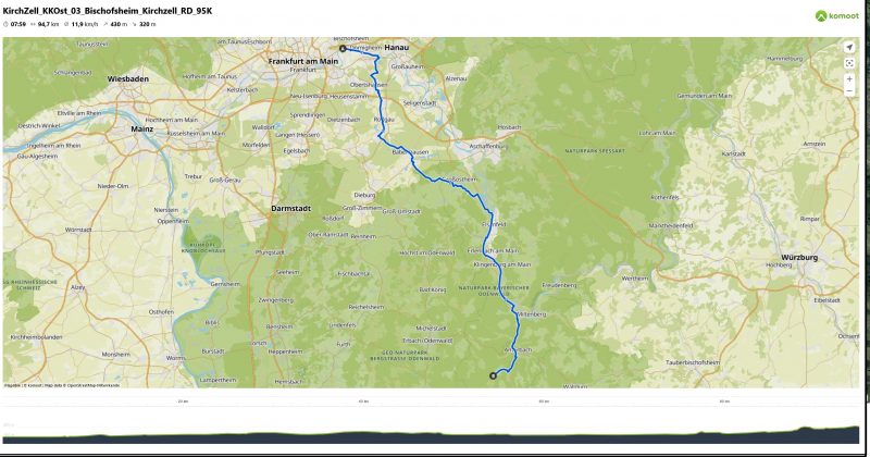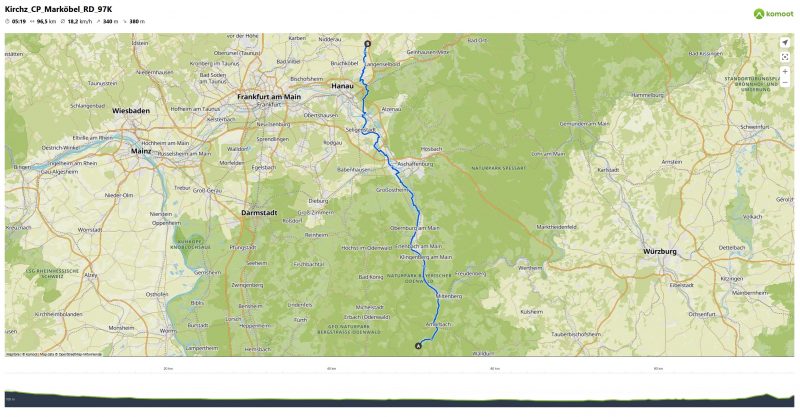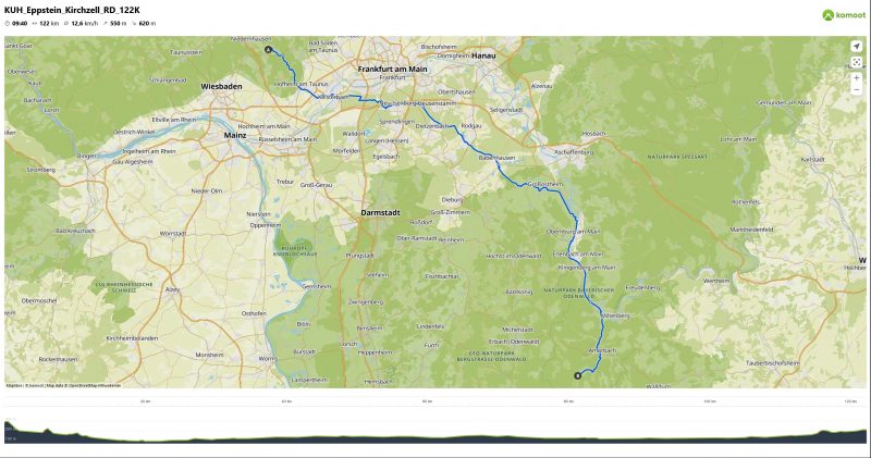 Auf der ersten Teilstrecke hat der Akku dann 94 Kilometer bis kurz hinter die Mainbrücke gereicht, obwohl auf der ersten Strecke bis Kriftel ordentlich Höhenmeter einschließlich einer R8 Umleitung bei Camberg zu erfahren waren. Allerdings waren da auch nicht mehr als 12 km/h drin.