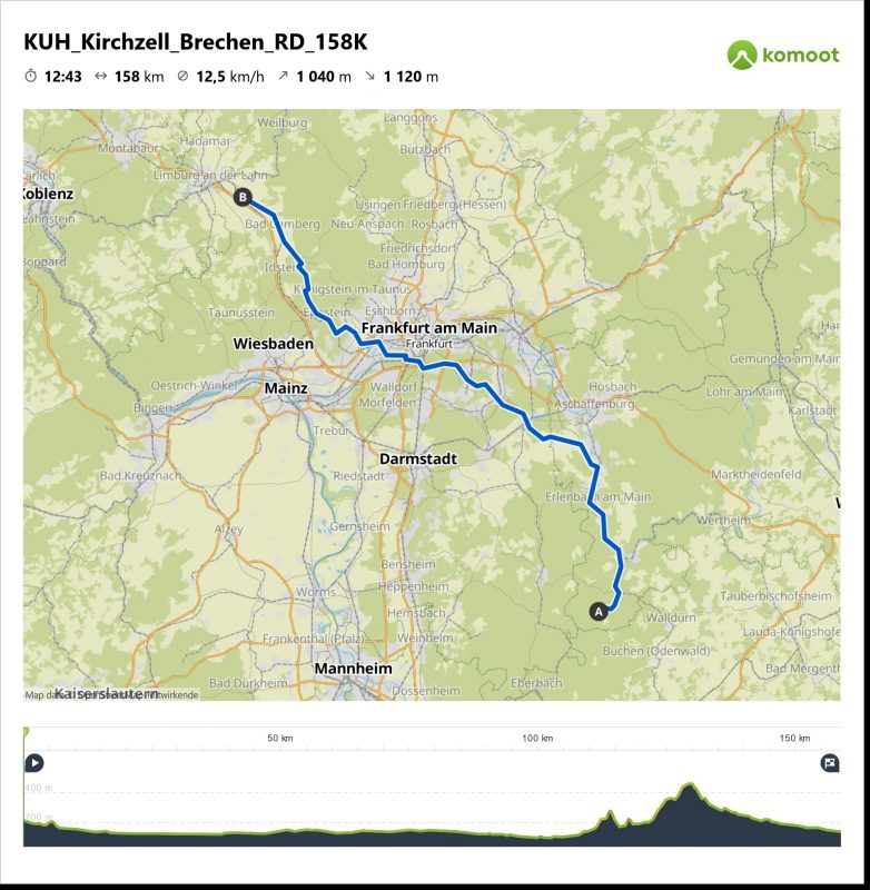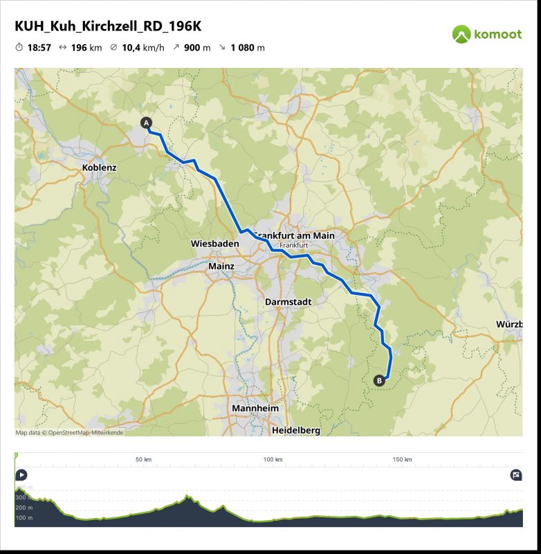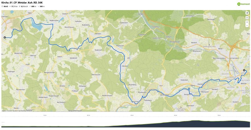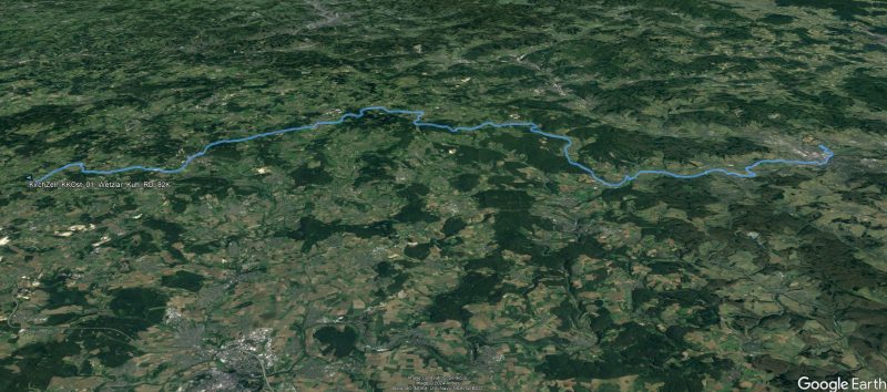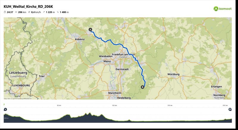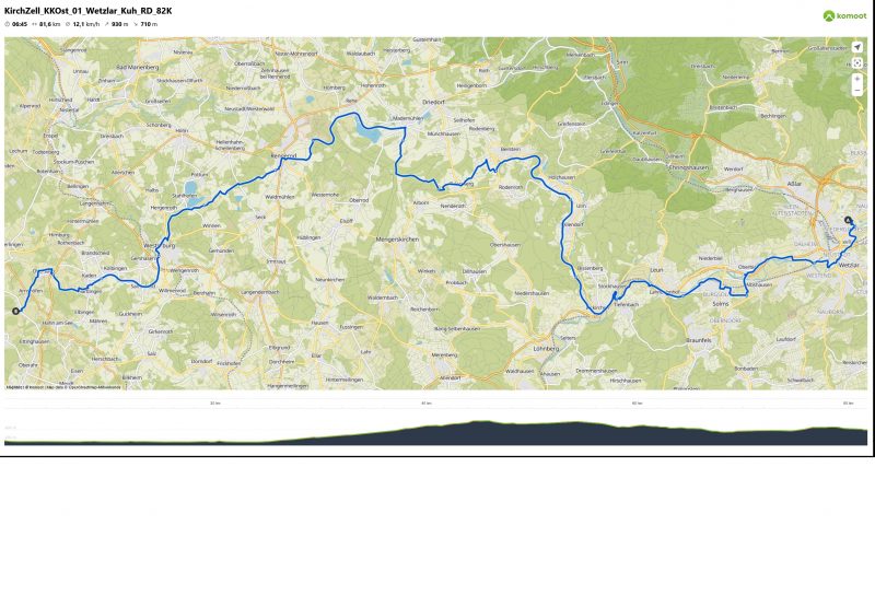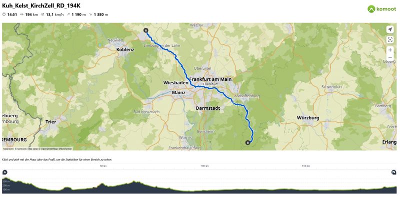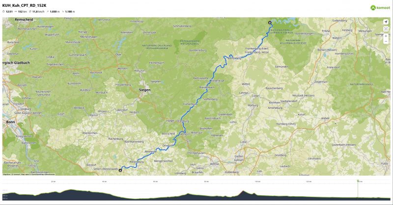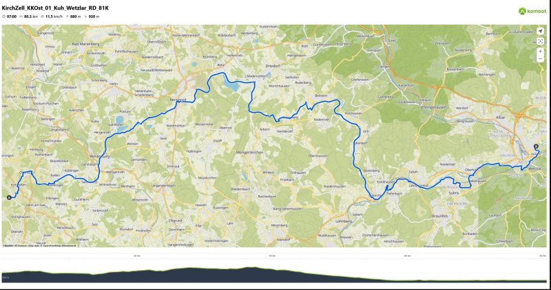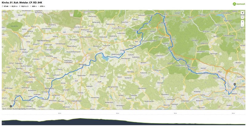 Leider ist wegen Unwetter im entsprechenden Zeitraum aus der Trainingstour nichts geworden. Bis auf eine Radtour vom ersten Campinplatz in Wetzlar zurück über das Ulmtal, Knoten, Rennerod, Wiesensee und Westerburg. Am nächsten Tag dann zurück, um das abgestelle Auto wieder abzuholen.