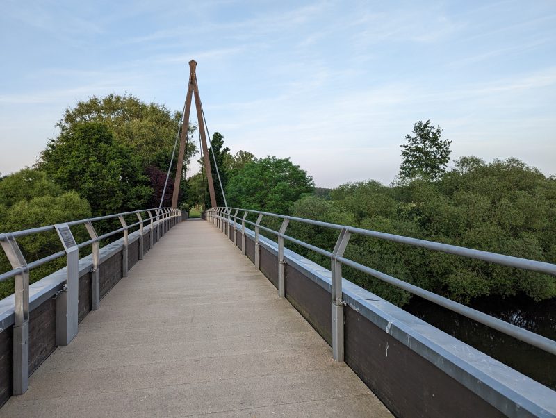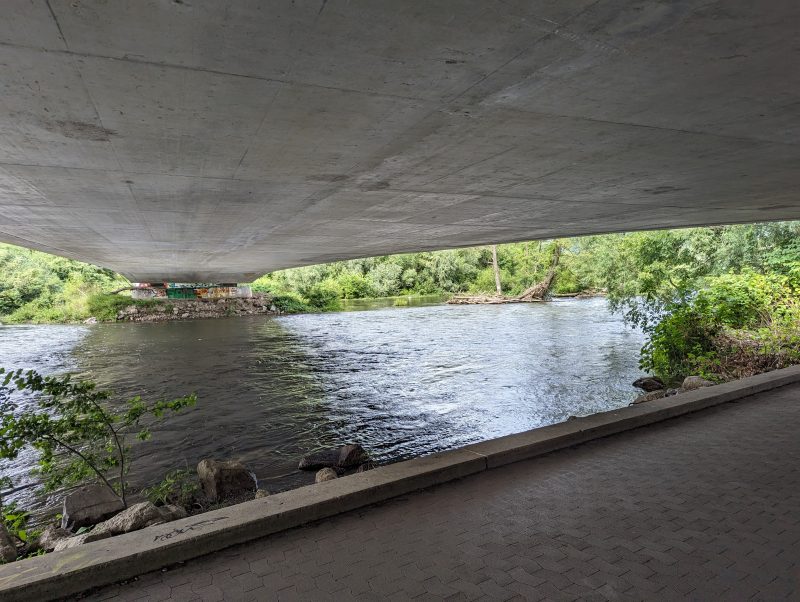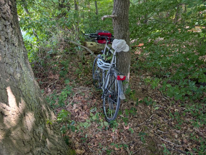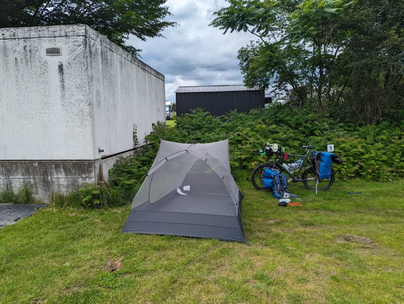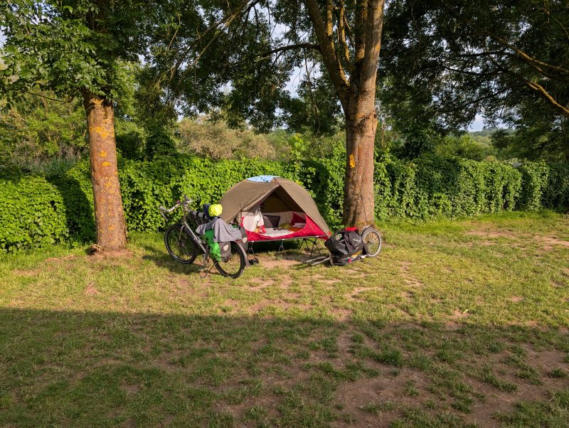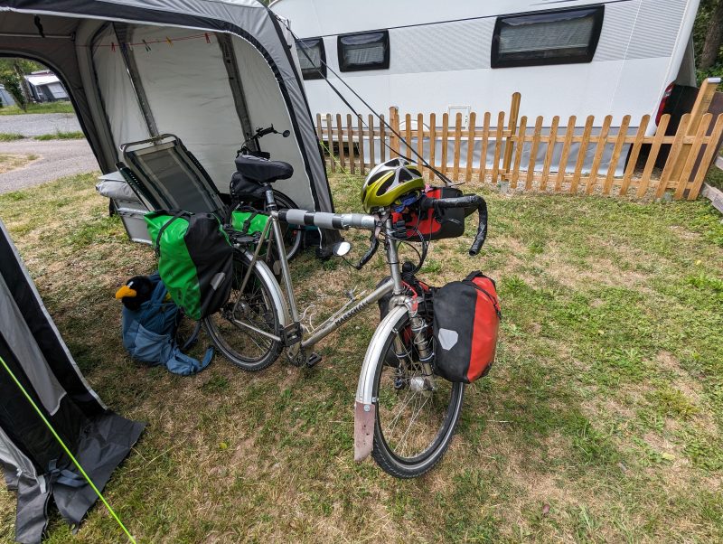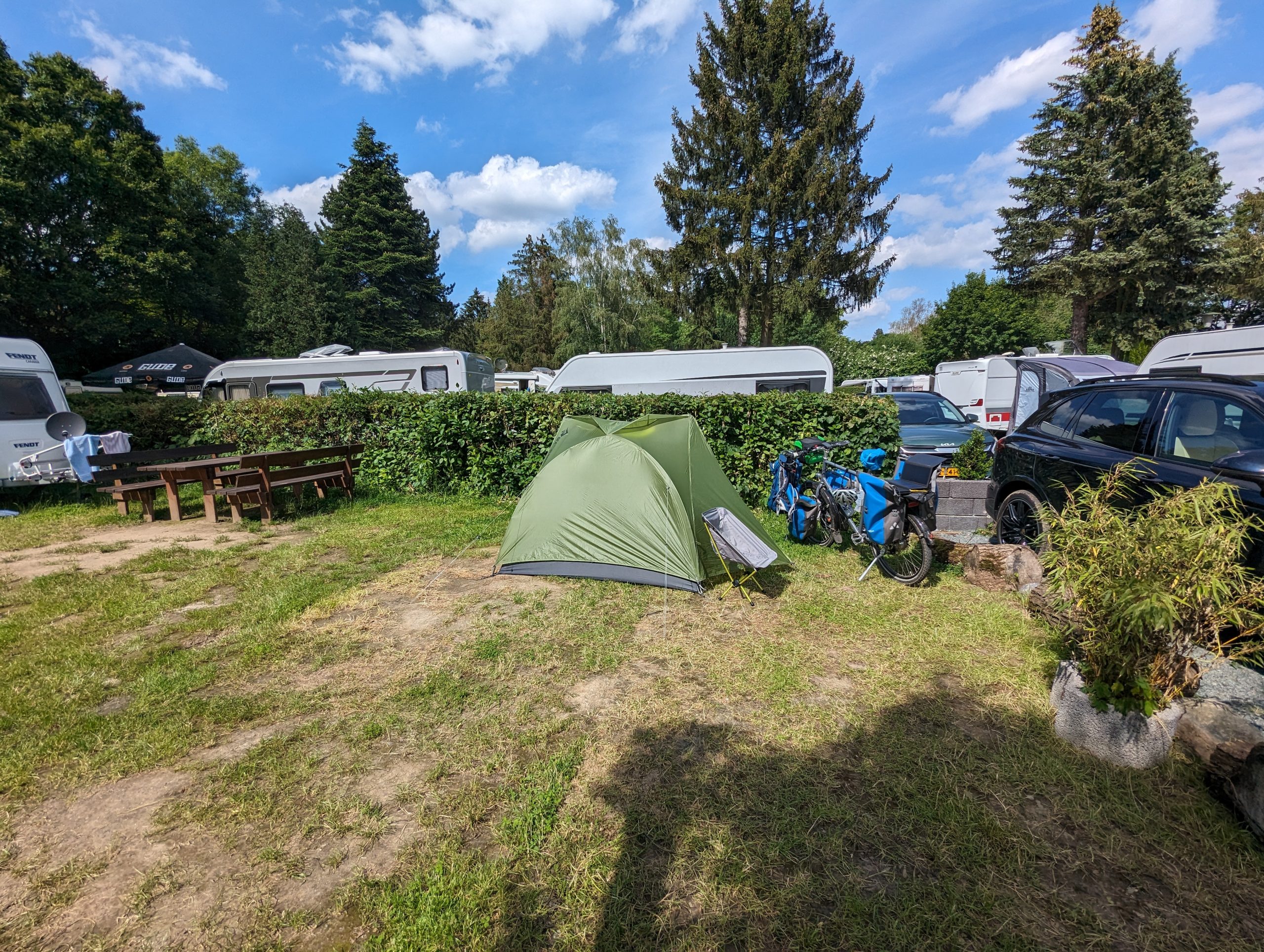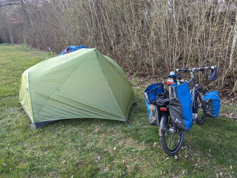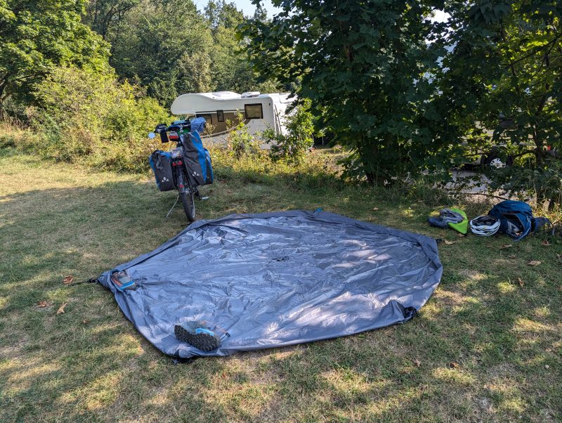Die Ausrüstungsvariante mit großem (SeaToSummit) Zelt und dem Patria Reiserad bewährt sich im Prinzip. Dennoch sind die zwei Nächte im Zelt nicht erhohlsam. Die Campingplätze waren nicht anders auswählbar, wenn Tourenlängen von 80 km die Planvorgaben darstellen. Beide waren laut wegen Verkehrslärm, die Jabra Elite 75 Sport Ohrhörer haben das zwar dämpfen können, aber schlafen auf der Seite ist mit den Dingern nicht möglich.