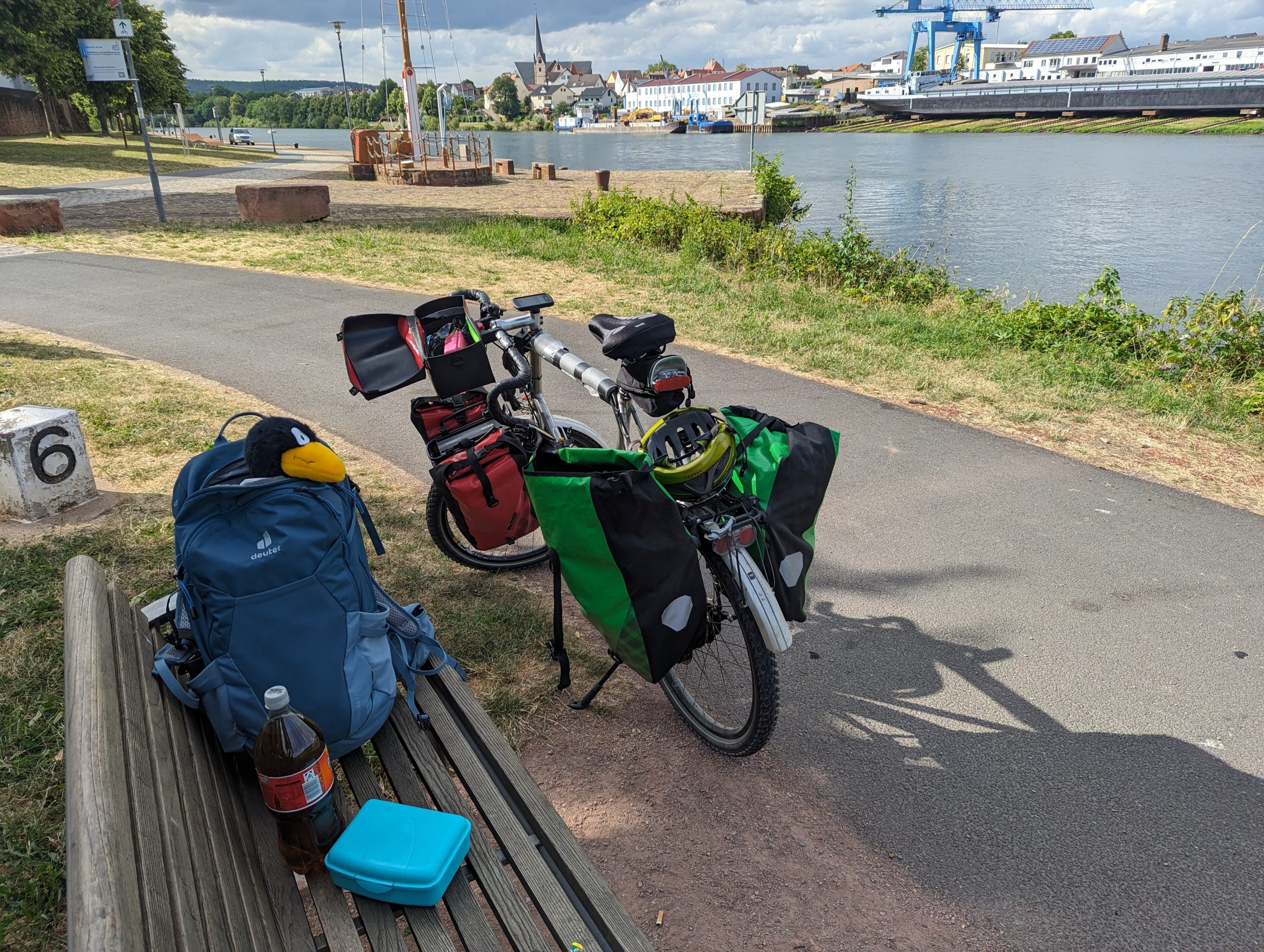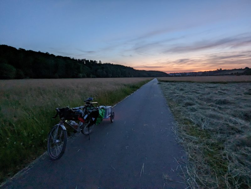 Die Strecke war bis Camberg (bergab) schön, dann anstrengend, dann nach dem dritten und vierten Tal hat es gereicht. Es war aber am Wegesrand kein Plätzchen für meine Liege zu finden. Immer Dorf oder Stadtnähe und Gassigänger, Militärgebiet. Ich habe dann am Radweg eine Bank gefunden und die Liege aufgebaut. Schlafen mit der Jysk Isomatte und dem Biwaksack war ok, die Beschallung vom Dorffest ging dann von 10.30 bis 2.30. Ich habe dann um 2.00 zusammengepackt und bin im Dunkeln wieder los. Der Morgen lief zäh, aber die Strecke bis zum Main war gut zu fahren. Die bekannte Strecke am Main bis Miltenberg will man einfach nur noch hinter sich bringen. Das Rad wurde immer schwerer.