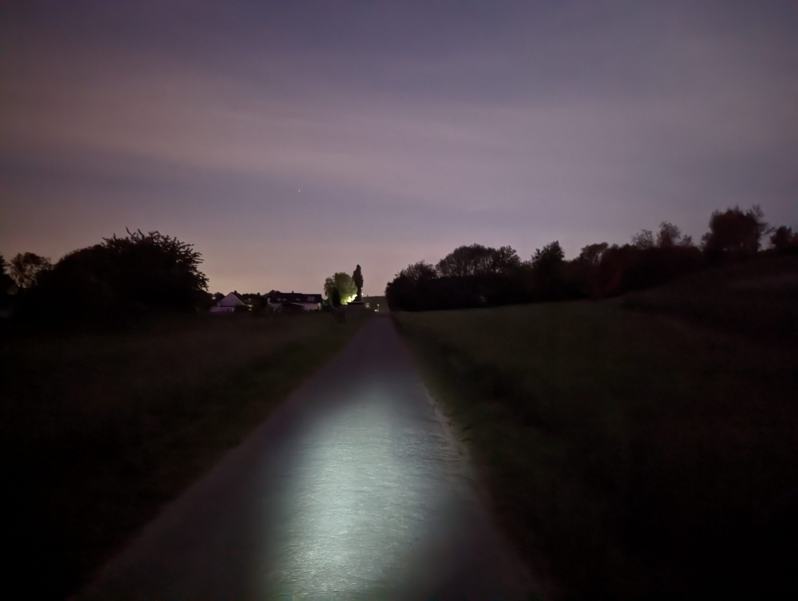 Der Pendix wurde auf dem Hinweg in Stufe 1 mit 15 Nm betrieben, nur bei steilen Anstiegen kurz mit 25 Nm. Der erste Akku hielt durch den Westerwald bis Herborn, knapp 60 Kilometer mit 600 Höhenmeter. Der zweite Akku war nach 50 km leer, der letzte wurde dann Abends im Finstern höher belastet. Mit dem alten Ladegerät konnten die drei Akkus bis zum nächsten Morgen nicht vollständig aufgeladen werden. In der Nacht mussten die Akkus getauscht werden.
