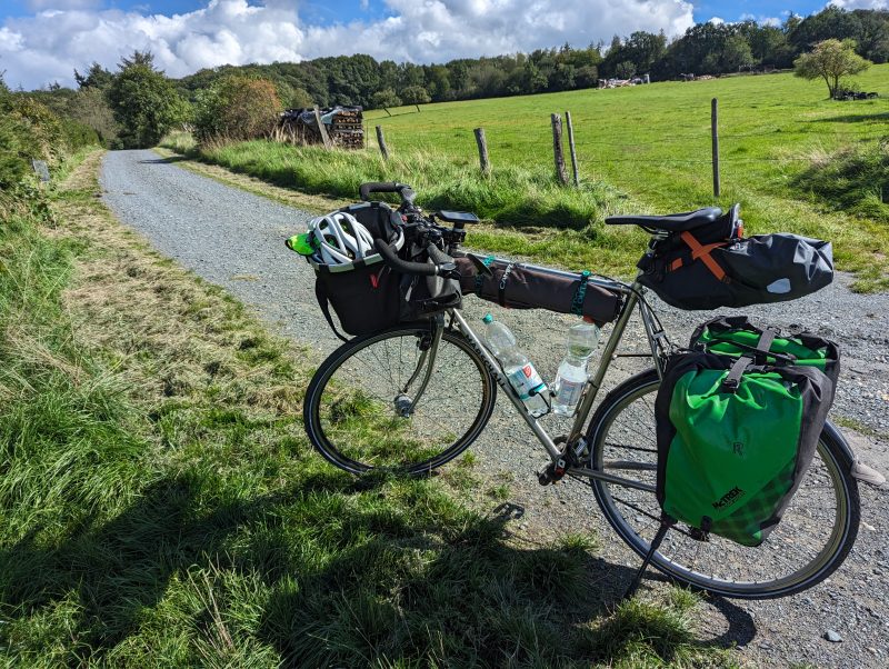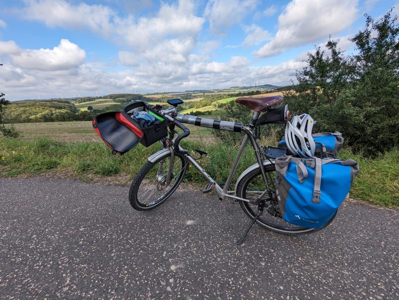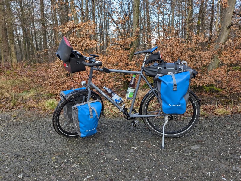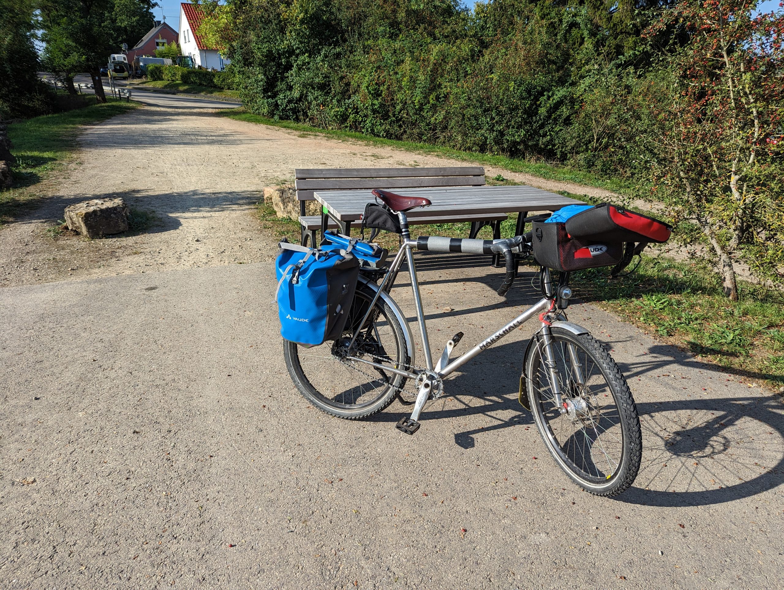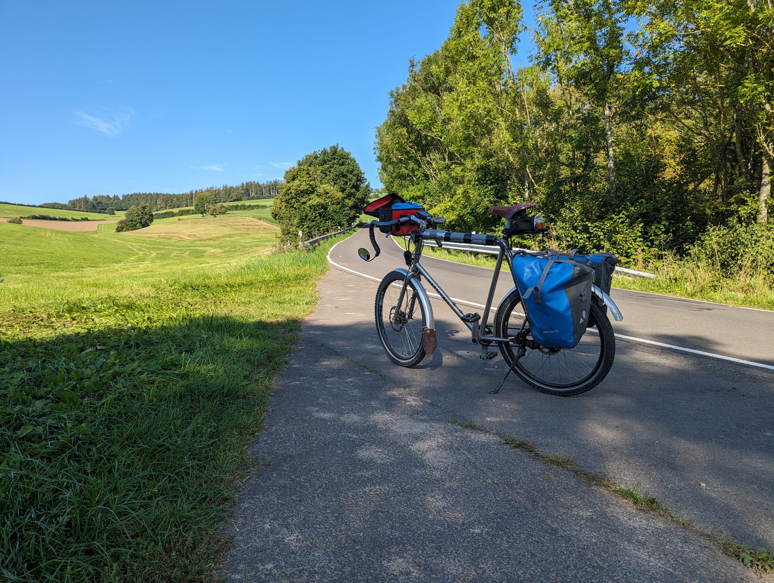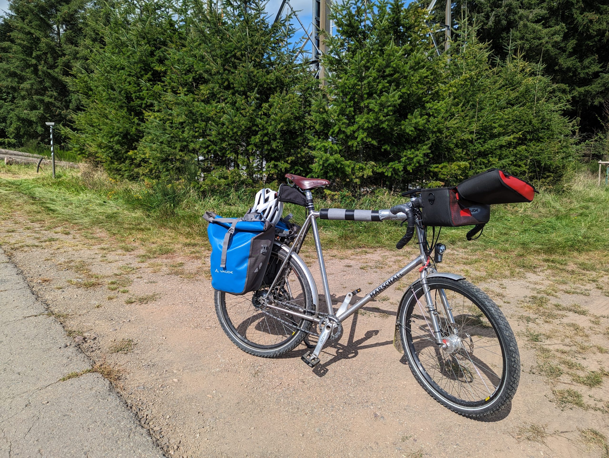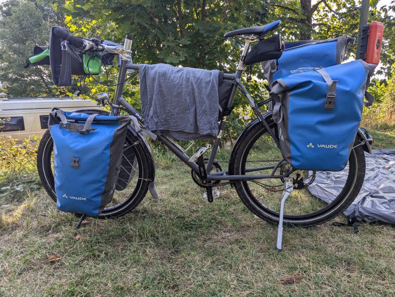 Das Rad hat mit der Campingausrüstung, Verpflegung und 3 Liter Getränken in vier Gepäcktaschen und einem leichten Rucksack 45 kg auf die Straße gestellt. Immer noch schwer, aber das Fahrverhalten war ok. Die Übersetzung erlaubte Steigungen bis 8%, darüber wurde wegen Muskulaturüberlastung auch mal ein längeres Stück geschoben.
