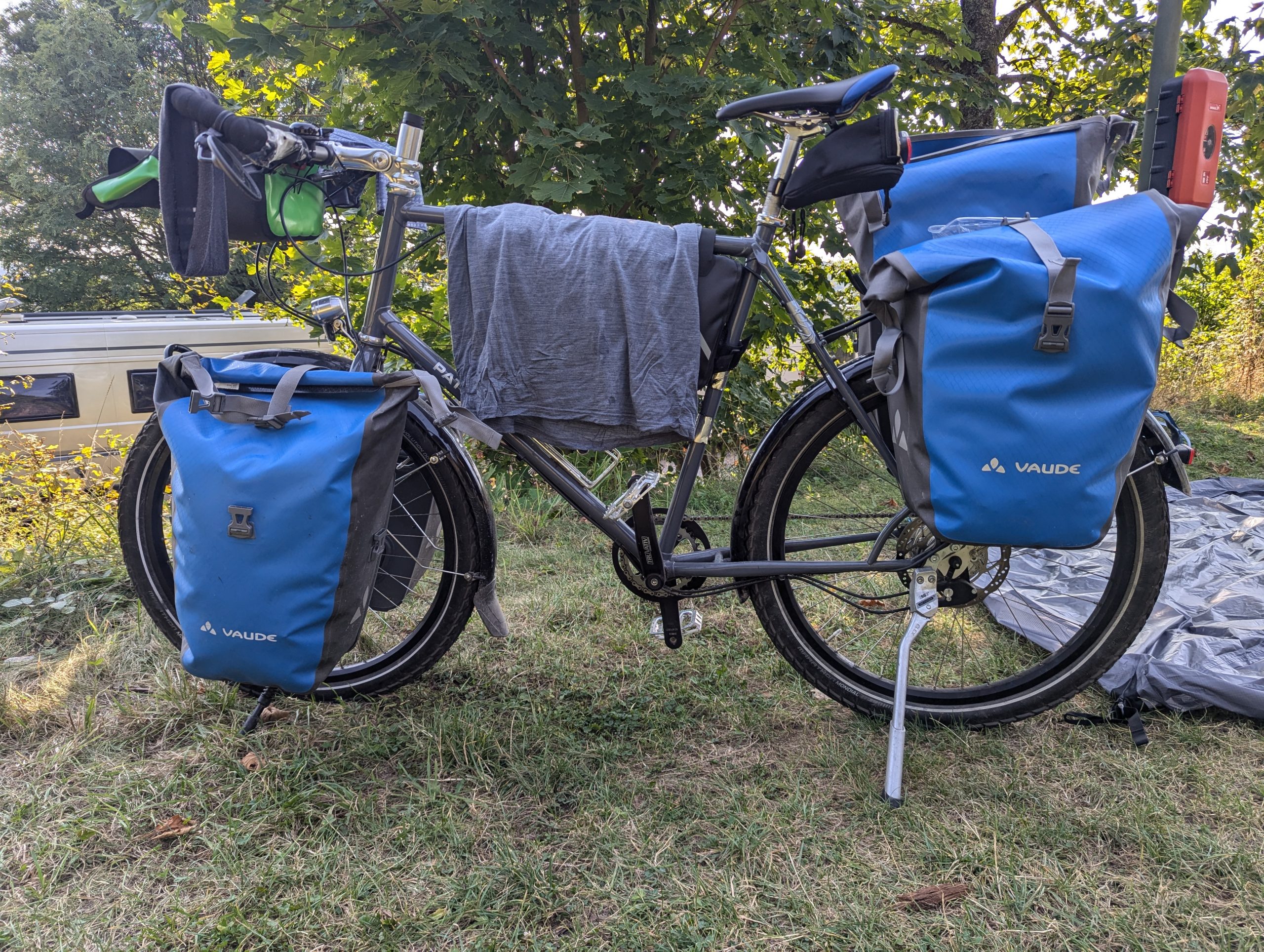 Die Merinowollene Bekleidung hat sich bewährt. Das Systemgewicht von 47 kg mit vier Packtaschen war bei der Tourlänge nicht zu belastend, die 10 kg weniger im Vergleich zur Anhängervariante waren angenehm spürbar.