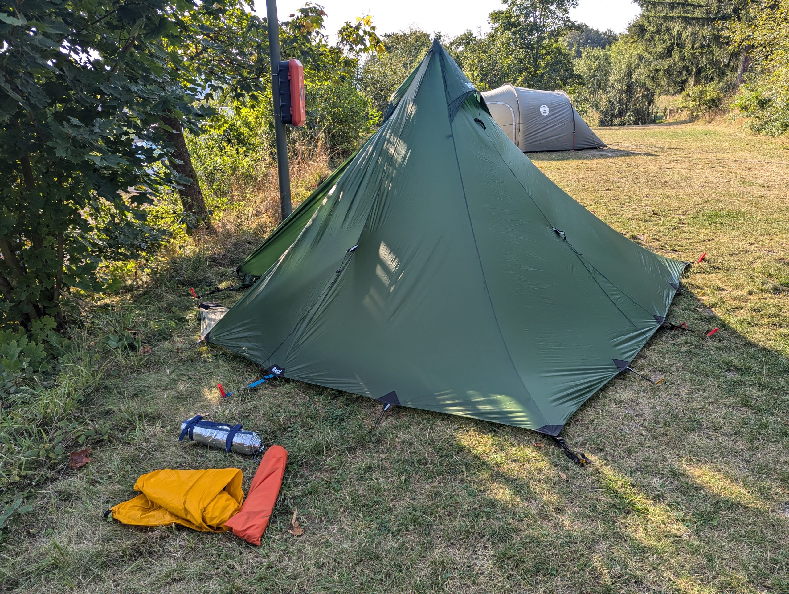 Das Tipi stand heute schon schneller, mit der Methode erst das Innenzelt auszulegen und zu fixieren, die Zeltstange aufzustellen und dann erst das Überzelt zu befestigen hat es gut funktioniert. Die Zeltunterlage passt definitiv für eine neue Version des Wickiup 3, sie wurde aber trotzdem zum Schutz untergezogen, ohne sie zu befestigen.