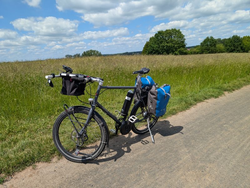 Ansonsten Tagesgepäck und Verpflegung für den ganzen Tag um nicht unterwegs auftanken zu müssen. Da die bisherige Erfahrung für einen 500 Wh Akku 60 bis 80 Kilometer Unterstützungsleistung bei hügeligem Gelände ergeben hat, sollte diesmal mit nur 5 statt 10 Nm in der ersten Unterstützungsstufe die maximale Reichweite ermittelt werden.