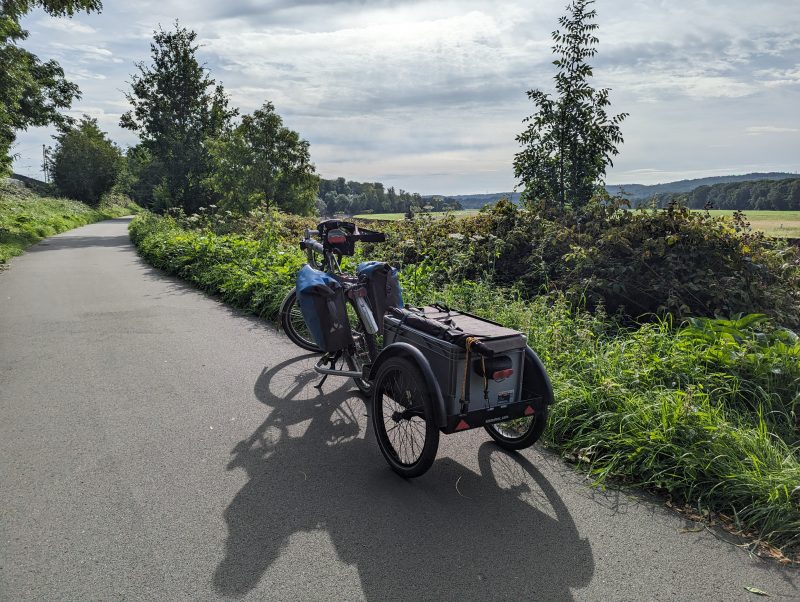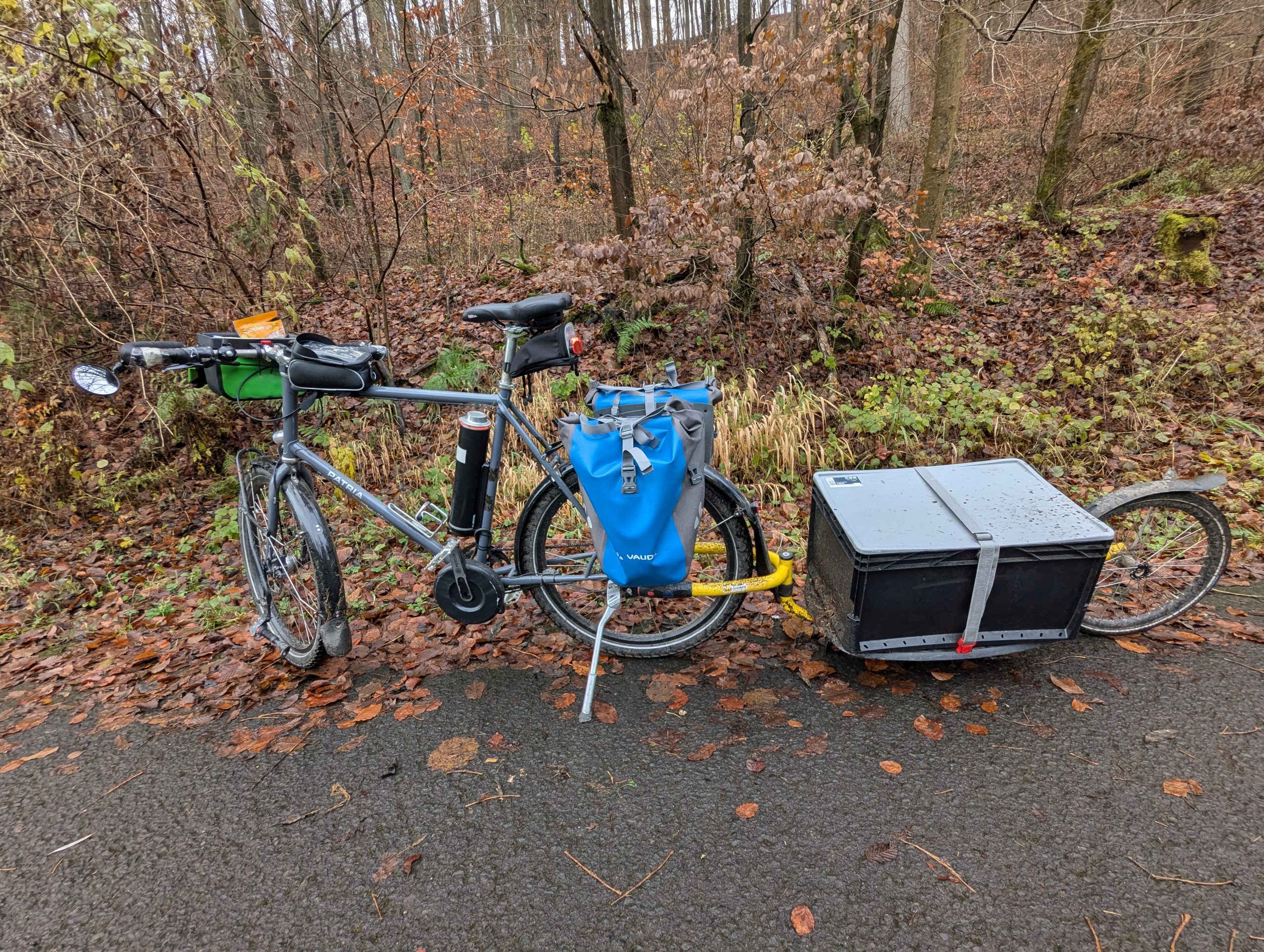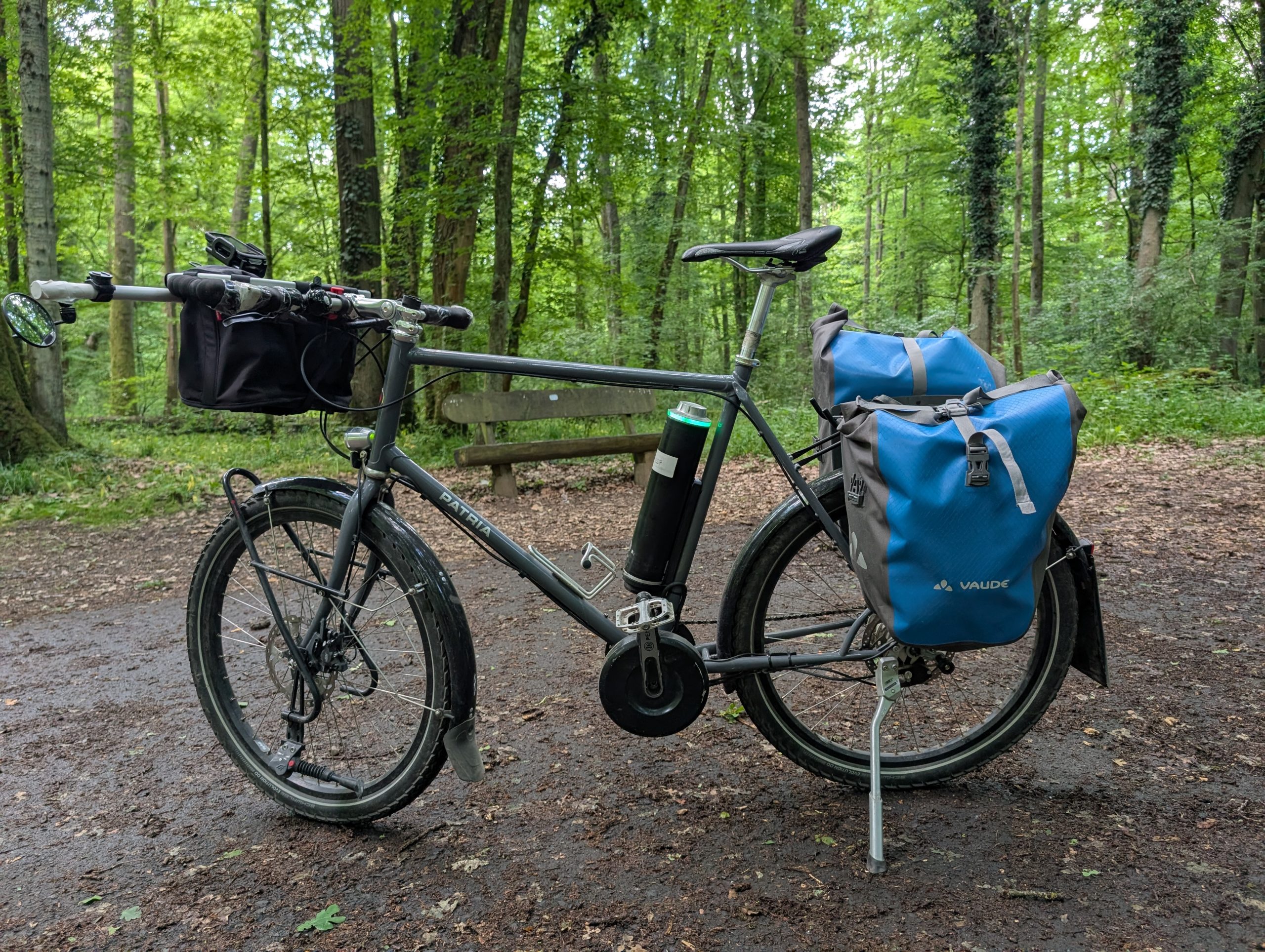 Jetzt sollte es an einem Tag von Kunidorf nach Dortmund zu Kunibertes Elternhaus gehen. Dem Kräfteverlust entsprechend mit dem alten MTB mit Pendix Antrieb und zwei 500 Wh und einem 300 Wh Akku. Damit waren die Gepäcktaschen gut gefüllt und das Rad bleischwer wie für eine mehrtägige Urlaubsreise gepackt.