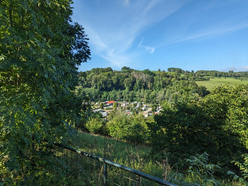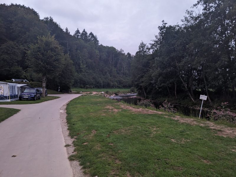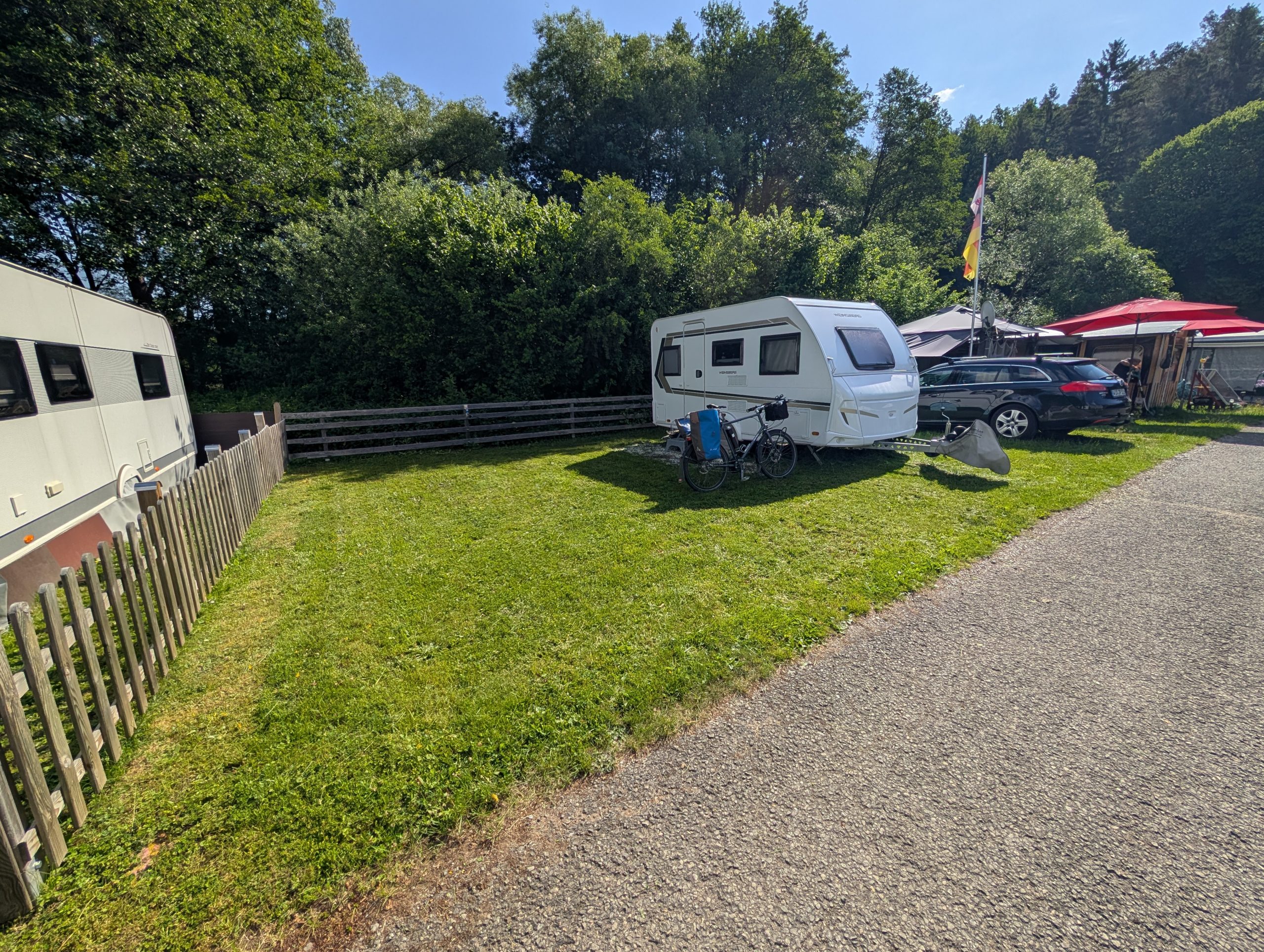 Der nächste Campingplatz, der auf der eigentlich geplanten Radreise ausgewählt wurde, ist der Waldcampingplatz Hüttenhof. Dieser Platz ist im Gegensatz zum vorigen Platz ein Ganzjahresplatz mit vielen Dauerstellplätzen. Von Touristen wird er wohl eher weniger besucht und somit auch von seiner Infrastruktur her ein starker Kontrast zum Campingplatz Schwabenmühle im Vorbachtal. Die Zufahrt erfolgt über eine sehr enge Straße. Landschaftlich liegt der Platz aber sehr schön und ruhig.