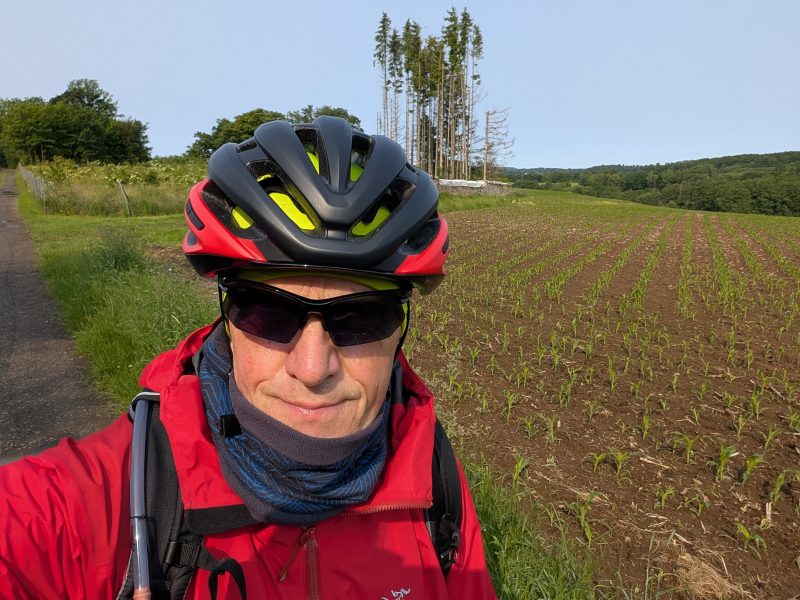 Der leichte Rucksack war ok, der leichte Helm und die bifolkale leicht getönte Brille gut zu ertragen. Der Ponch war bei dem warmen Wetter super praktisch, der Anblick der sich in Regenhaut hüllender Radfahrer erhöhte noch das luftige Fledermausflügelgefühl.