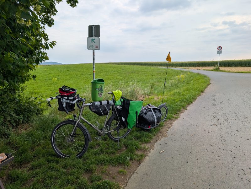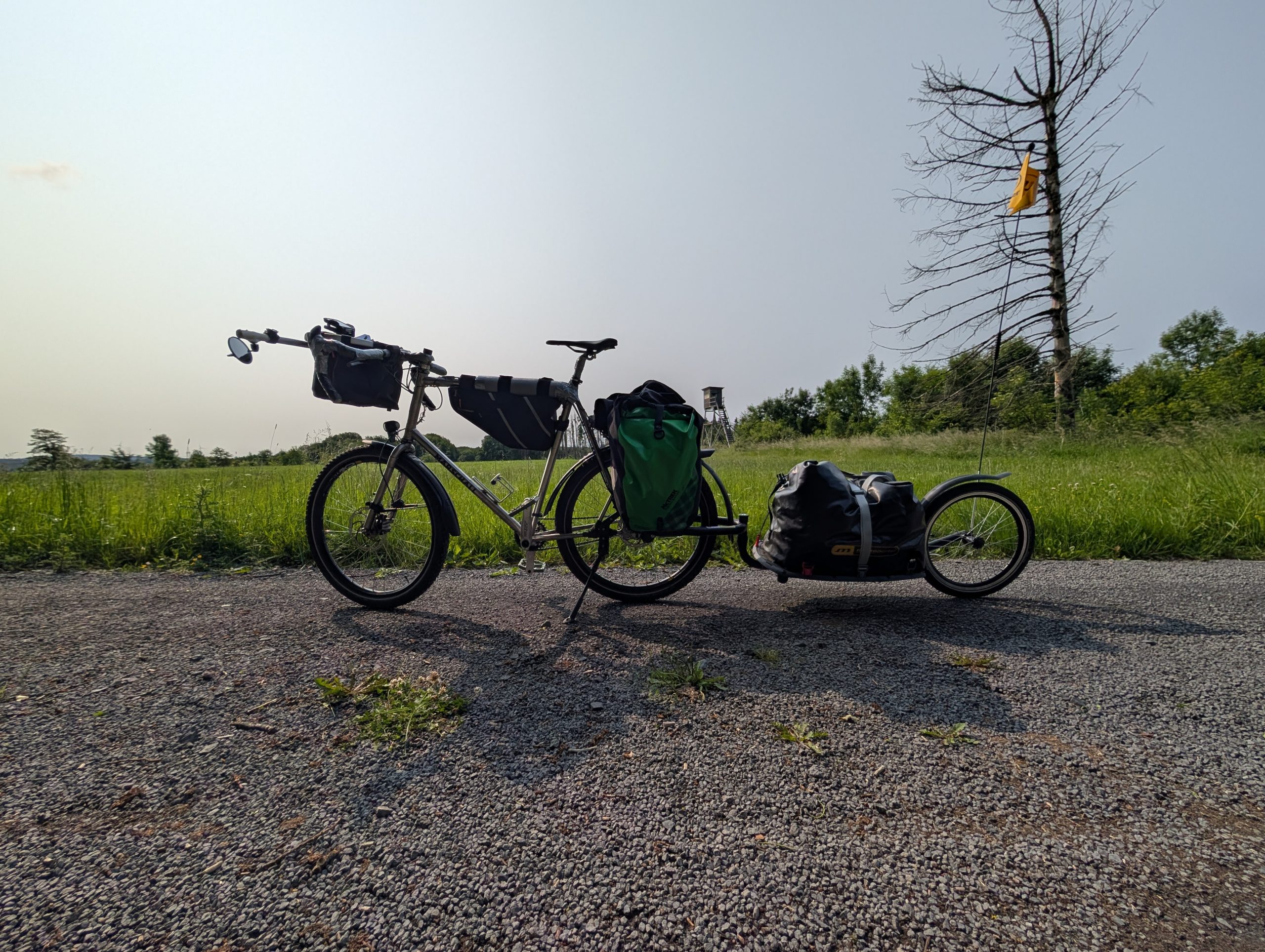 Es sollte ein letzter Versuch mit neuer Ausrüstung und altem Rad werden. Nicht leicht, nicht superschwer wie der Fahrradanhäger mit Schlafaufsatz. Aber doch komfortabel ohne Krabbeln im Schlamm. Geplant war eine 5 Etappen Tour von Kunidorf durch den Vogelsberg bis nach Kirchzell.
