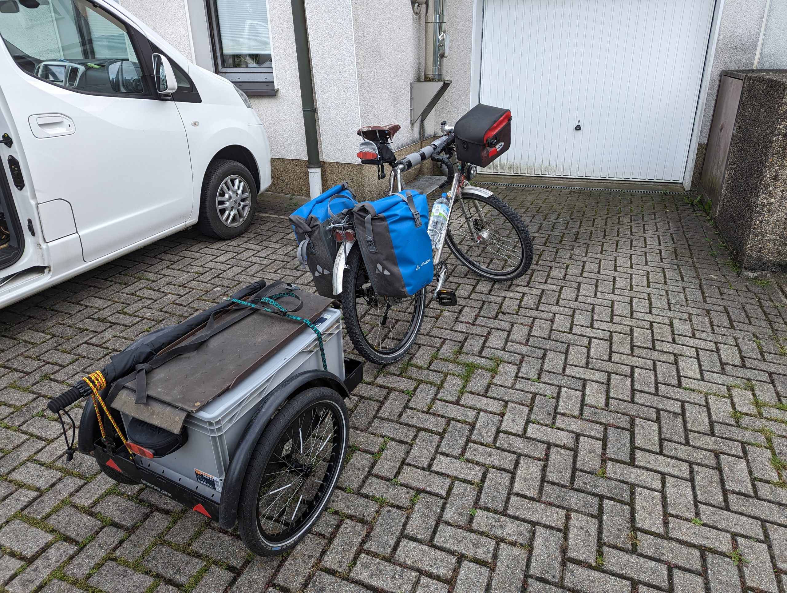 In diesem Urlaub haben wir zwei Fahrräder dabei, die auf der Fahrt im Wohnwagen transportiert werden. Dazu wurde der Puck wieder einmal umgebaut. Der notwendige Fahrradträger befindet dich bei der Wohnwagenfahrt im Auto. Bei den mitgeführten Rädern handelt es sich um ein Gravelbike und das Viwax-E-Bike von Kunigunde.
