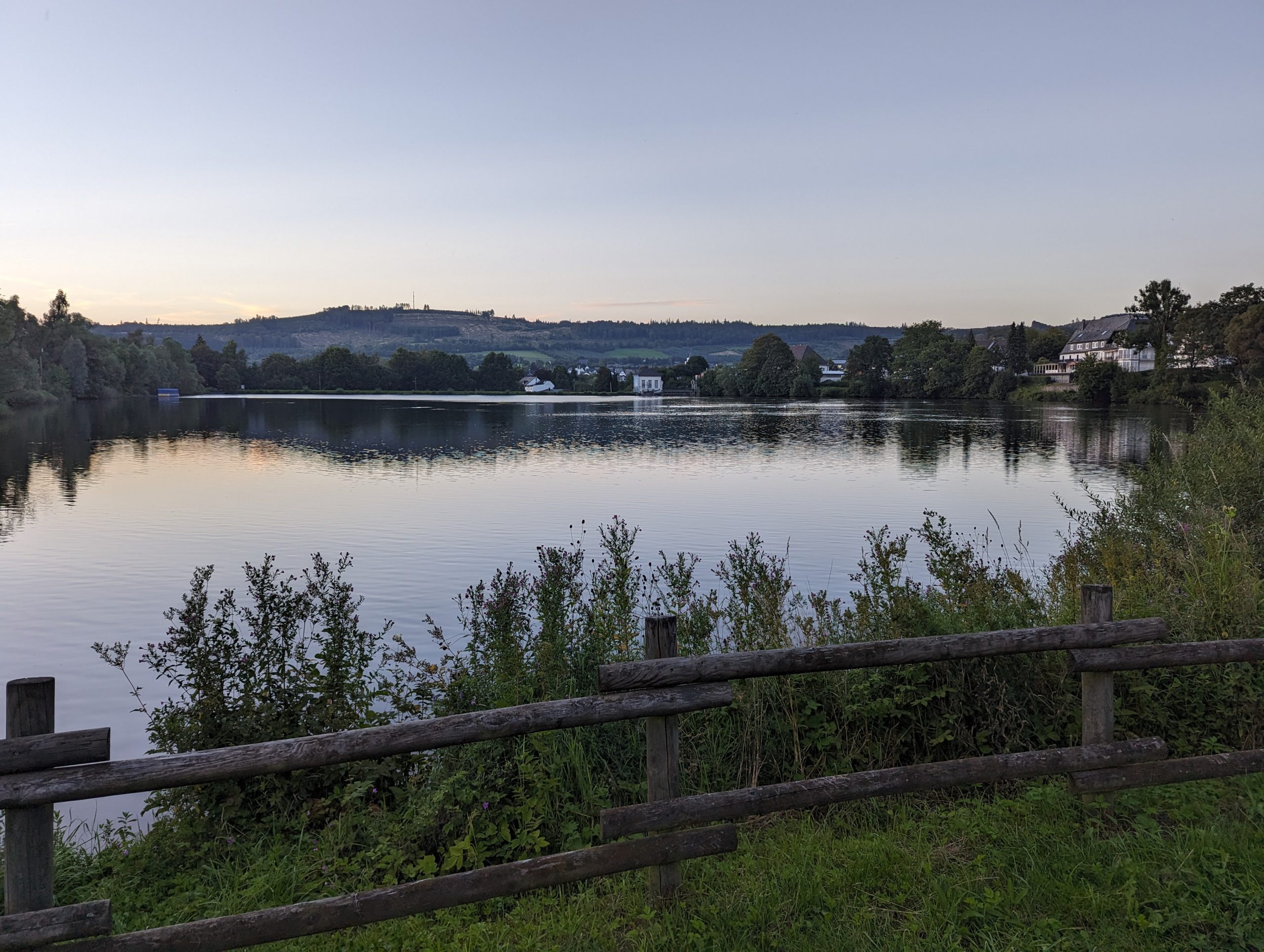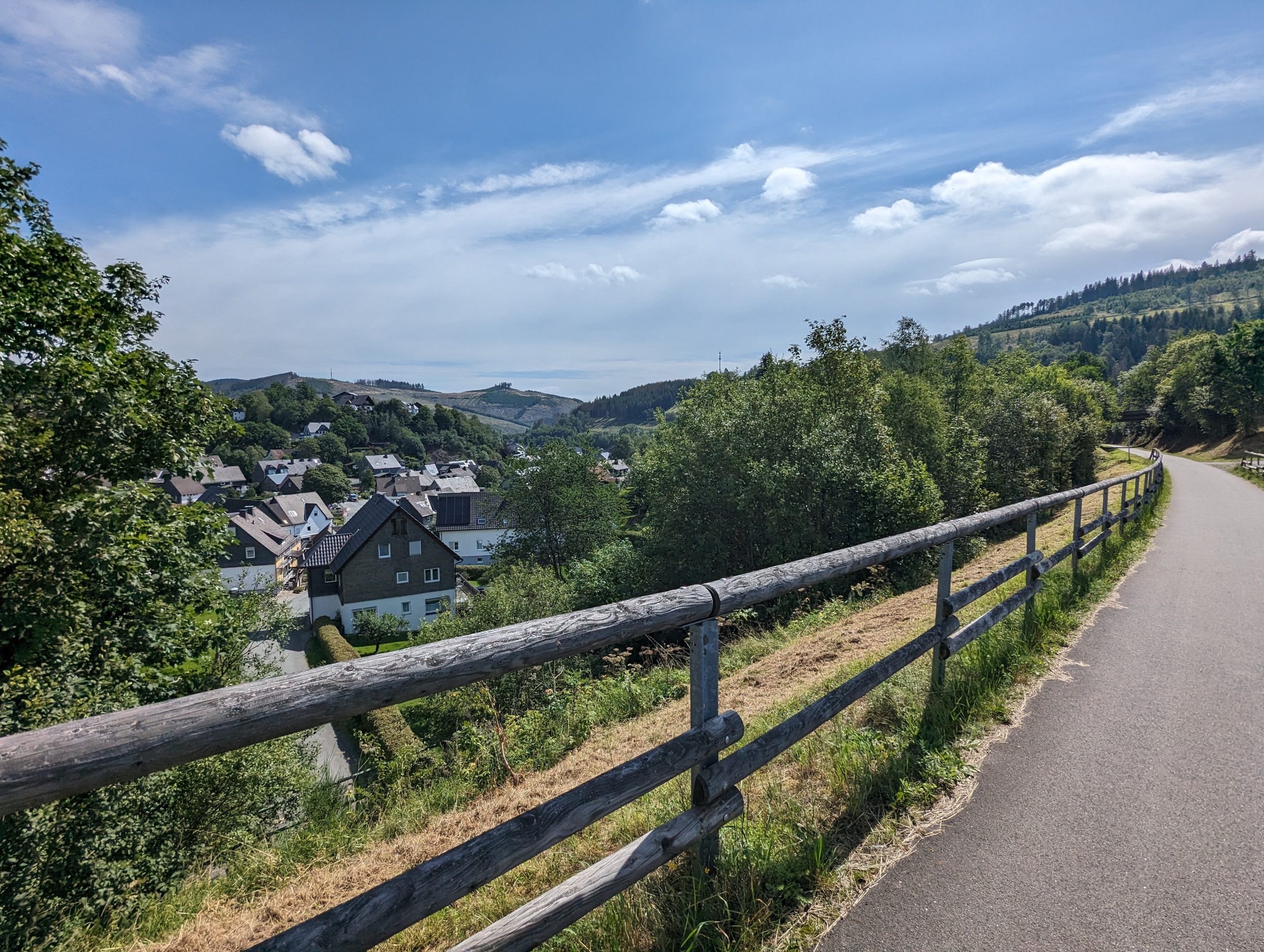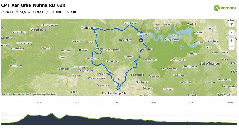 Der Dienstag beginnt mit einem Bäckerlauf nach Onkel Hermann im Schmittlotheim. Daher beginnt die Tour auch erst gegen zehn. Erst ein Stück die B252 an Herzhausen vorbei in ein Seitental hoch nach Immighausen. Ein Waldwanderweg, aber gut fahrbar. Auf der Höhe kommt dann auch mal die Sonne hervor und die Aussicht ist herrlich. Über die wenig befahrene Kreisstraße 52 geht es nach Goddelsheim und erst hügelig und dann bergab auf einem Teerweg ins Aartal. Leider ist der Radweg an dieser Stelle wegen Wegebauarbeiten durch einen Baumstamm versperrt. Die einizige Alternative in dieser Grenzregion ist der Aufstieg Richtung Medebach um dann im Medebachtal das Orketal zu erreichen. Eigentlich sollte in Münden das Orketal nur kurz gequert werden. Der Anstieg über die K49 und einen schotterigen Wald- und Wiesenweg mit Abfahrt über Ölfe zur Nuhne zog sich bei schwindendem Licht und schlechten ruppigen Wegverhältnissen. Zum Glück ging es dann im Edertal auf dem Radweg wieder zügig zurück zum Campingplatz.