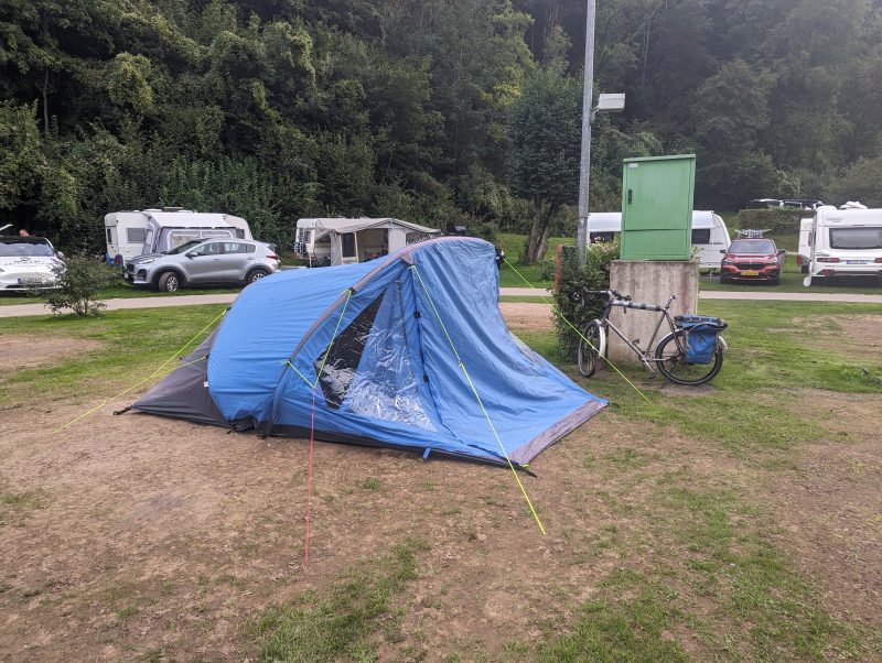 Also den Pendix Antrieb wieder abgebaut und für 2 relative warme und trockene Tage einen Versuch mit der antriebslosen Variante ohne Anhänger mit dem neuen 2 Personenzelt geplant uns umgesetzt. Der schon bekannte Campingplatz Schinderhannes in Hausbay im Hunsrück war ein geeignetes Ziel. Stecke 85 Kilometer mit 1000 hm und ein Checkin-Automat garantieren einen sicheren Platz zum Übernachten, wann immer man ankommt.
